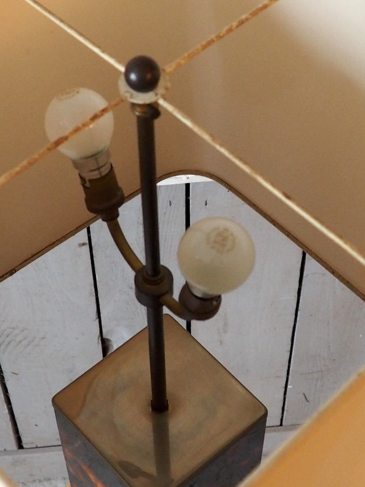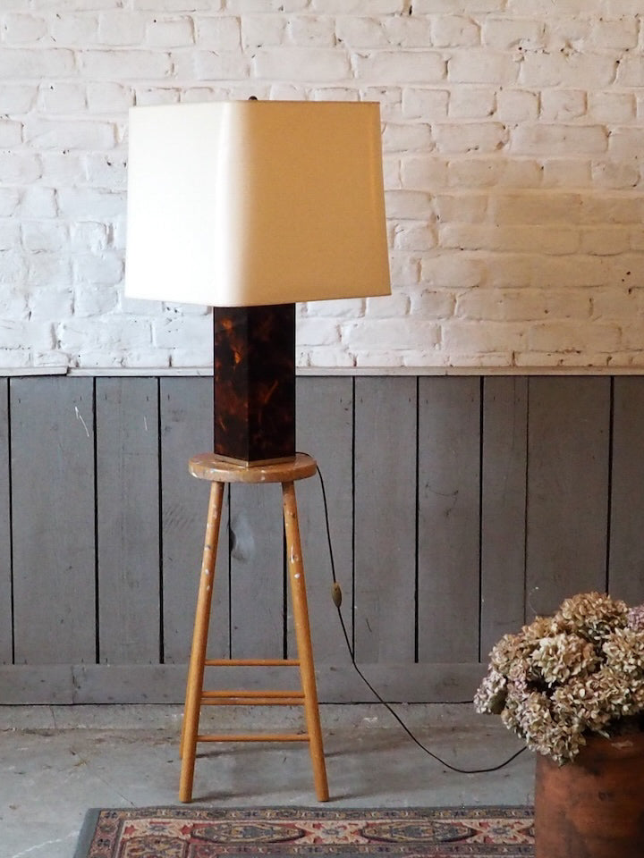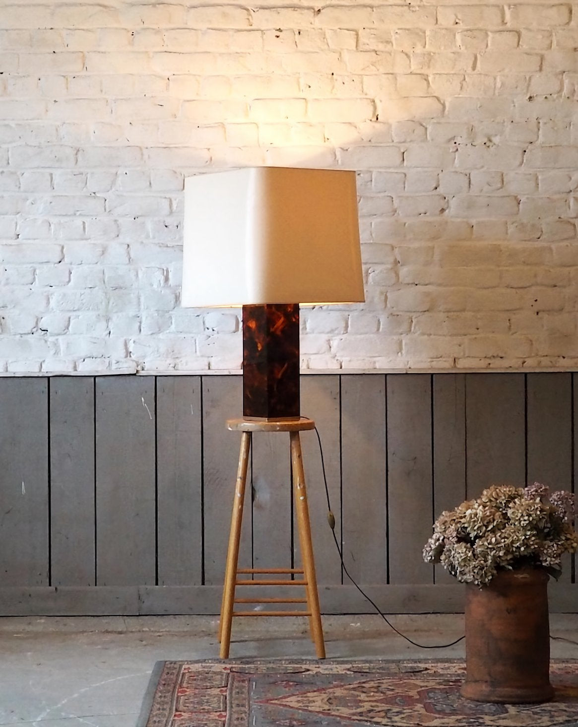 Embrace this lamp with its tortoiseshell-effect plexiglass base, which blends modern design with vintage charm and captures light with elegance. Its lampshade diffuses a soft light, perfect for a bedside table, console, or reading nook, while its balanced proportions allow it to easily integrate into a variety of spaces. The transparent materials and warm tones create a cozy and sophisticated ambiance. (Lampshade damaged in one corner.)
