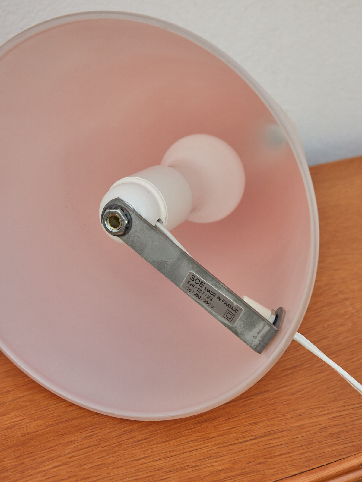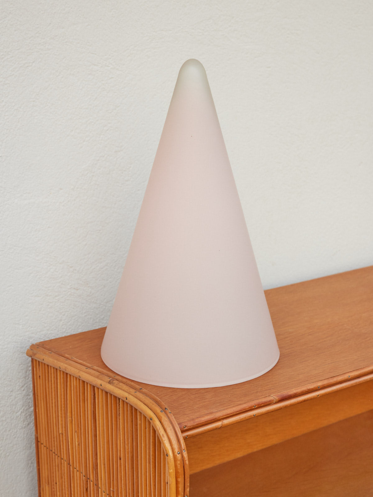 Elevate your interior with this Teepee table lamp in pink opaline glass, an emblem of the 80s. Its graphic silhouette and powdery hues diffuse a soft, enveloping light, ideal as a bedside lamp or as a discreet accent on a console table, thanks to its compact proportions that blend seamlessly into any setting. Perfect for creating a soft, ambient atmosphere in the evenings, it delicately highlights the surrounding materials and colors, adding a touch of vintage refinement to contemporary decor.