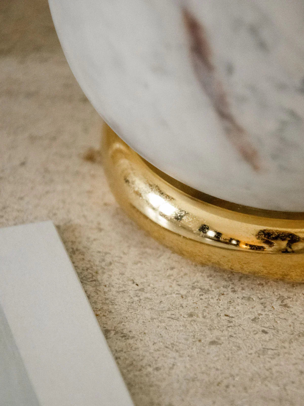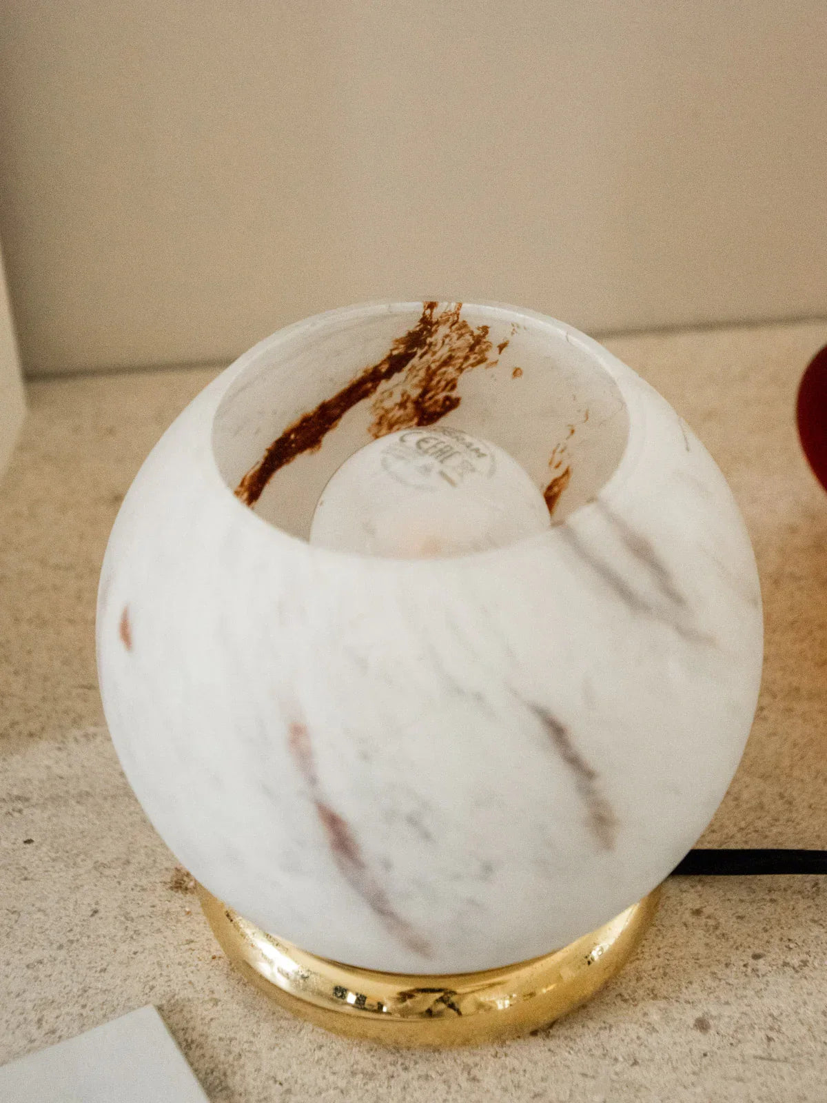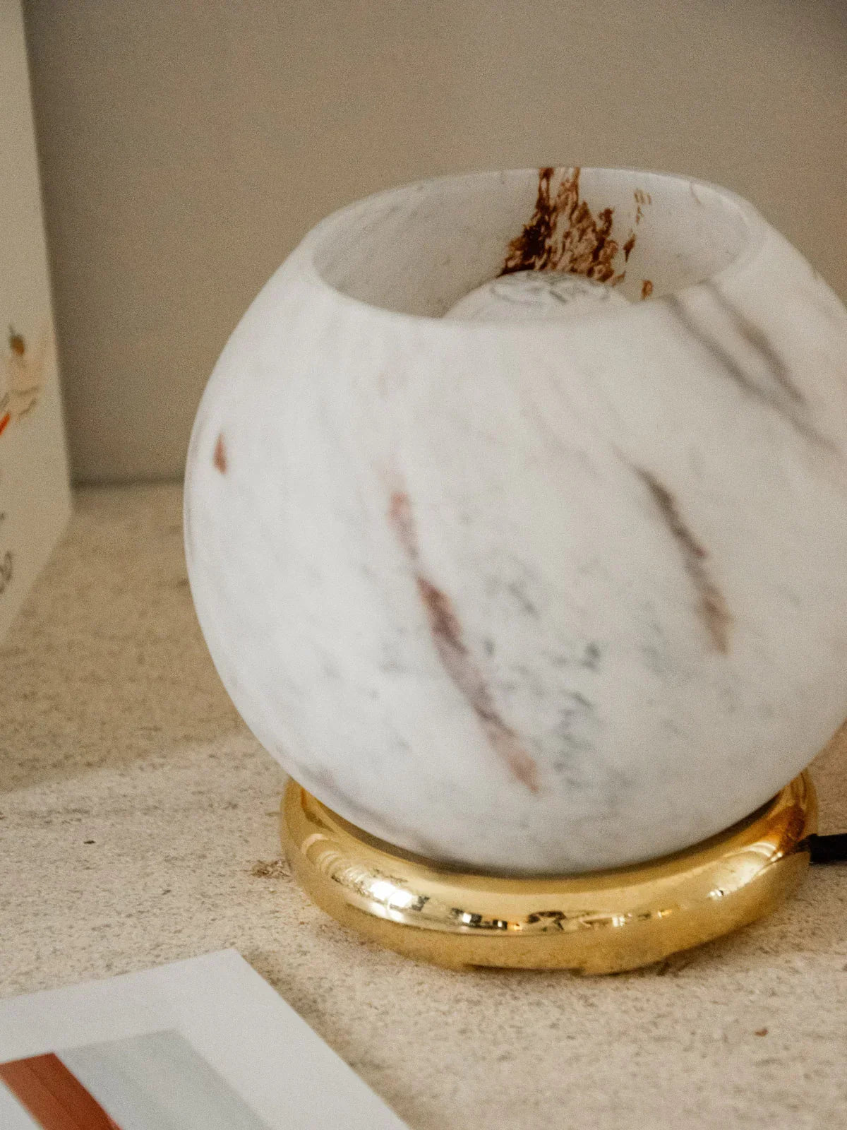 Add a touch of light with this small table lamp in marbled glass, paired with a gold-tone metal frame and a compact, round silhouette. Its soft, diffused light creates a warm atmosphere, perfect for a bedside table, console, or reading nook. The interplay of veins in the glass lends a subtle elegance and changes with the intensity of the light, while the gold finish adds a contemporary and refined touch.