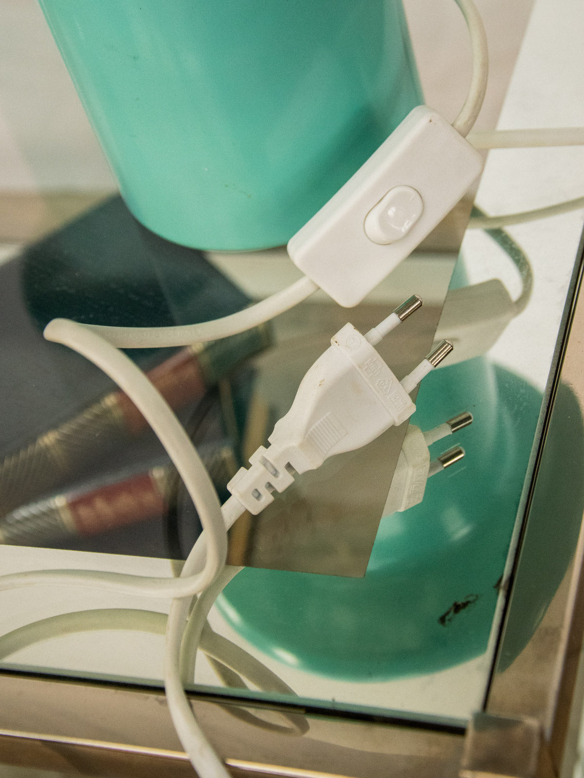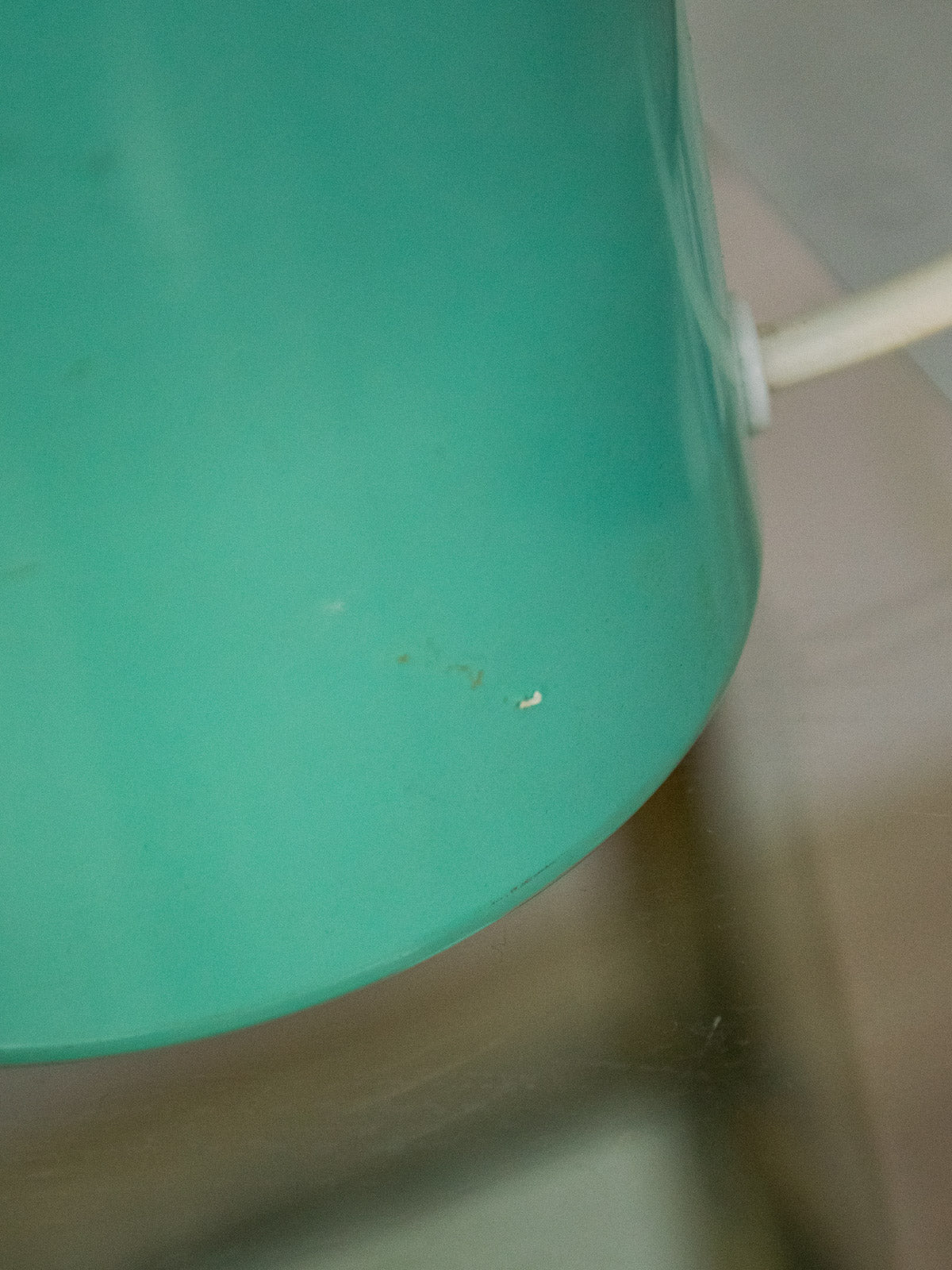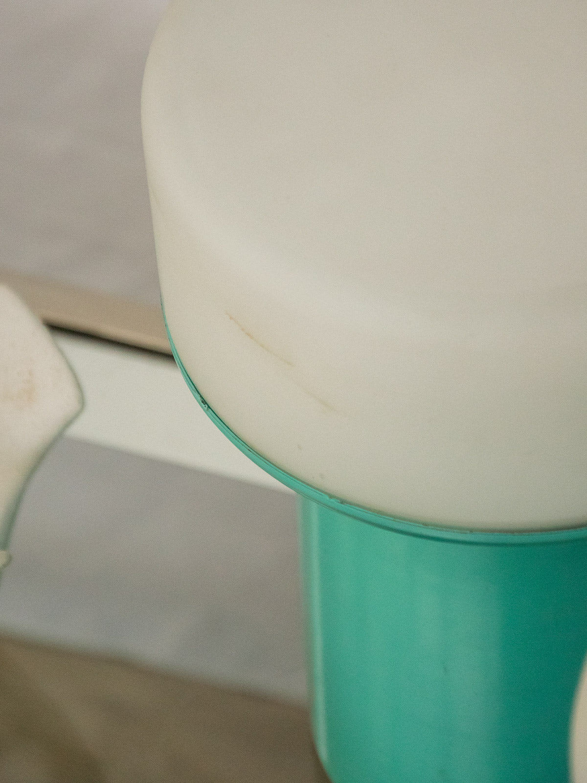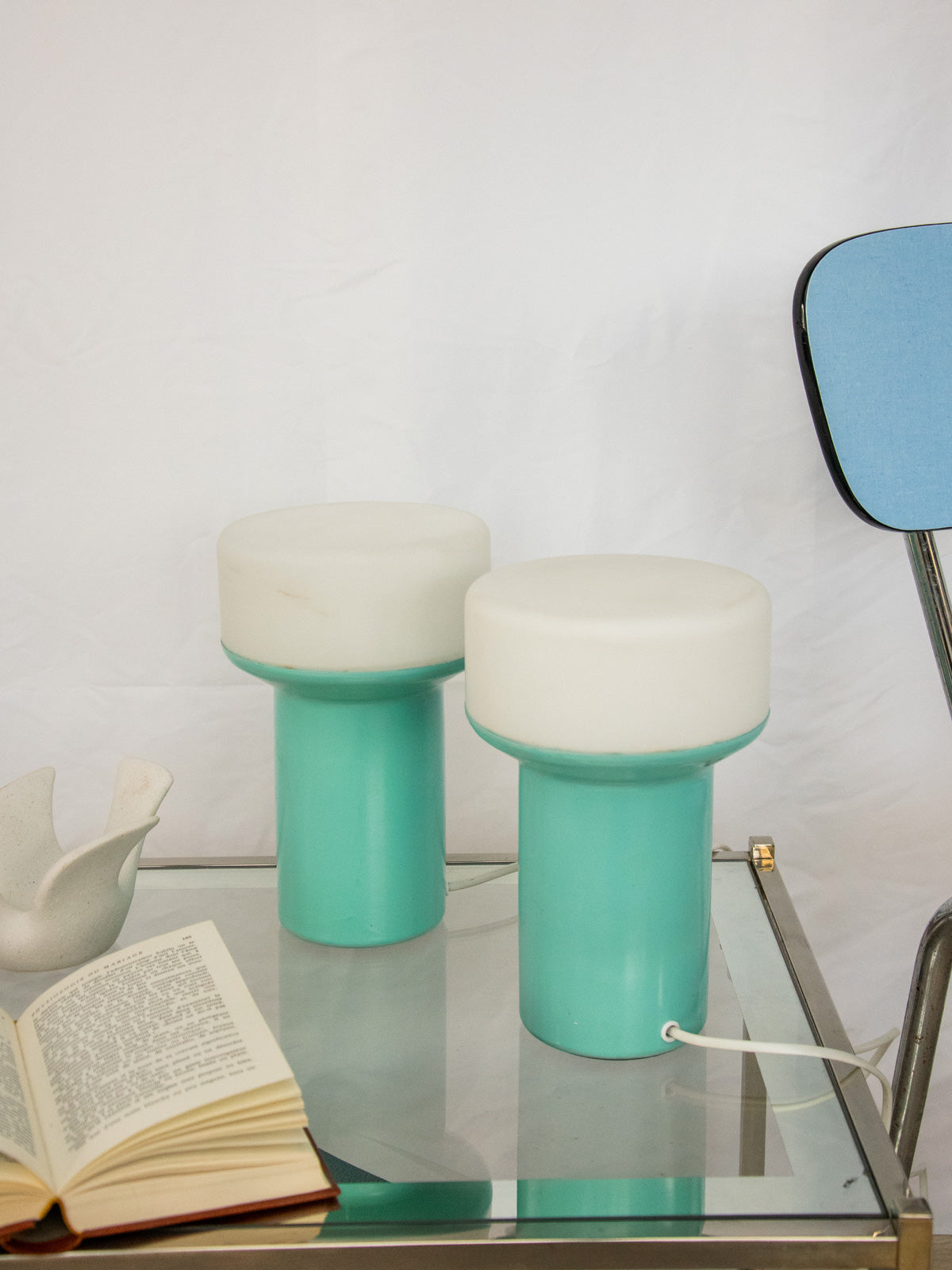 Enhance your interior with this vintage table lamp in harmonious shades of sky blue, turquoise, and white. Its compact size and graphic silhouette make it the perfect accent light for a bedside table, desk, or console. The colorful finishes add a retro and luminous touch, ideal for creating a soft and warm atmosphere. Sold individually, two available, in excellent condition with very slight signs of age.