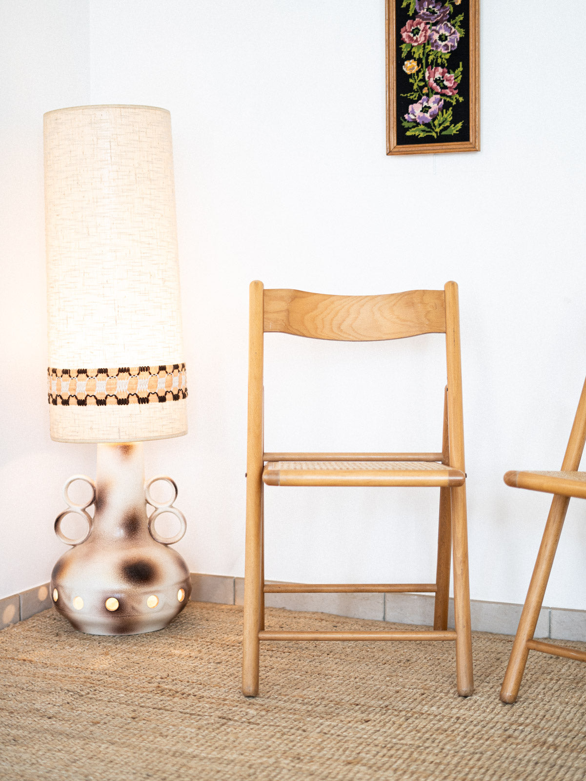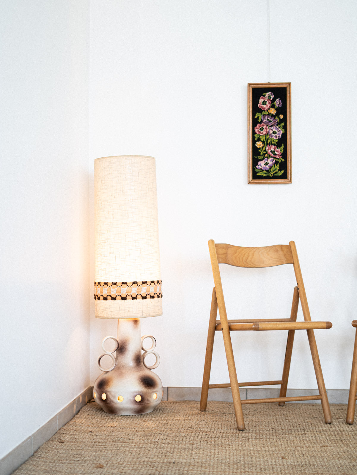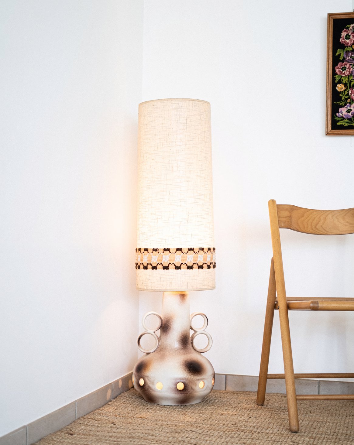 Elevate the style of your home with this glazed ceramic floor lamp, iconic to the 1970s and originating from West Germany. Its woven wool shade, adorned with a graphic band, diffuses a warm light while adding a retro touch to the decor. The unique design with a circular opening on the base allows light to pass through, creating a welcoming and artistic atmosphere. A true must-have for lovers of vintage design.