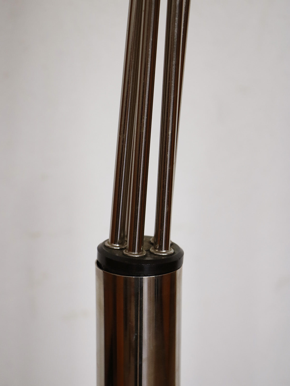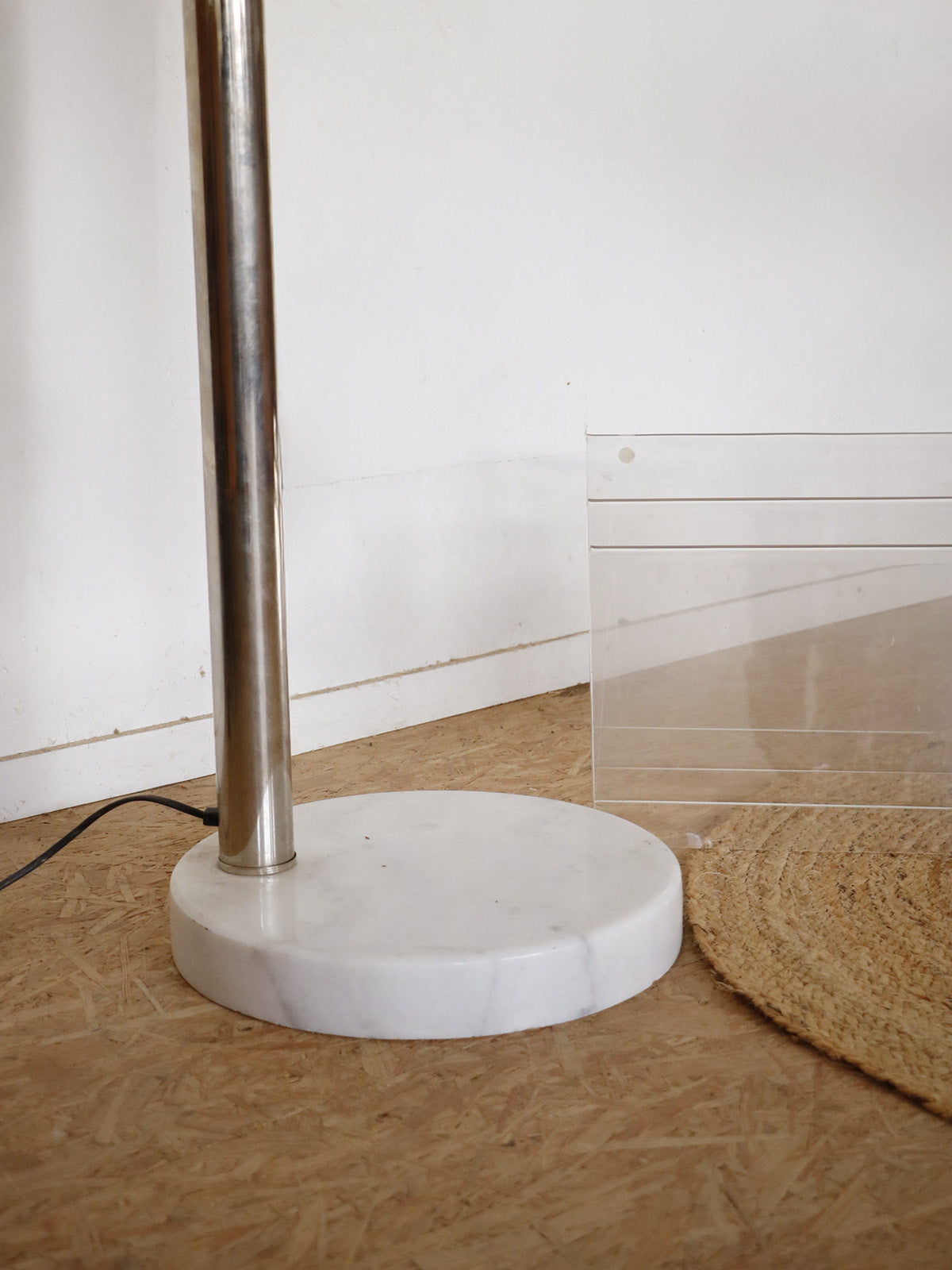Elevate your interior with this vintage chrome floor lamp in a lily-of-the-valley style, a creation by an Italian designer from the 70s-80s. Its five arms distribute light at different levels, offering a customizable ambiance perfect for a living room or a cozy reading nook. The heavy, marble-effect base ensures stability while adding a mineral touch that contrasts with the polished metal. Its chrome finish reflects the light and lends a retro-chic look.