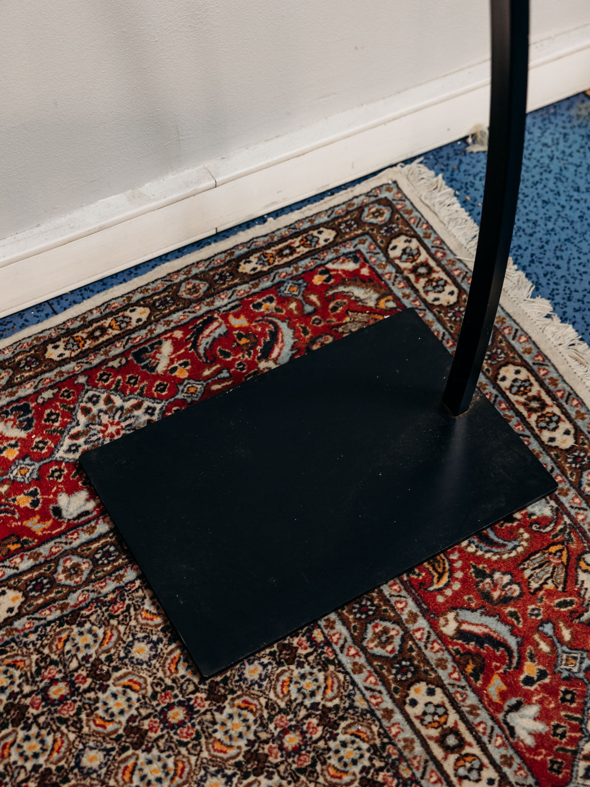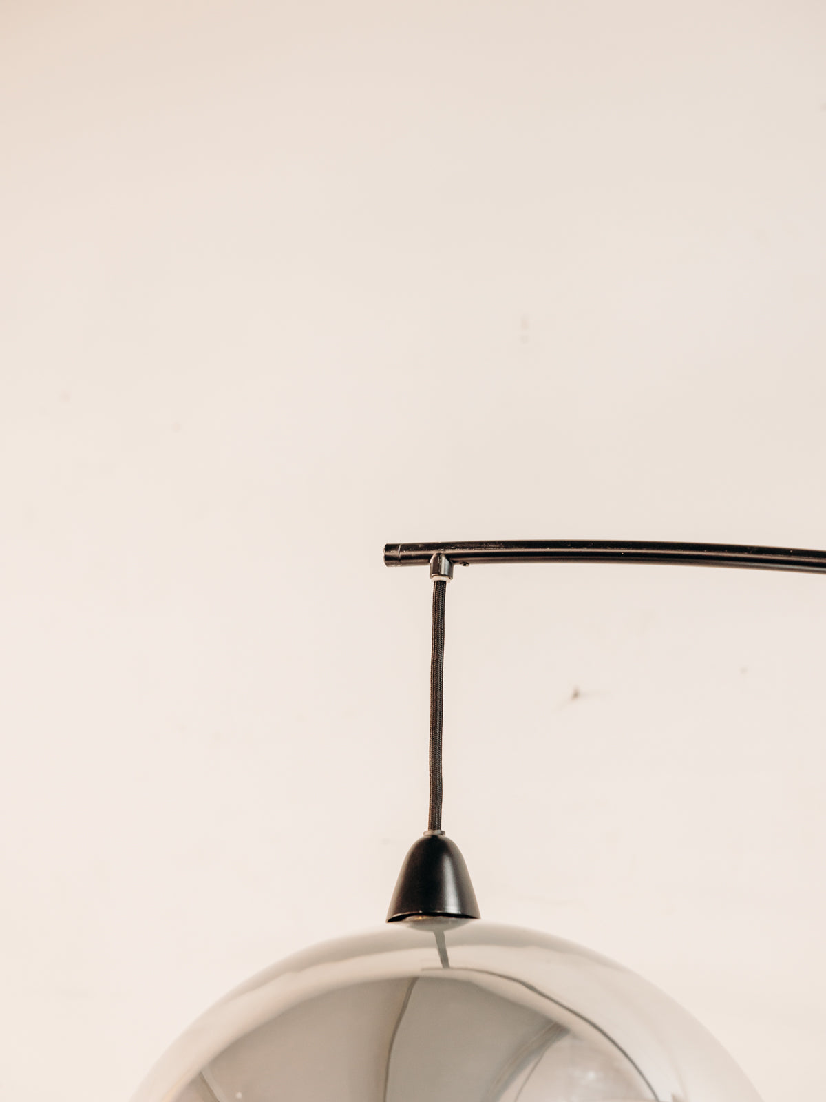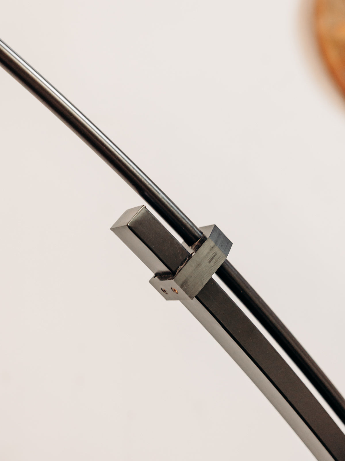 Invite this tall, curved floor lamp into your home. Its stainless steel shade hangs like a pendant light, creating an airy and refined focal point of illumination. Its generous reach and slender silhouette allow it to light a dining table or sitting area without cluttering the space, while its heavy black base ensures stability and elegant contrast. Metallic materials and sculptural lines contribute to a contemporary and graphic ambiance, warm without being ostentatious.