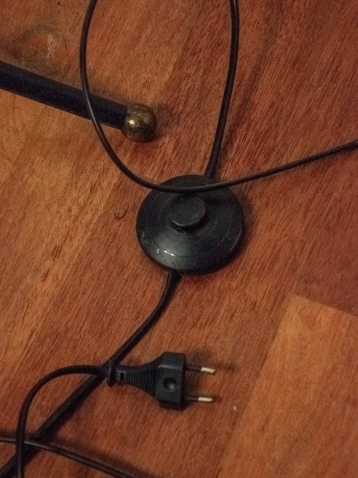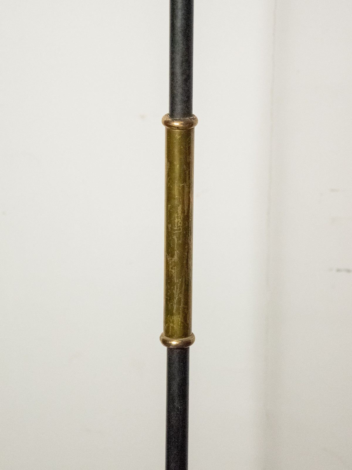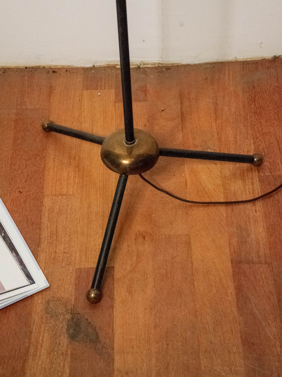 Elevate your interior with this 1950s floor lamp featuring graphic lines and a slender silhouette. Its four white glass globes diffuse a soft, adjustable light, and the adjustable tilt allows you to direct the light according to your needs—reading, a seating area, or highlighting a specific feature. The contrast between the black lacquered metal and brass elements creates a refined and inviting mid-century aesthetic. Rewired for worry-free use.