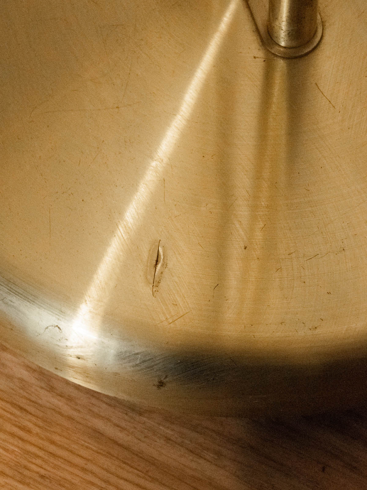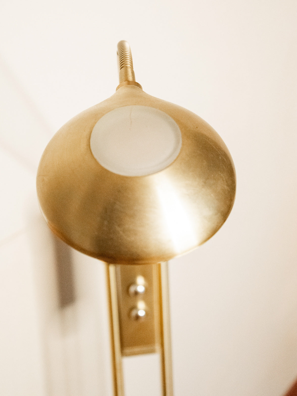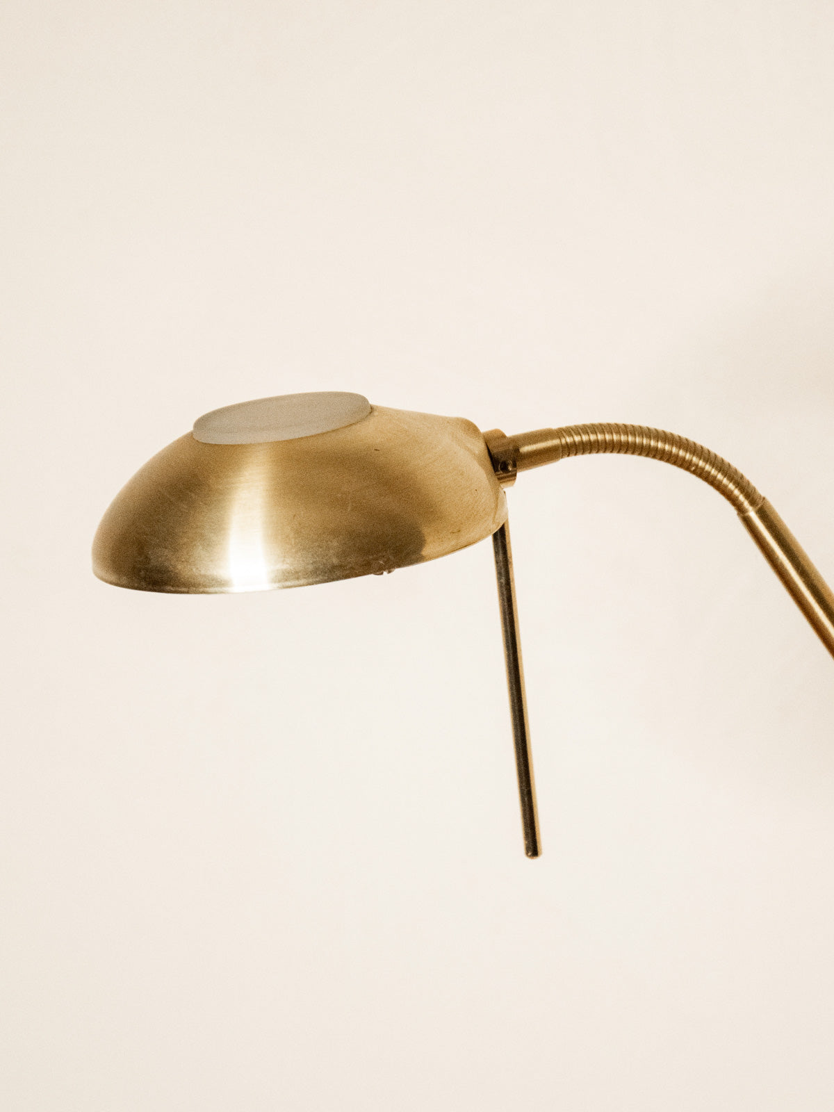 Enhance your interior with this gold floor lamp equipped with a dimmer switch. Its round base and adjustable head offer great lighting flexibility. The gold metal finish adds an elegant and warm touch, ideal for creating a soft ambiance in a living room, reading nook, or office. Practical and understated, it allows you to adjust the light to suit your needs, from work to relaxation. Signs of age are present on the base.