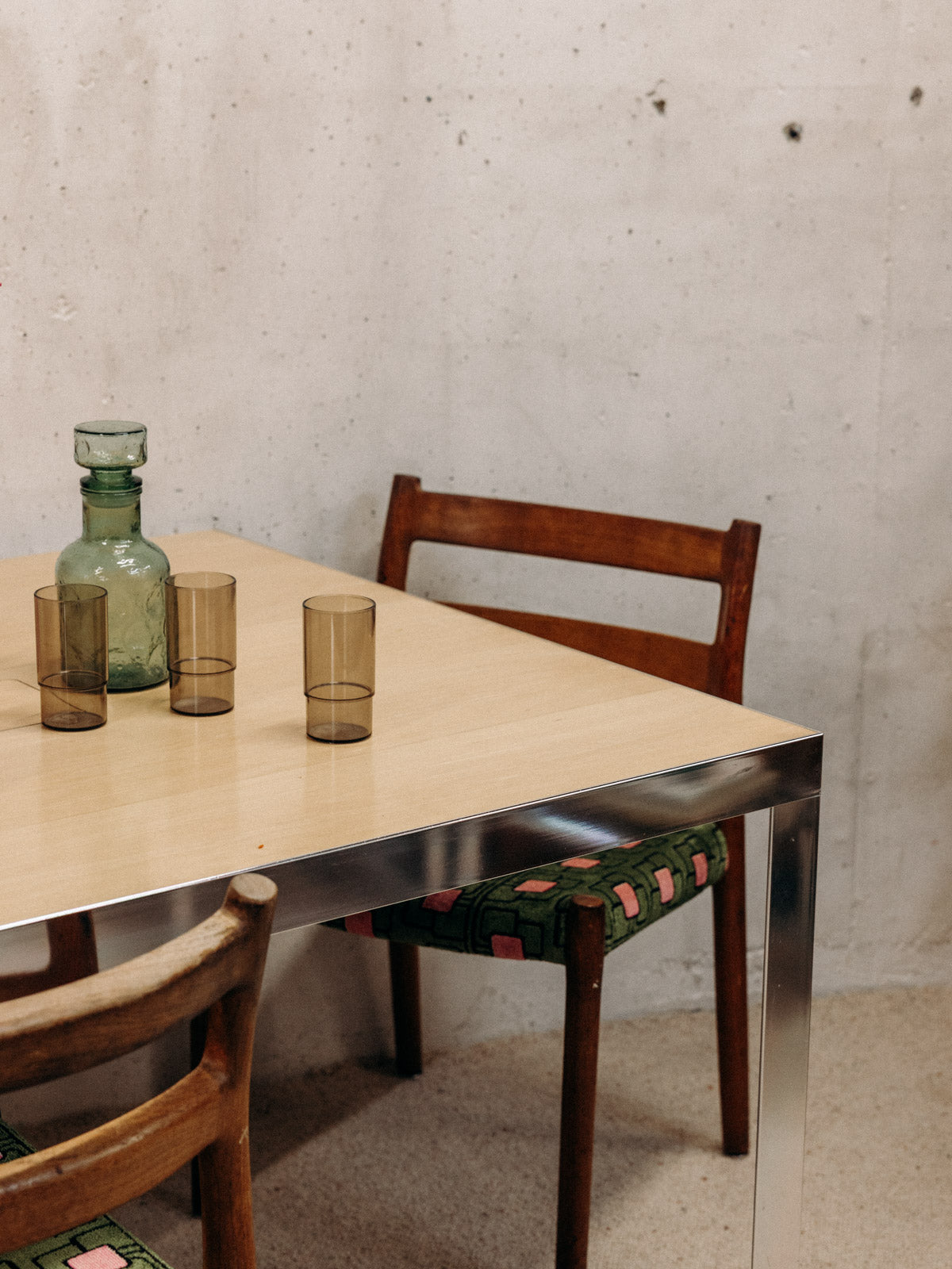 This Italian dining table, from the Unifore collection, combines a metal frame with a light wood top. Its clean, balanced silhouette offers a large, inviting surface, ideal for seating up to six people. A small central hatch, designed for raclette grills and other appliances, allows for easy connection without disrupting the table's aesthetic. The understated design and carefully chosen materials create a convivial table that blends seamlessly into both contemporary and more traditional interiors.