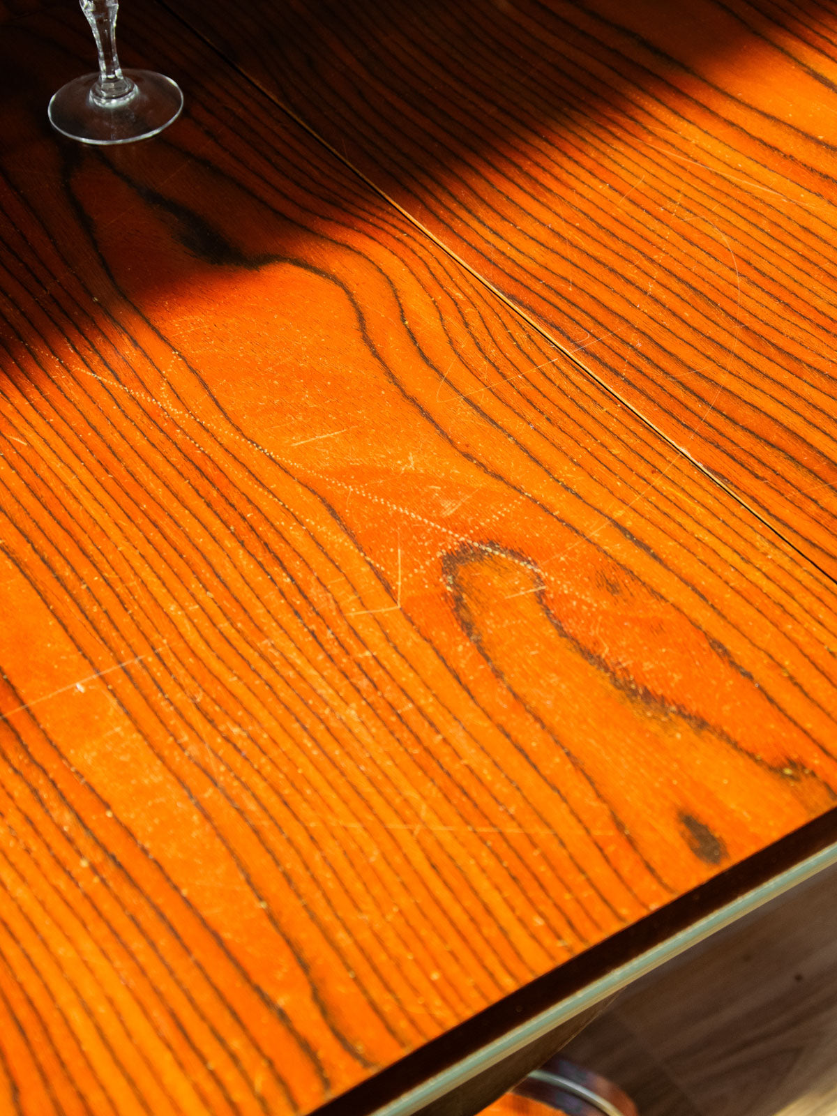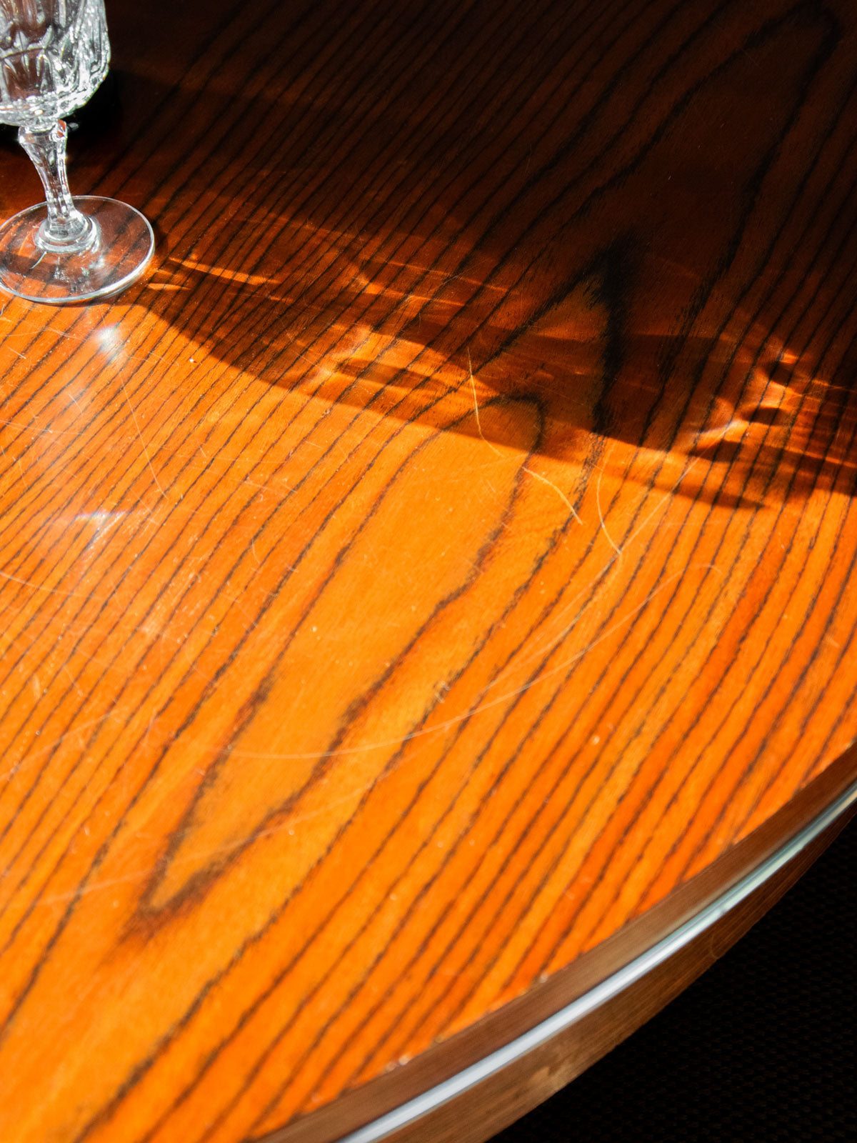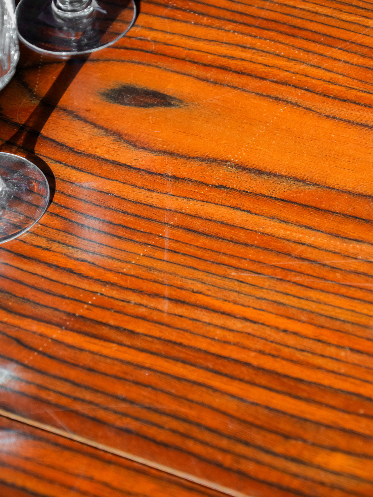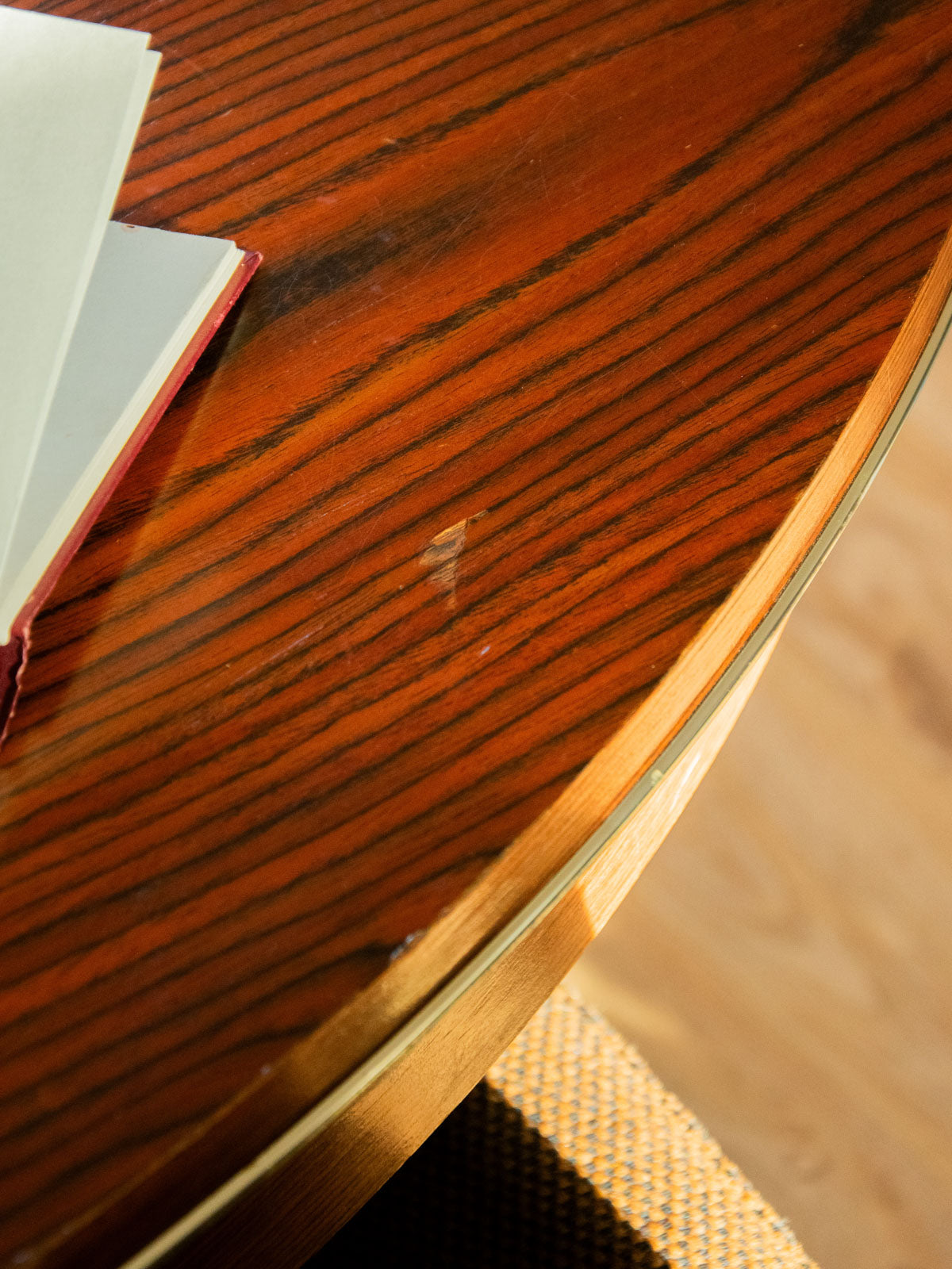 Invite conviviality and elegance with this butterfly table designed for 4 to 6 guests: its heavy stainless steel frame ensures stability and presence, while the rosewood veneer adds warmth and refinement. Its sliding extension easily unfolds to accommodate additional guests, ideal for a dining room or flexible space where generous proportions truly make sense. A subtle chip in the veneer and some signs of age on the tabletop.