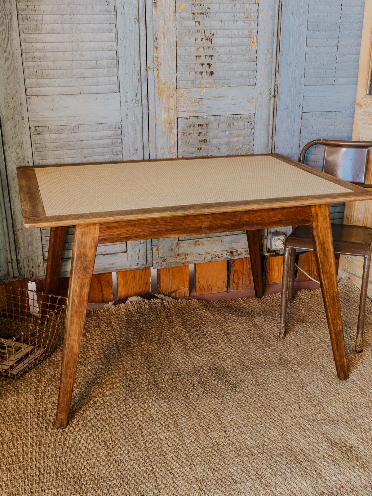 Adoptez cette table à manger en bois, dotée d'un plateau en osier tressé qui apporte une texture naturelle et chaleureuse à votre intérieur. Sa structure robuste et ses proportions généreuses permettent d'accueillir confortablement quatre à six convives, idéale pour repas conviviaux ou soirées partagées. Le contraste entre la noblesse du bois et la légèreté de la paille crée une ambiance bohème-chic, sobre et invitante, adaptée à une salle à manger ou une cuisine ouverte. Quelques traces du temps présentes.
