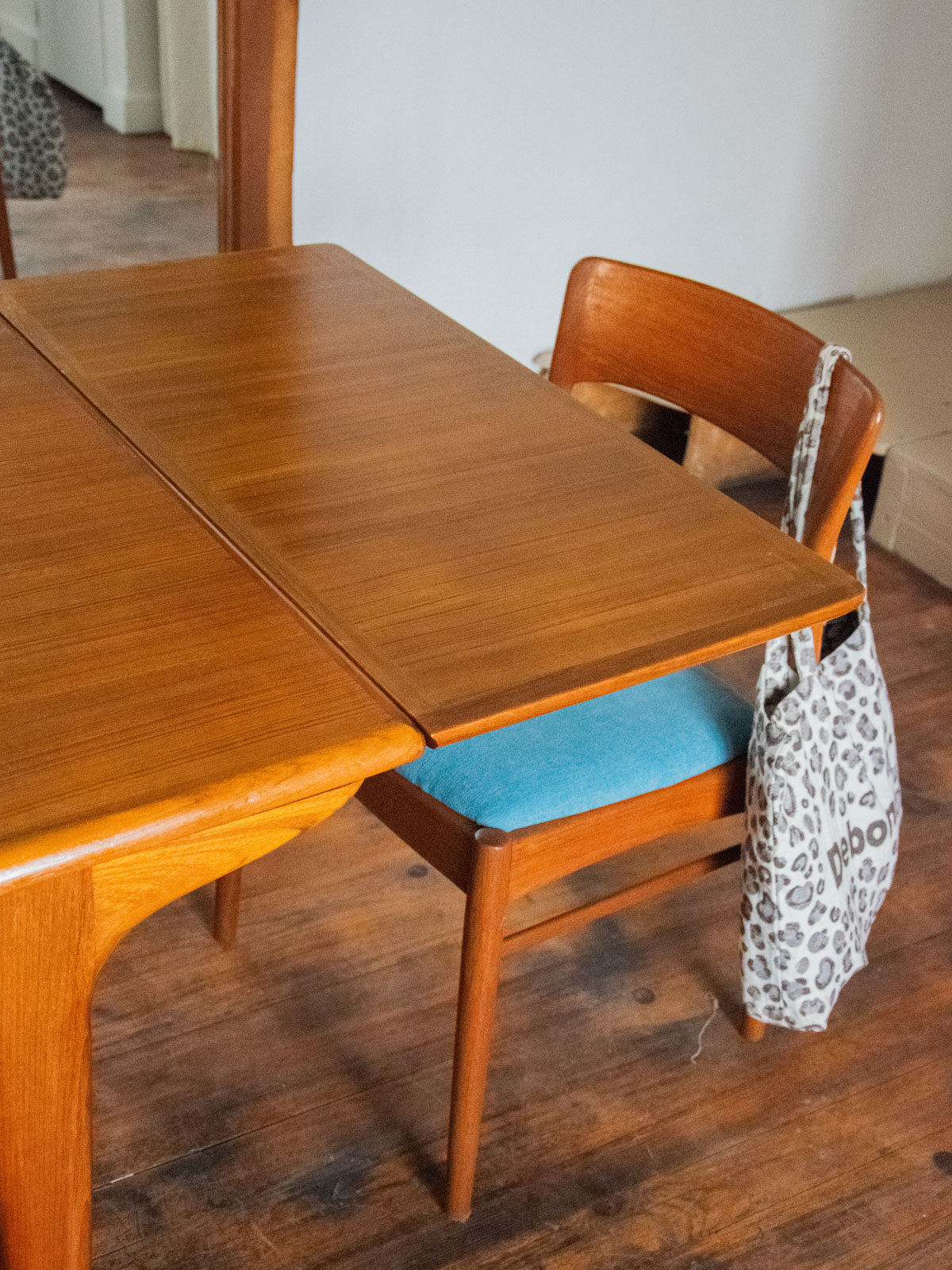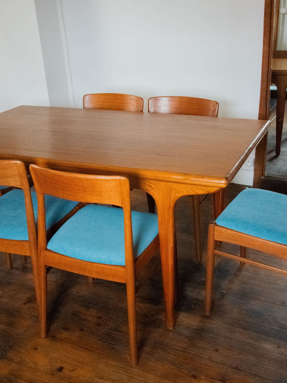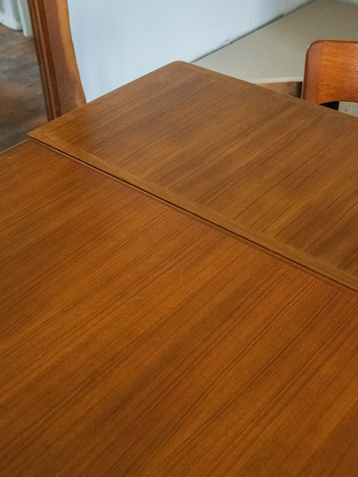 Teak dining table by Jean Tricoire and Robert Vecchione, dating from the 1960s, with a Scandinavian design and rounded legs. It features two extensions at the ends of the tabletop, allowing it to accommodate 6 to 10 people thanks to an Italian-style system. Each table is signed with a manufacturer's plaque under the tabletop. The set is in very good overall condition.