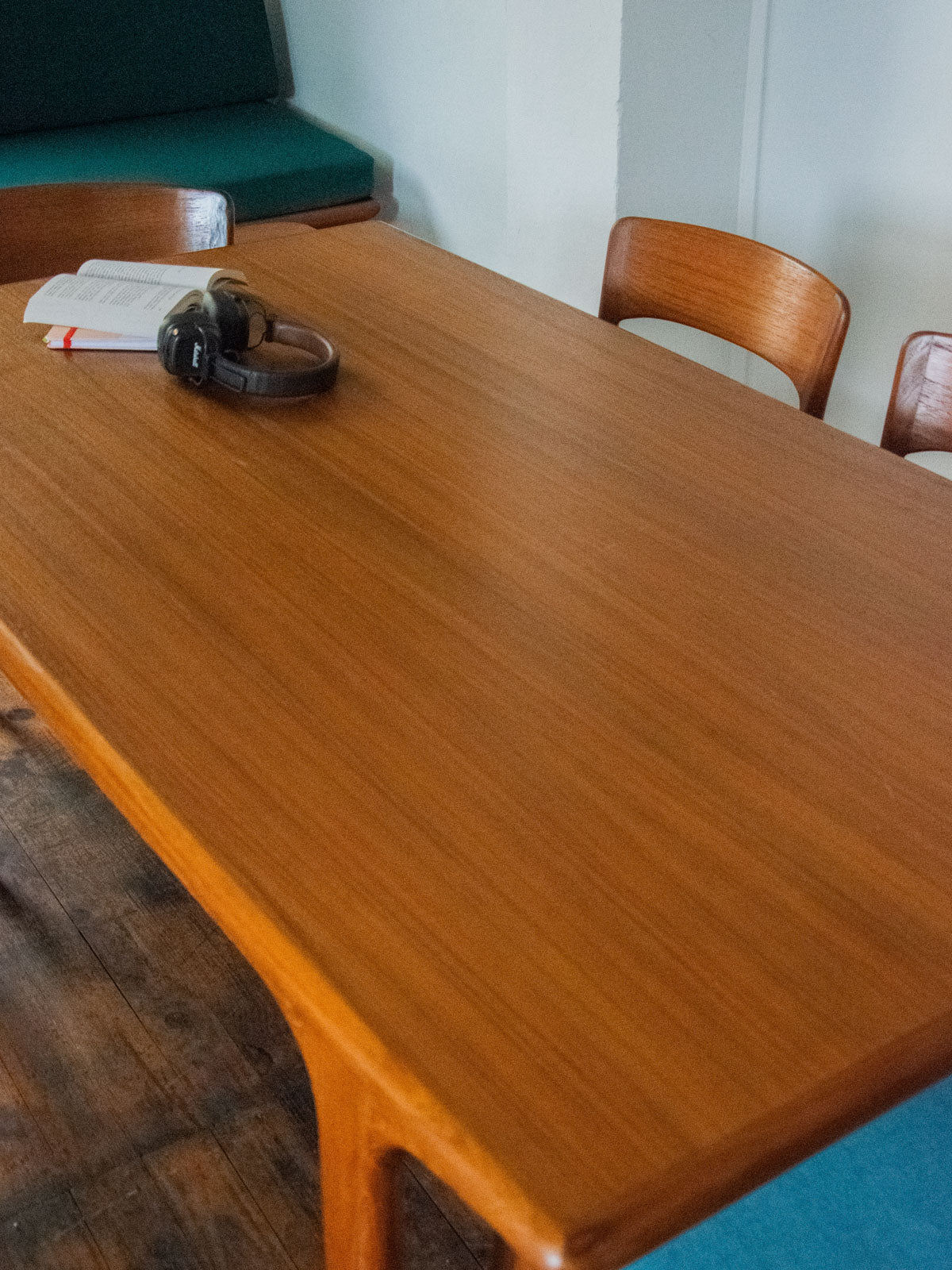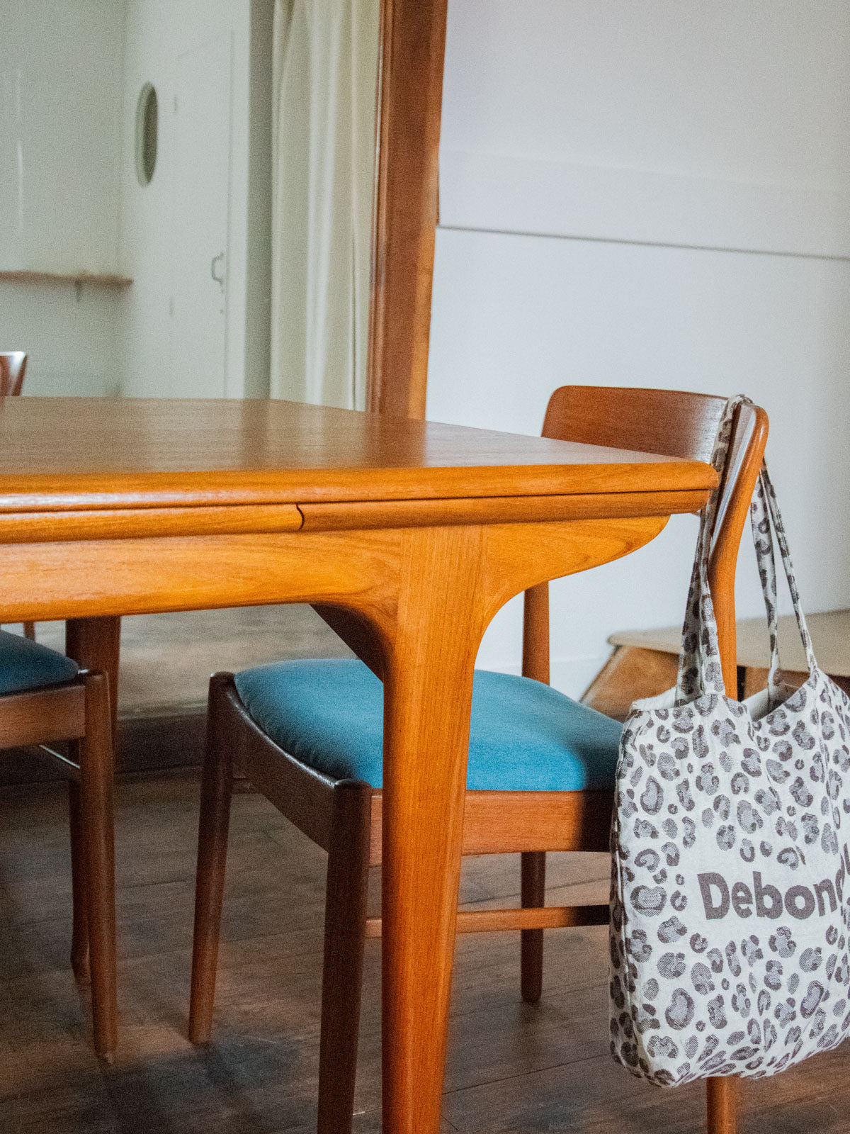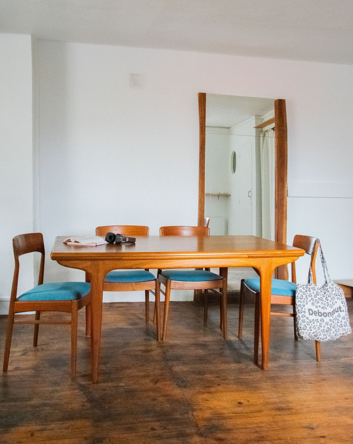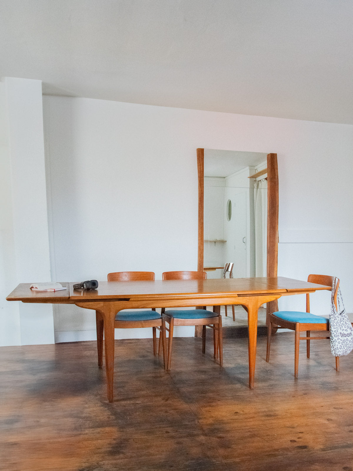 Teak dining table by Jean Tricoire and Robert Vecchione, dating from the 1960s, with a Scandinavian design and rounded legs. It features two extensions at the ends of the tabletop, allowing it to accommodate 6 to 10 people thanks to an Italian-style system. Each table is signed with a manufacturer's plaque under the tabletop. The set is in very good overall condition.