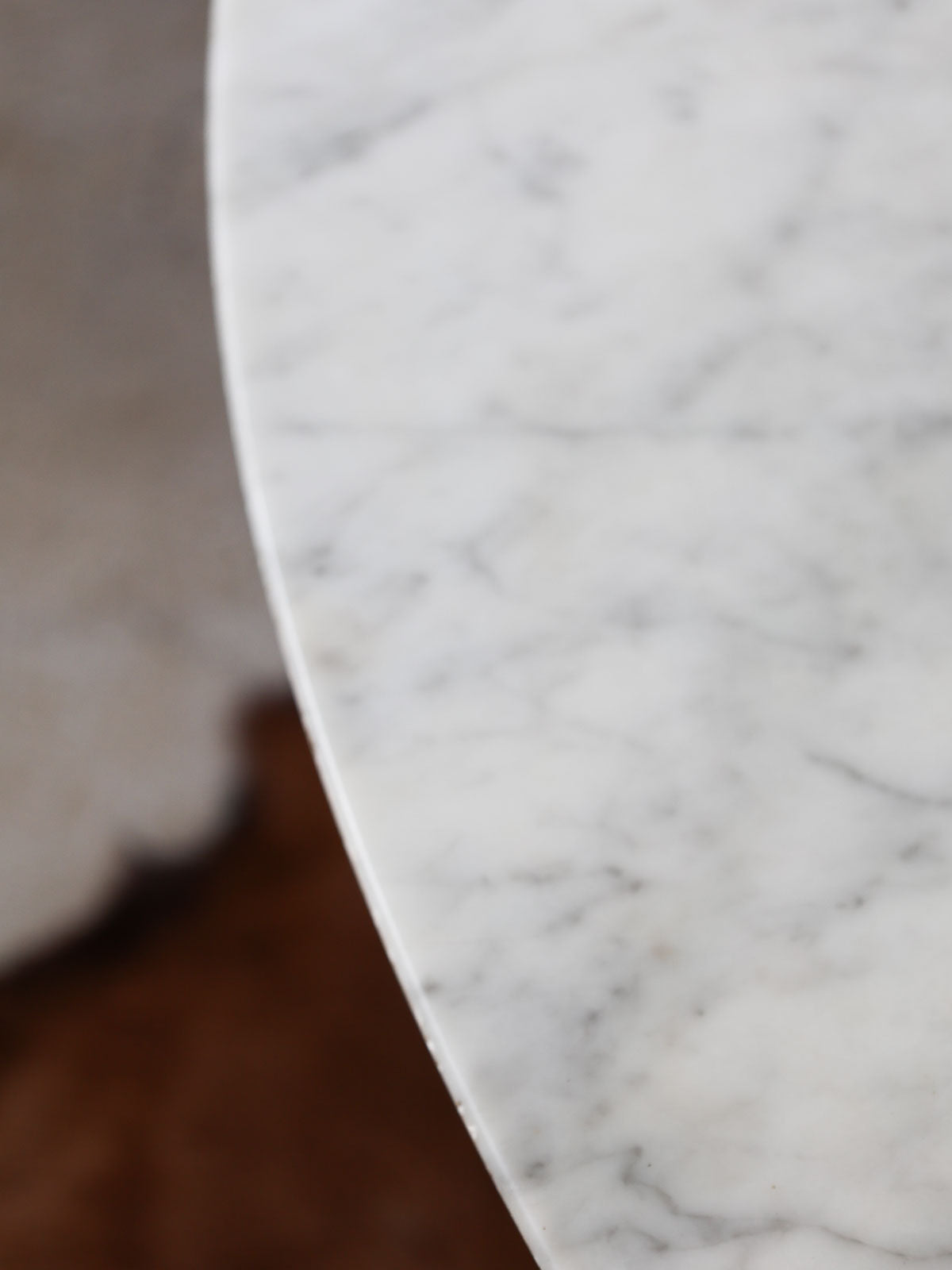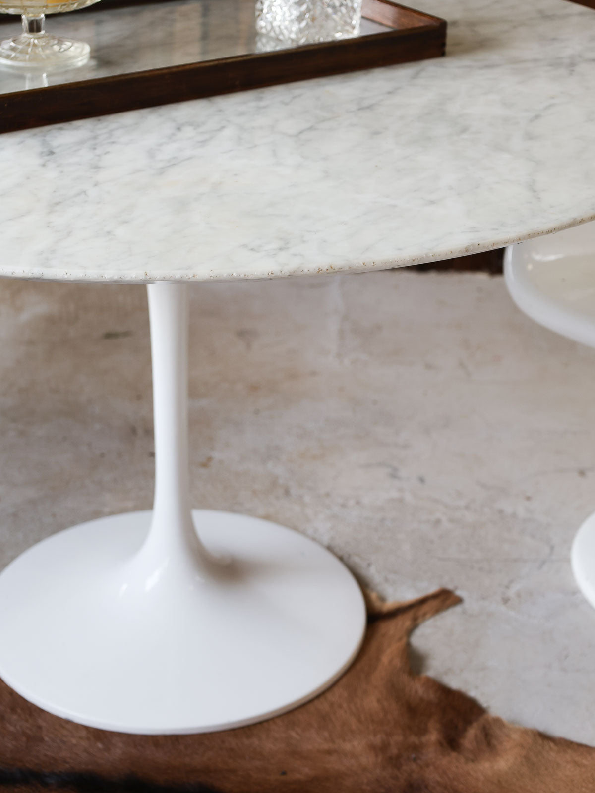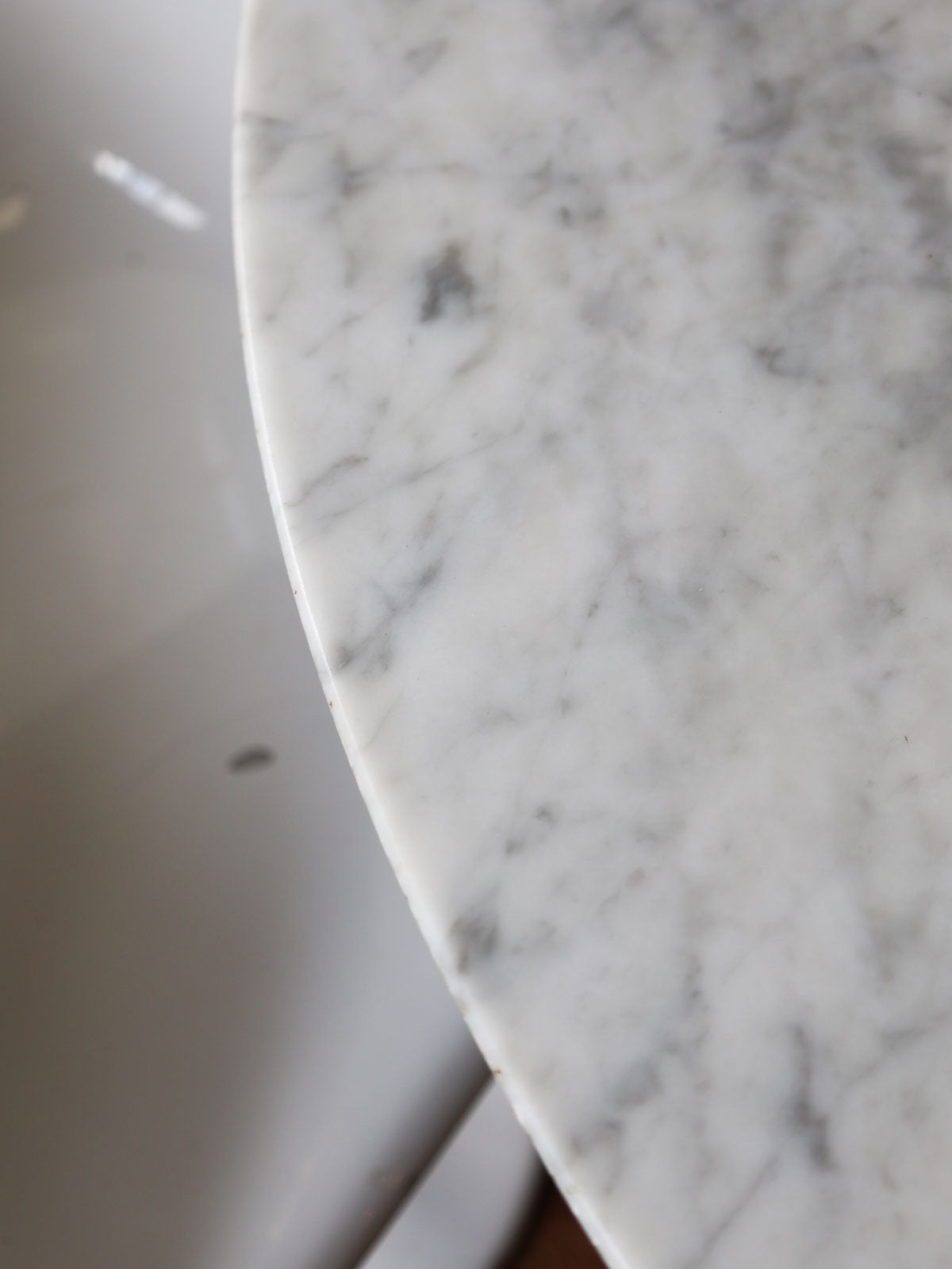Elevate your dining room with this round light marble table, inspired by Knoll's Saarinen style with its iconic tulip base. Its clean lines and generous surface invite conviviality, ideal for family gatherings or meals with friends. The marble brings a soft luminosity and a sculptural presence, while the cast aluminum base with a white Rilsan coating ensures stability and minimalist elegance. Perfect as the centerpiece of a contemporary living room or a refined dining area. Good vintage condition. Seats 4 to 6 people perfectly.