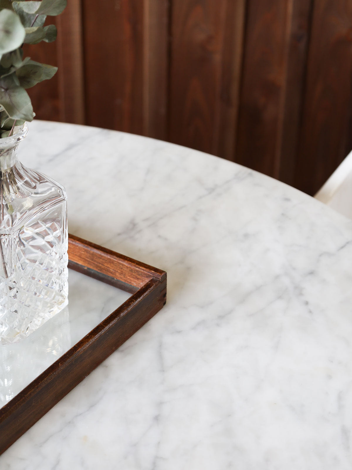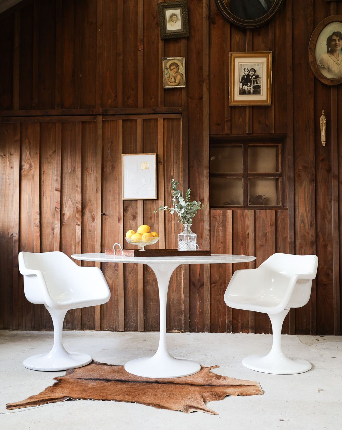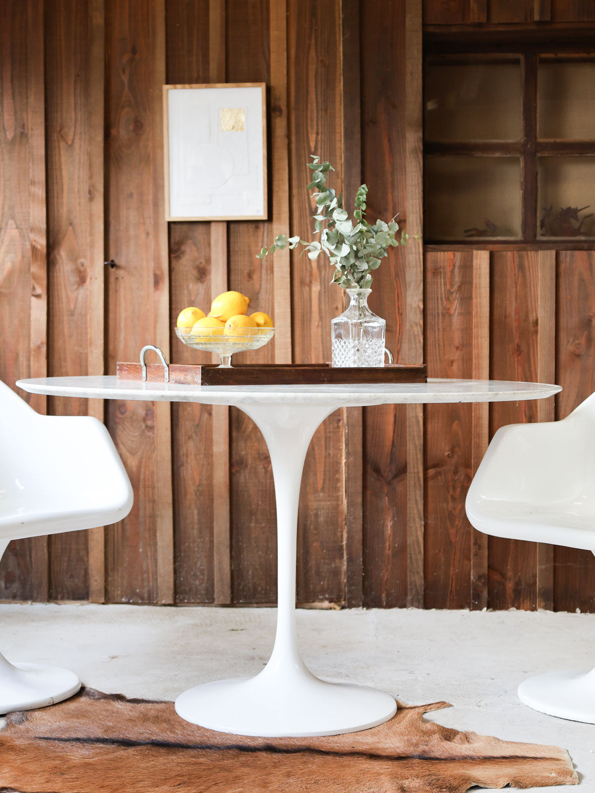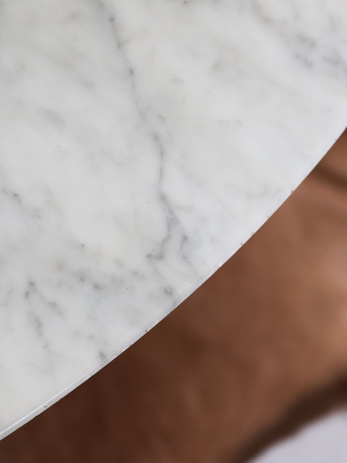 Elevate your dining room with this round light marble table, inspired by Knoll's Saarinen style with its iconic tulip base. Its clean lines and generous surface invite conviviality, ideal for family gatherings or meals with friends. The marble brings a soft luminosity and a sculptural presence, while the cast aluminum base with a white Rilsan coating ensures stability and minimalist elegance. Perfect as the centerpiece of a contemporary living room or a refined dining area. Good vintage condition. Seats 4 to 6 people perfectly.