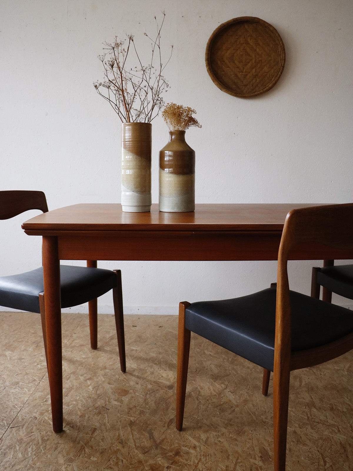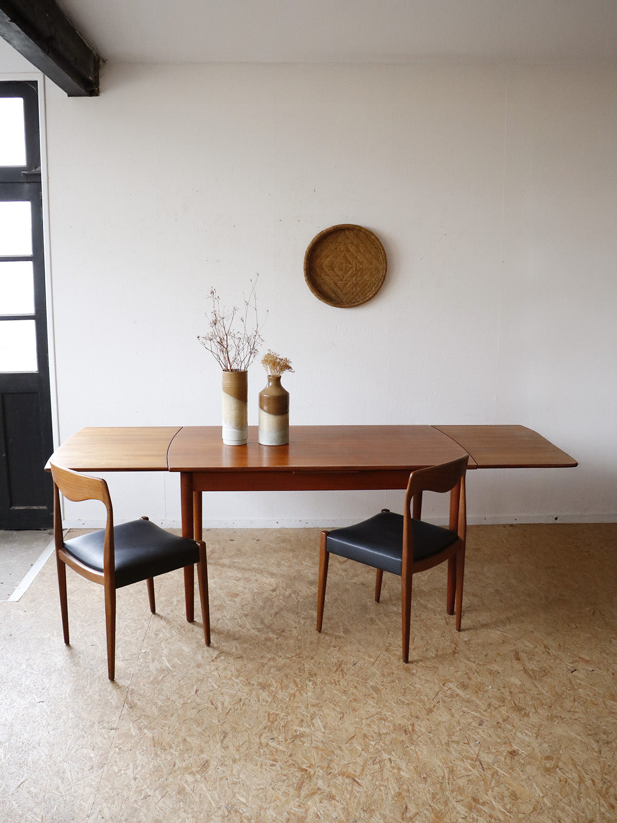 Discover this rectangular teak table from the 1960s by Samcom, featuring a gently rounded top and solid edges, combining elegance and simplicity. Its two integrated extensions transform it into a convivial table seating 8 to 10 people, ideal for family meals or dinners with friends. The warm wood and understated silhouette bring a timeless and inviting atmosphere to the dining room, while its robust construction ensures lasting durability.