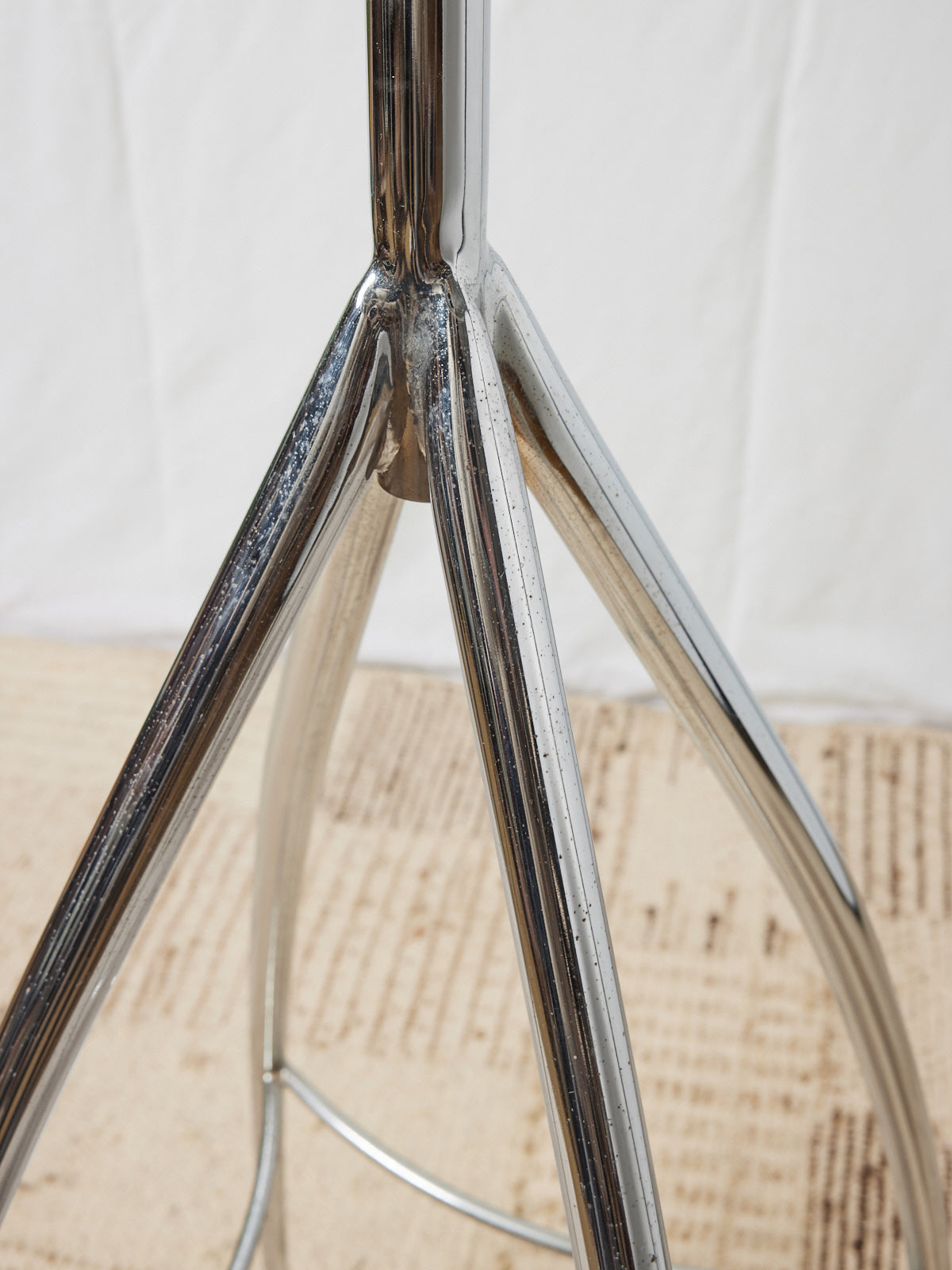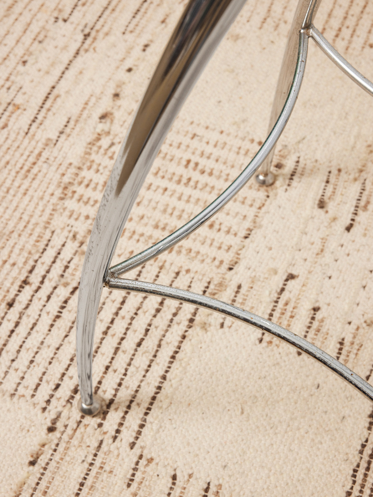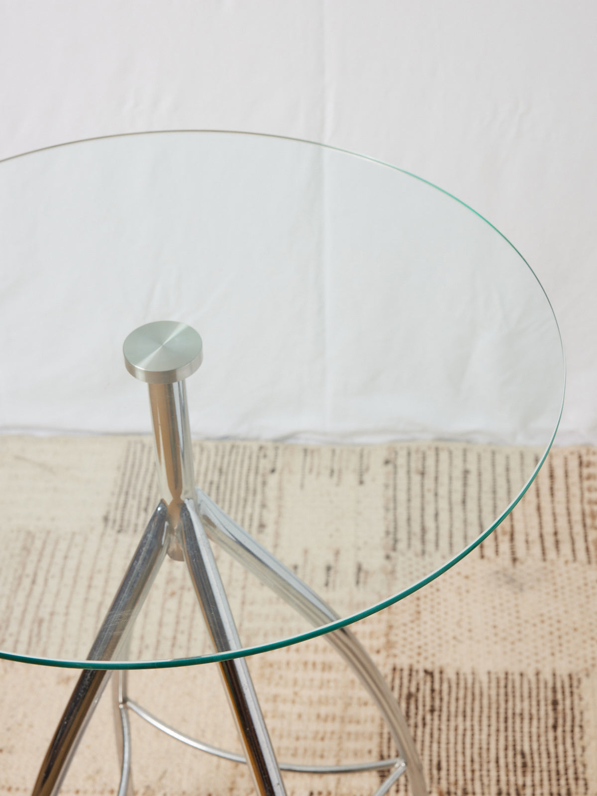 Elevate your dining area with this high table featuring a glass top and chrome base, designed to create an elegant and airy focal point. The translucent top diffuses light, while the chrome frame provides a contemporary and graphic silhouette, offering a refined presence without overwhelming the space. Ideal for a convivial aperitif area or as an extra counter in an open-plan kitchen, it invites conversation and shared moments.