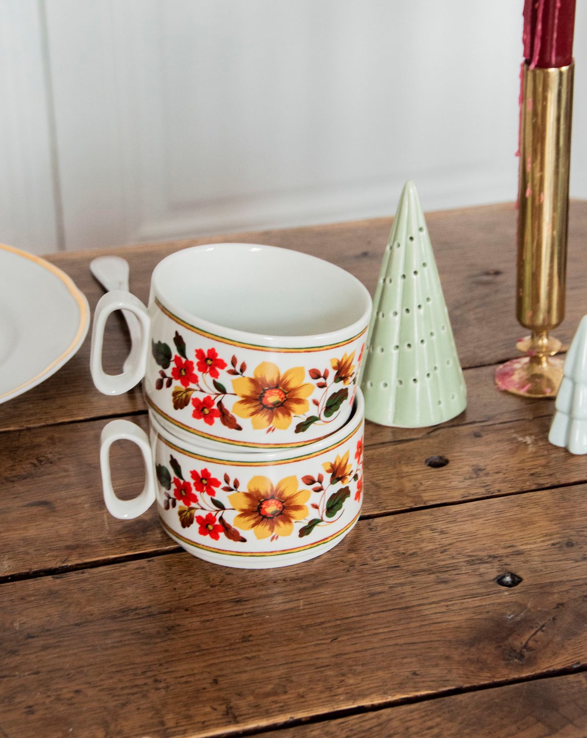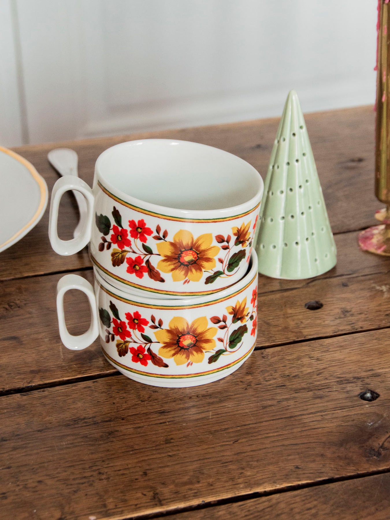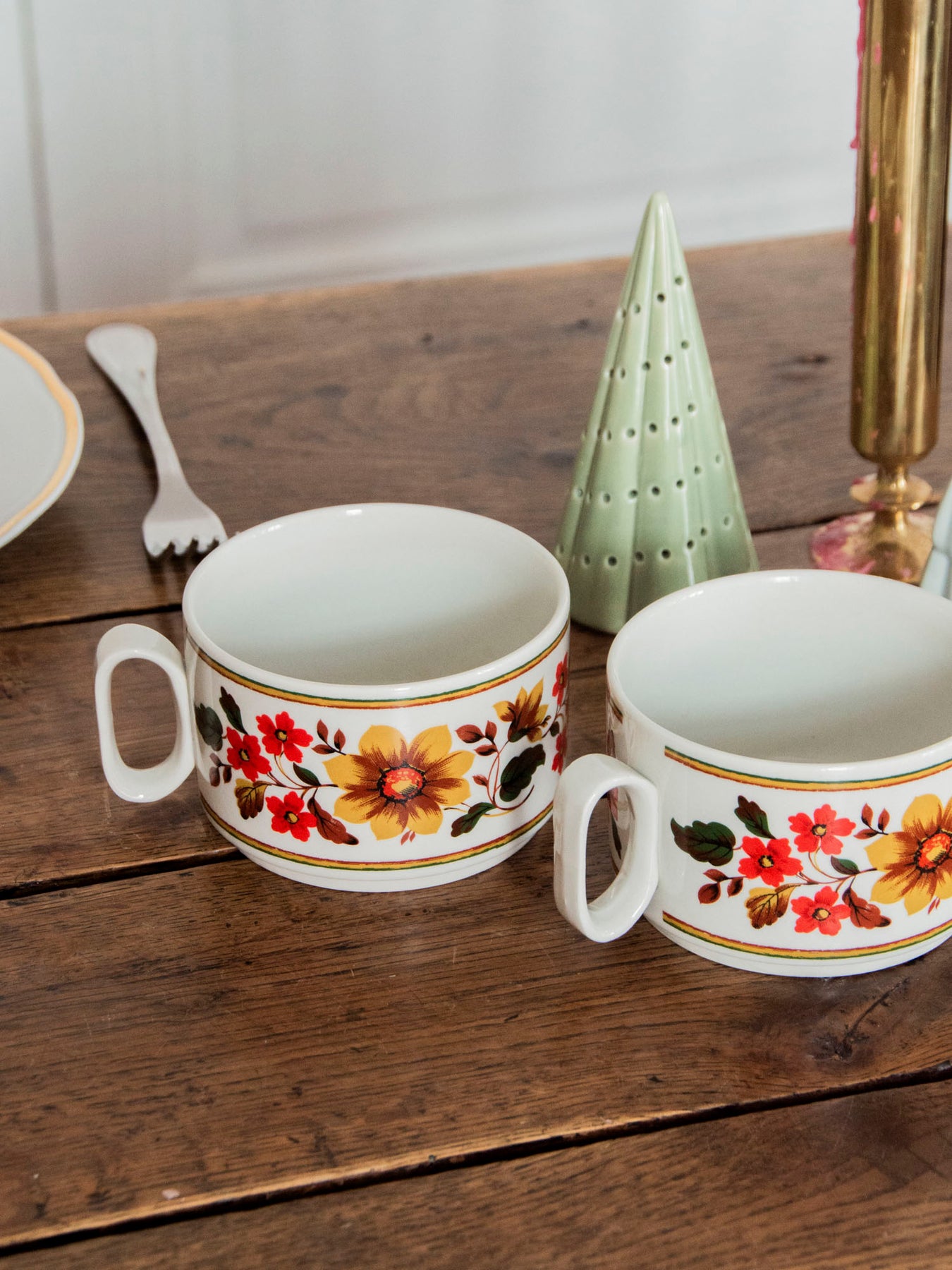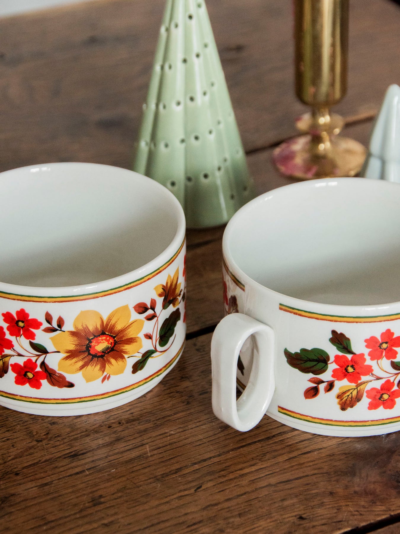Discover this pair of enameled cups with a floral motif, featuring a multicolored design and delicate rims that highlight their understated elegance. Their intimate size and small handles offer a gentle grip, ideal for espressos, short teas, or a strong coffee during breakfast for two. The contrasting colors bring a warm, vintage touch to the table, perfect for creating a convivial and poetic atmosphere.