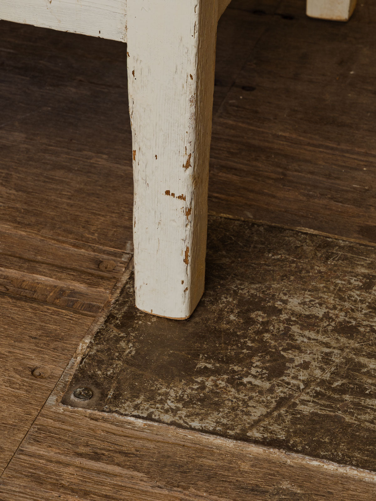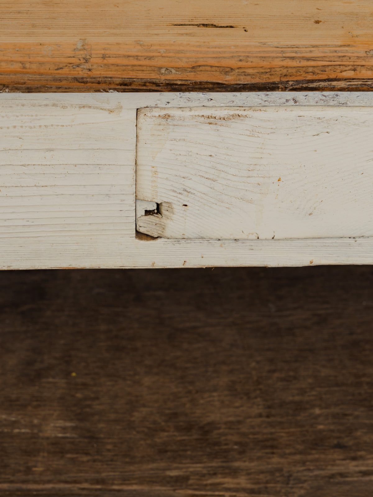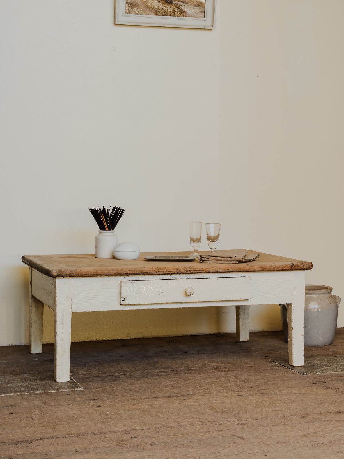 This antique coffee table exudes understated charm. Its patinated frame and raw top tell a story. Its size makes it perfect for an intimate living room, offering ample space for books and cups, and a discreet drawer for small storage items. The wooden dowel joints and the raw finish of the top highlight its beautiful, handcrafted authenticity. Signs of wear, including the imprint of an iron, evoke the passage of time—subtle traces of age that only add to its charm.