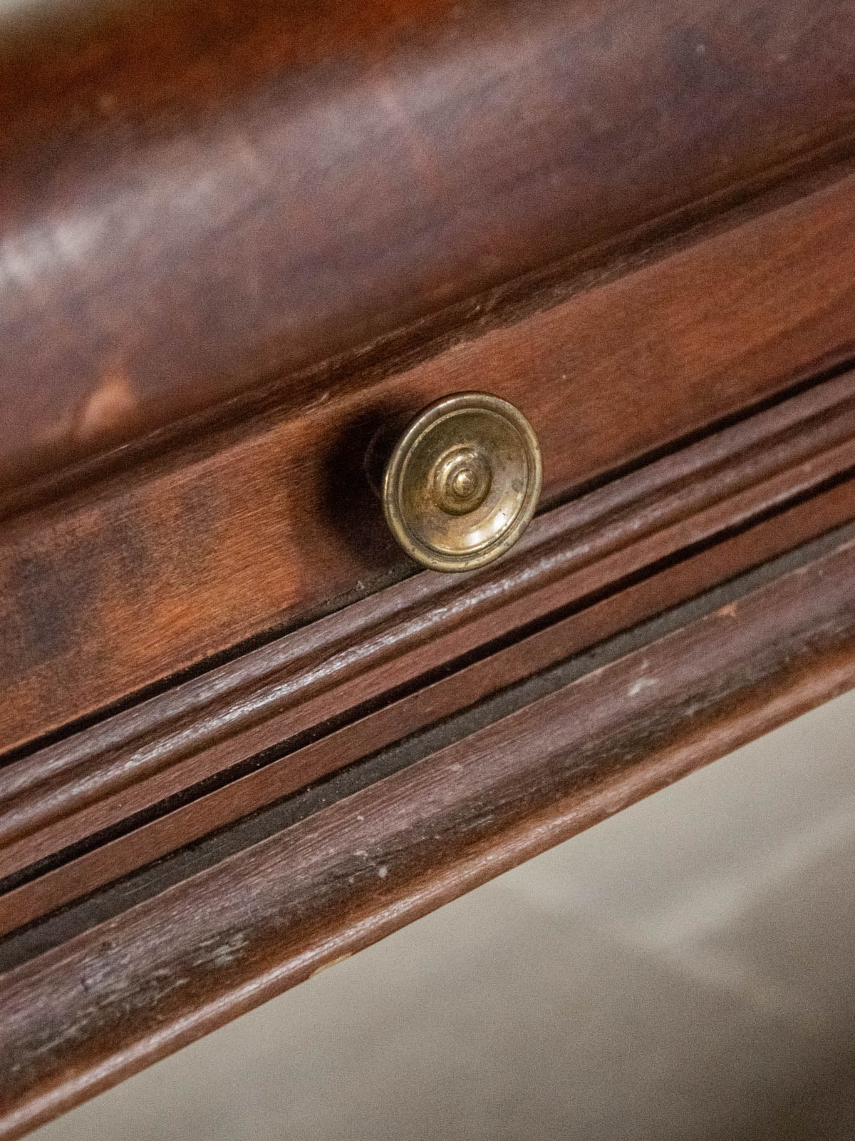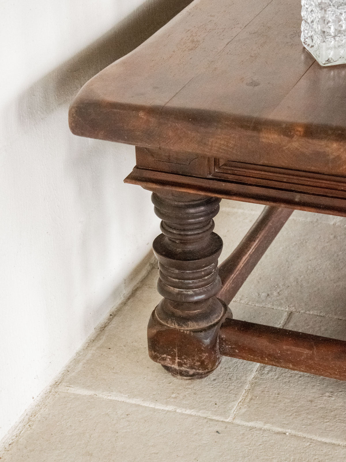 Elevate your interior with this country-style coffee table crafted from solid oak, finished with a dark patina that highlights the richness of the wood and its sculpted surfaces. Its two drawers, fitted with brass knobs, offer discreet storage for remote controls and magazines, while the turned legs lend an authentic and stable silhouette to its generous proportions. Perfect for creating a warm and inviting atmosphere, it fits seamlessly into both rustic living rooms and contemporary interiors, adding character and elegance.
