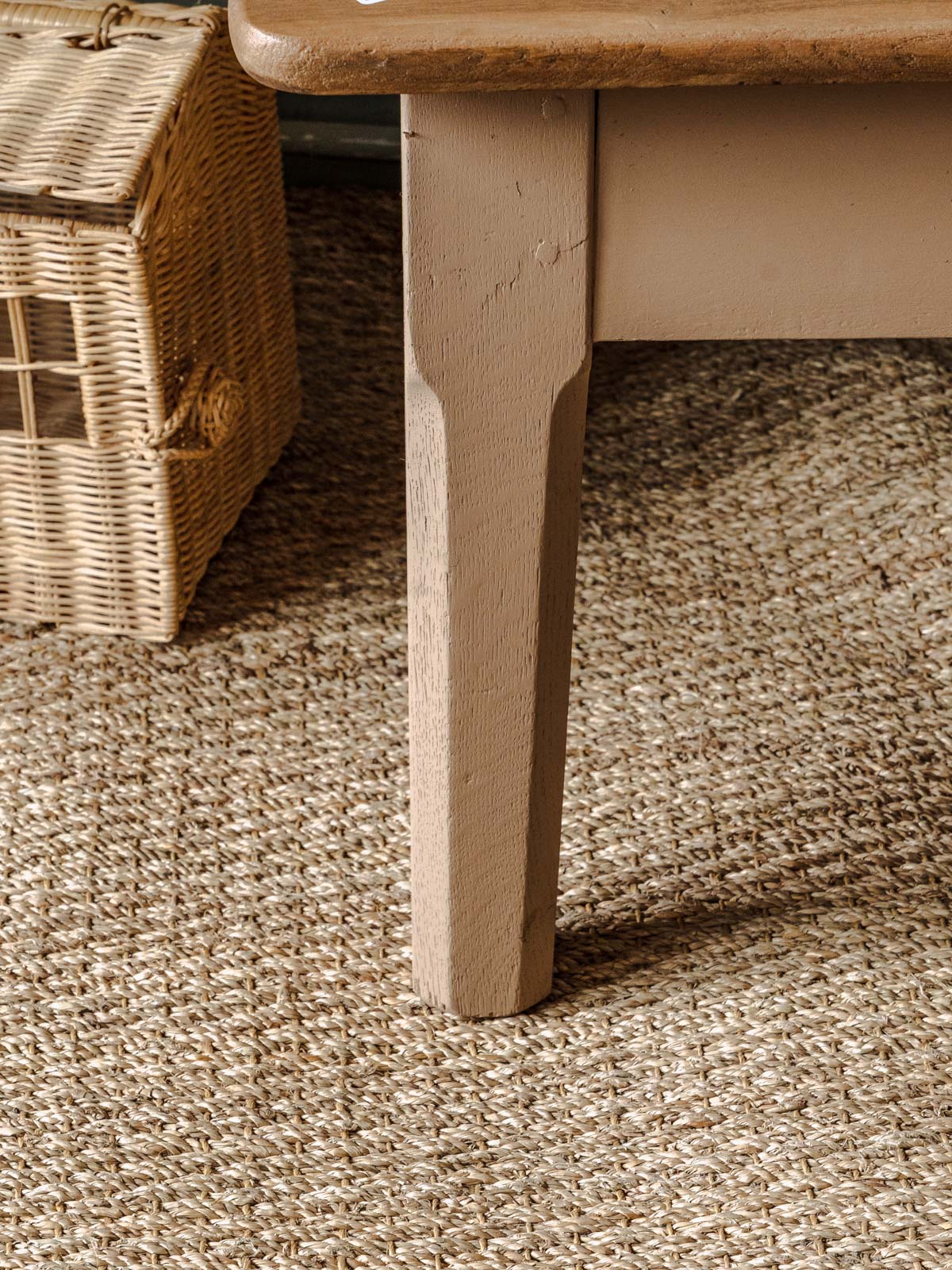 Add a warm vintage touch with this wooden coffee table featuring a generous top and inviting proportions. The legs, repainted in a rosy beige, bring a delicate contemporary note that complements the natural patina of the tabletop. Ideal for entertaining, holding magazines and cups, creating an aperitif corner, or serving as a focal point in the living room, it combines functionality and elegance. Some signs of age are present.