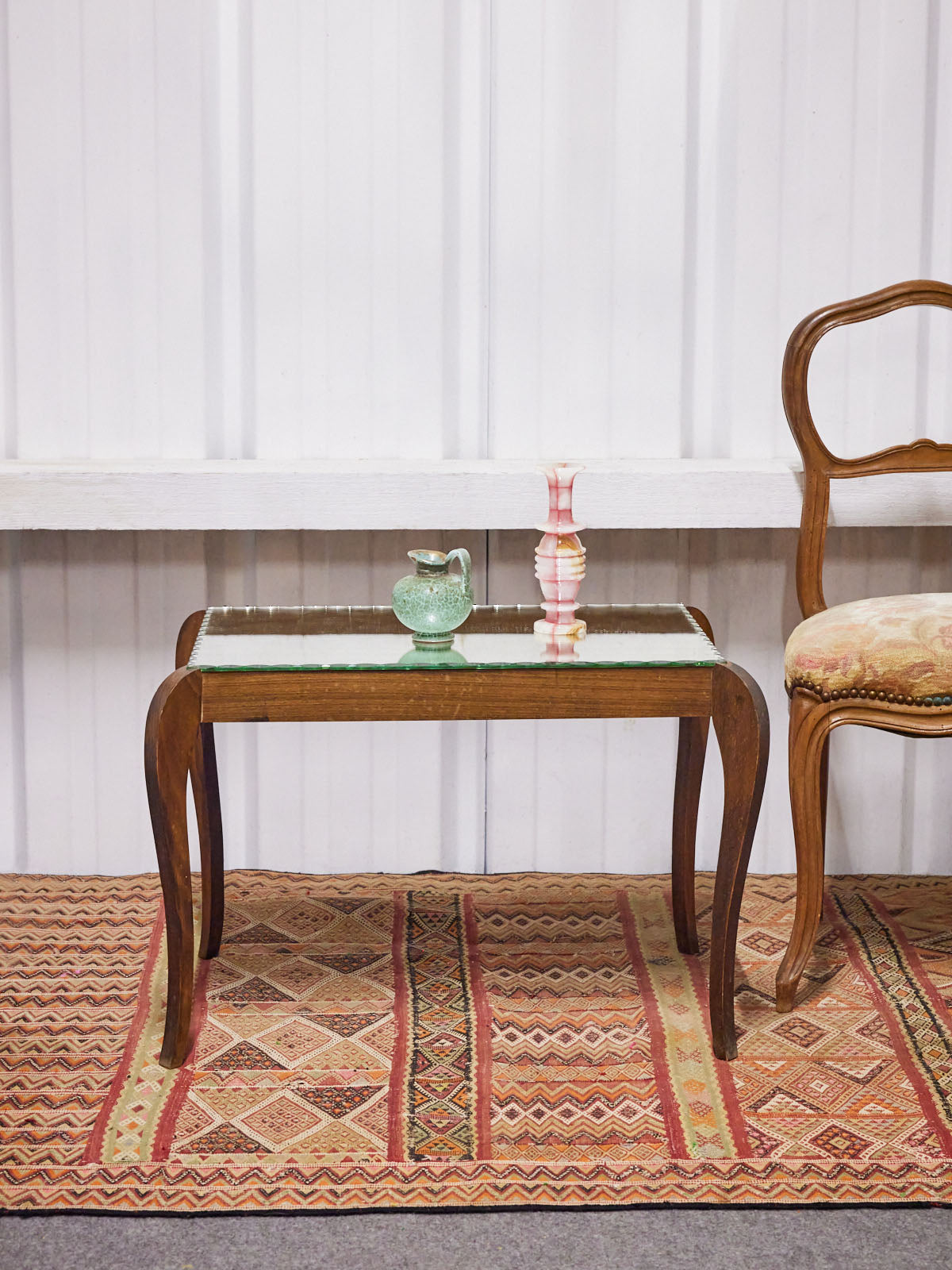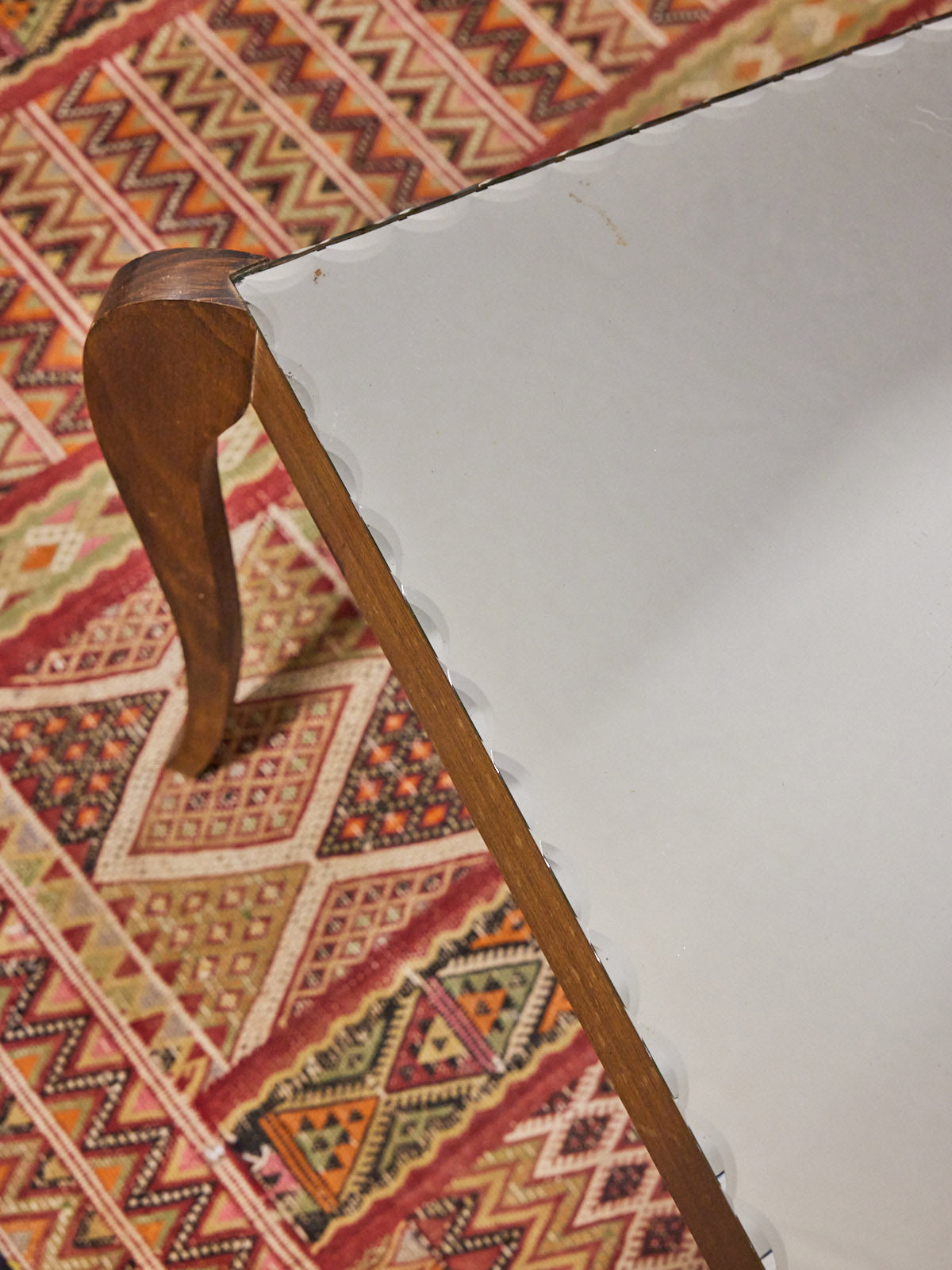 Elevate your interior with this 1940s wooden coffee table. Its balanced proportions invite sharing and conviviality, while the Venetian-inspired mirrored top adds elegant depth and captures light, enhancing both vintage and contemporary living rooms. Its simple yet inviting design lends itself equally well to a reading nook or a reception area, providing a refined surface for books and decorative objects. Some minor scratches and slight signs of age are present.