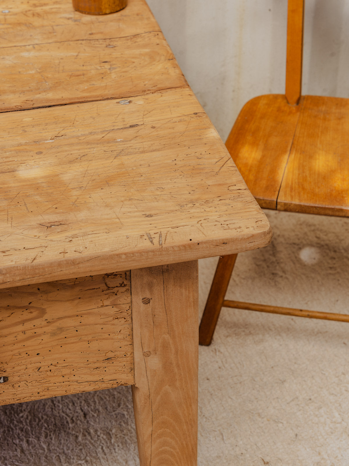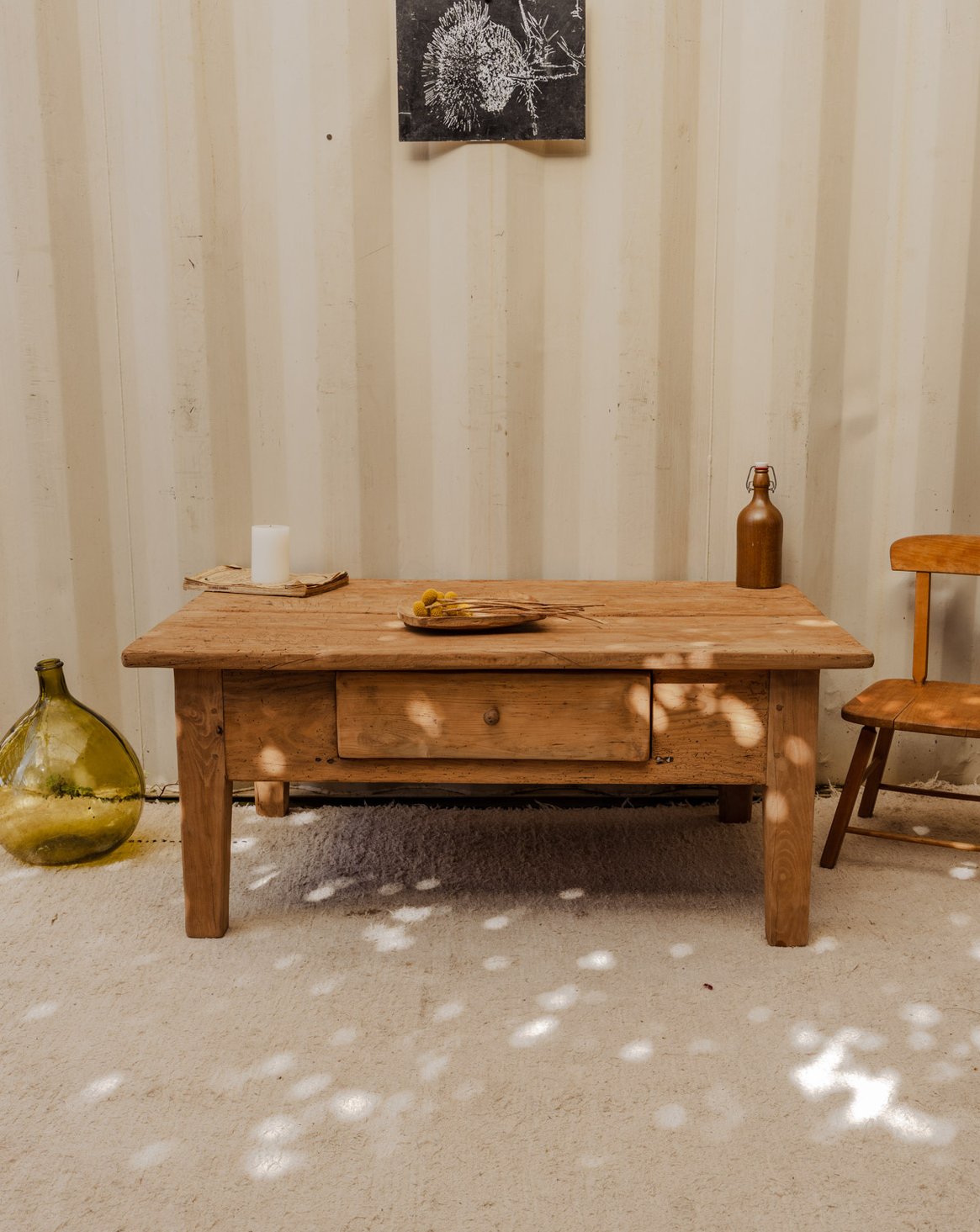Embrace this wooden coffee table with its understated yet inviting design, featuring a drawer for storing remote controls and magazines. Its elongated shape and low height create an ideal horizontal presence in front of a sofa, offering a welcoming surface and flexible storage to suit your needs. The natural wood tone diffuses a soft light and harmonizes with both contemporary and Scandinavian interiors, bringing a sense of calm. Some signs of age are present.