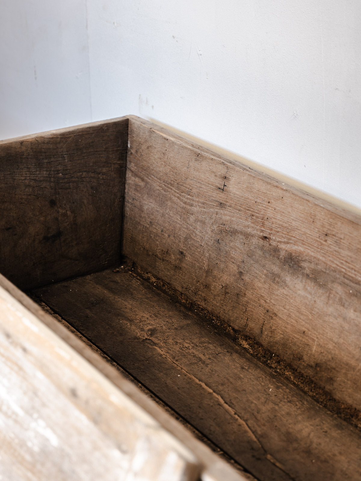 Discover this magnificent antique oak kneading trough, a true gem of character for your home. Its lime paint, in soft and soothing tones, adds a touch of authenticity and elegance. With its tray just placed on it, this kneading trough combines functionality and aesthetics, inviting culinary creativity while beautifying your space. A unique decorative object that will appeal to lovers of vintage and craftsmanship.