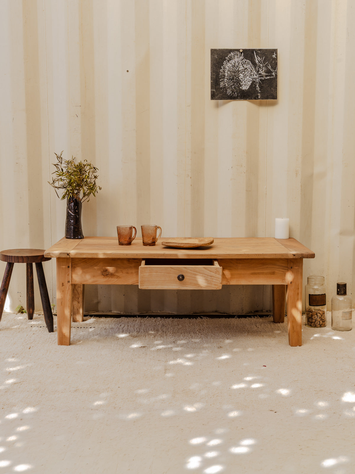 Discover this oak coffee table, with its spacious top and clean lines that bring a warm and contemporary touch to your living room. Its generous size and proportions offer an ideal surface for books, plants, and social gatherings, while a drawer provides convenient storage for remote controls and small items. The light wood enhances a natural and bright ambiance, perfect for a simple and inviting interior. Some signs of age are present.