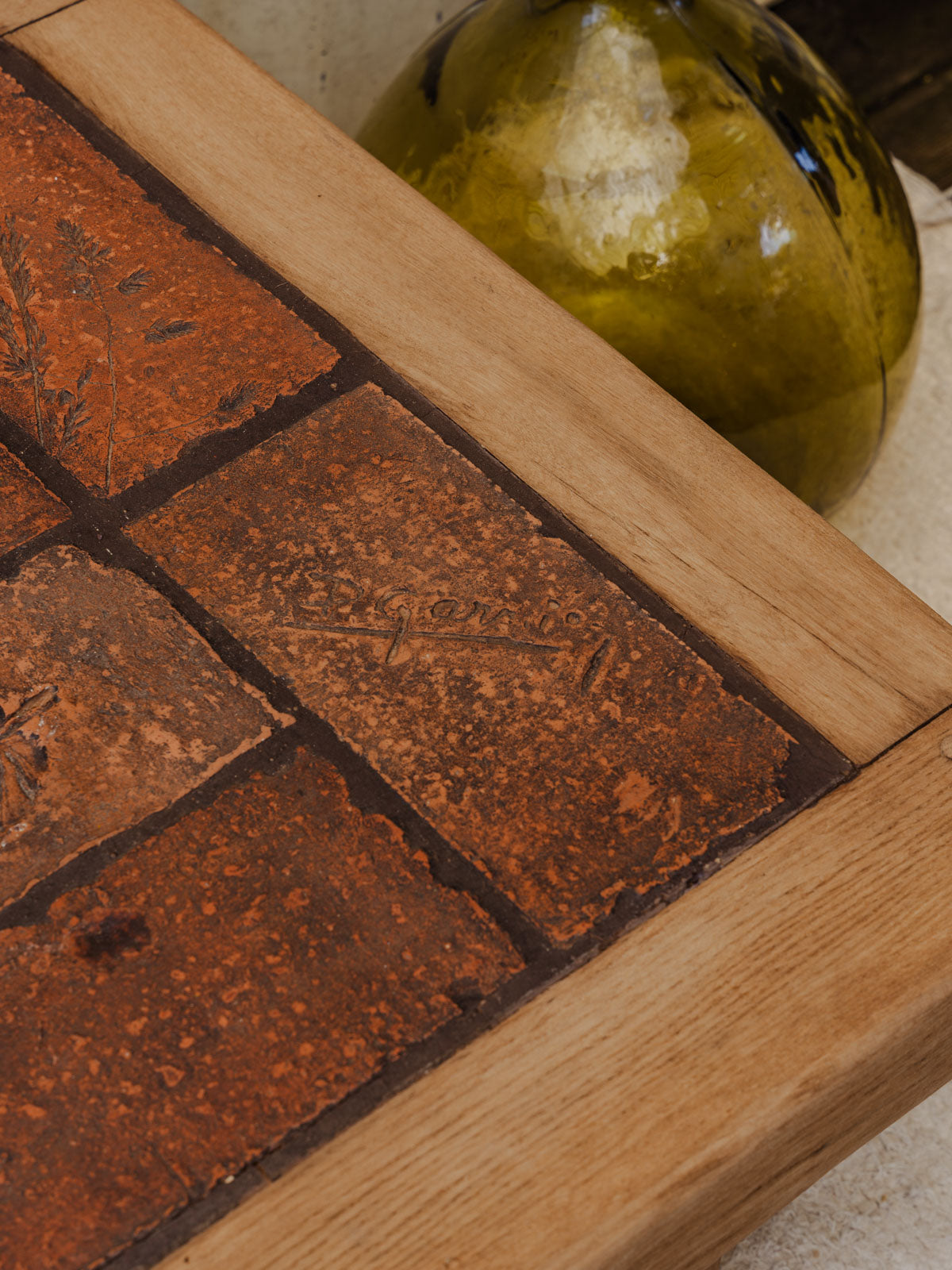 Elevate your living room with this oak coffee table, whose marquetry top, featuring squares with floral motifs, adds a delicate decorative touch. Designed by P. Garnier and later redesigned, it combines vintage charm with a contemporary silhouette, ideal for displaying books, objects, or for a convivial aperitif. Its generous length and low profile create a balanced presence that warms the interior without overwhelming it. Some signs of age are present.