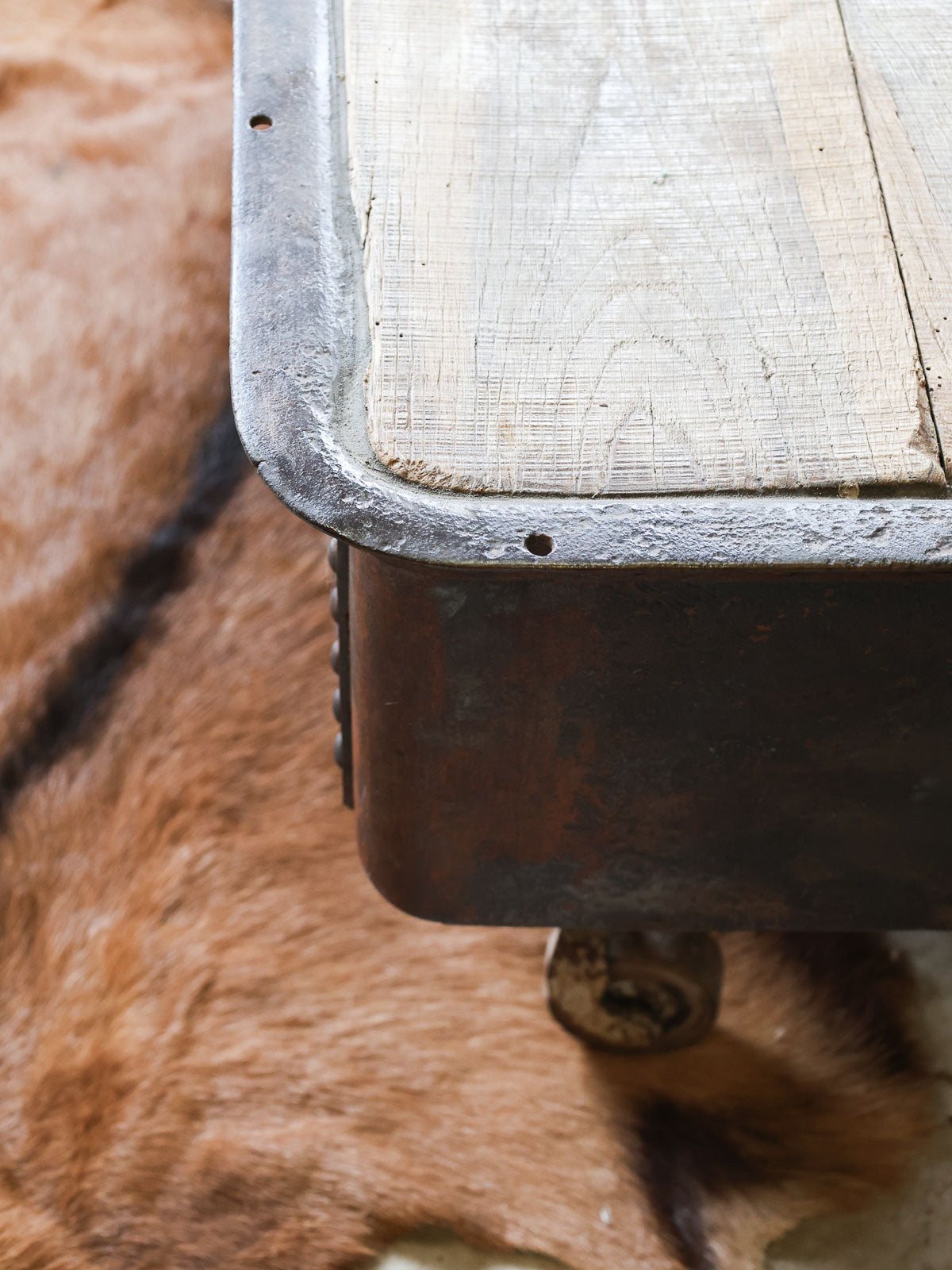 Choose this raw wood and metal coffee table on casters, imbued with a strong industrial style and a striking presence in the living room. Its elongated top offers ample space for books, decorative objects, or appetizers, while the robust frame and iron rim emphasize its utilitarian character. The exposed bolts and the patina of the materials give it an authentic and warm look. Easy to move, it creates a loft-style atmosphere that is both welcoming and uniquely elegant.