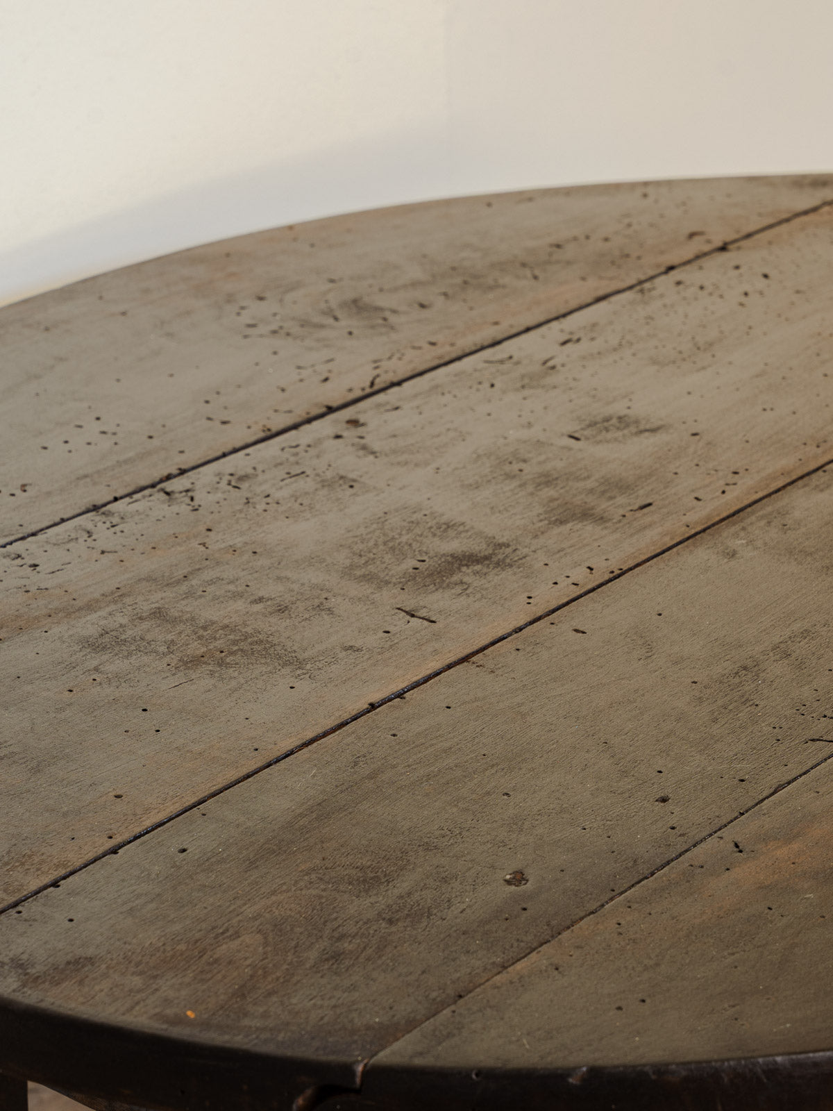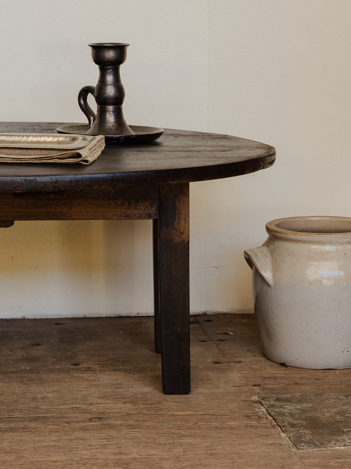 Antique coffee table in ebony-stained walnut, with a warm and understated character. Its generous top and balanced proportions offer ample space for books and everyday objects without overwhelming the room. A discreet drawer, complete with its original brass handle, provides practical storage and a touch of authenticity. Its ideal height makes it perfect alongside a sofa, complementing a simple yet stylish interior. Slight signs of age only add to its charm.