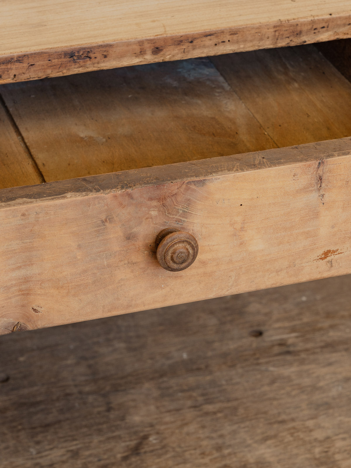 An antique poplar coffee table, inspired by the countryside, that brings a soft and authentic presence to the living room. The light wood and its natural grain offer a warm surface, perfect for placing cups and books without overwhelming the space. Equipped with a drawer, it provides convenient storage for remote controls and small items. Its proportions suit both contemporary and country interiors. Slight signs of age only add to its charm.