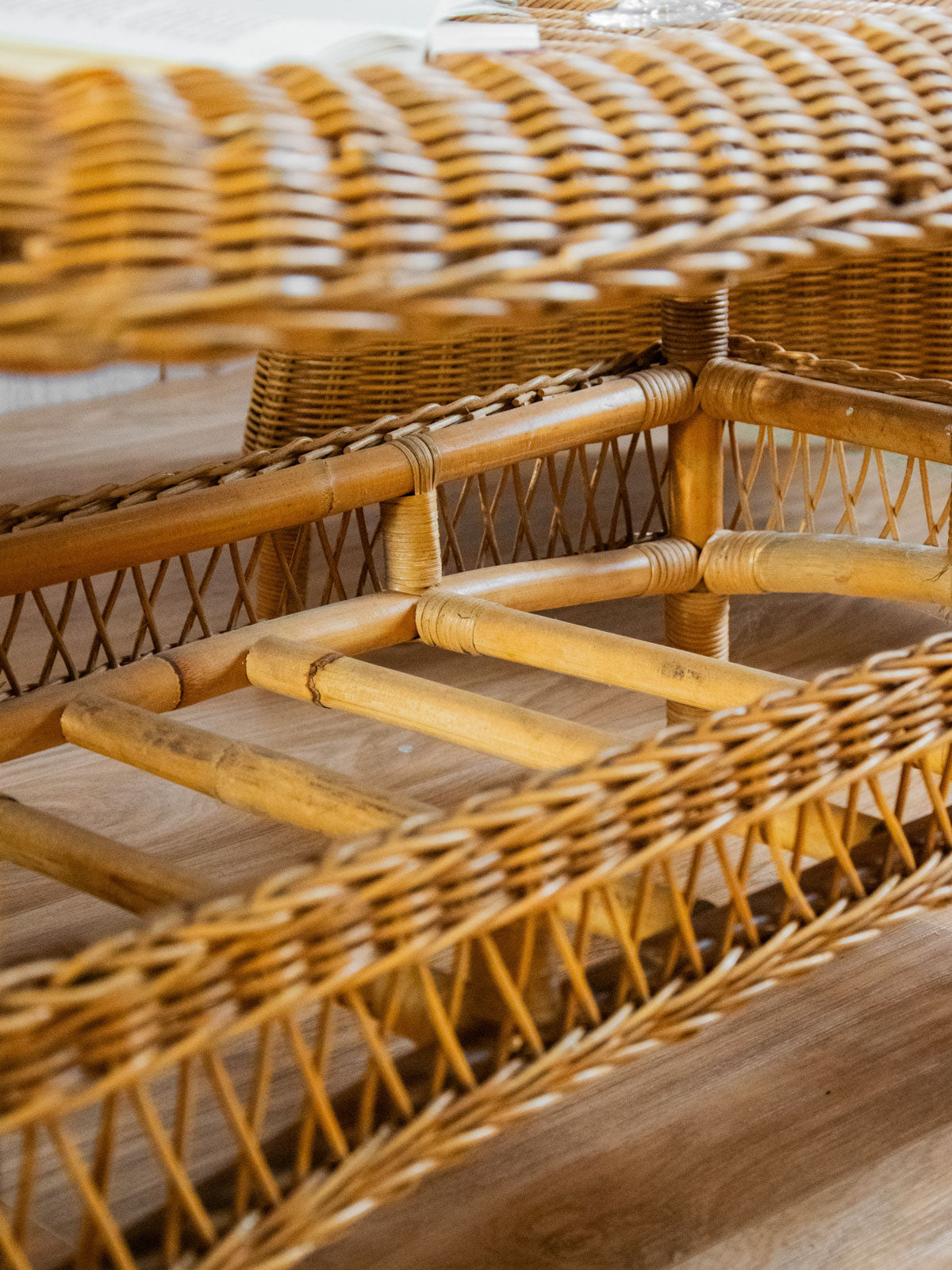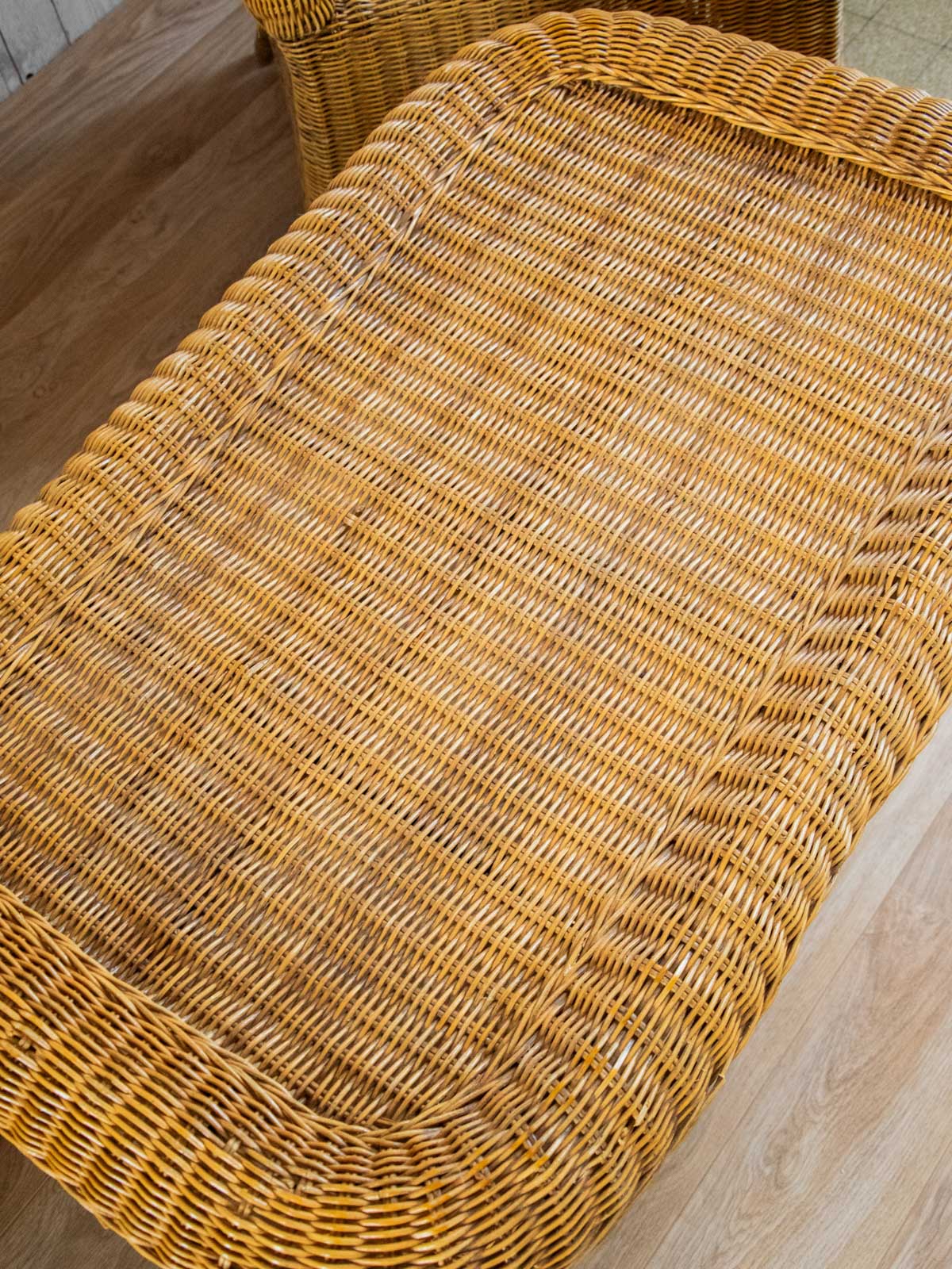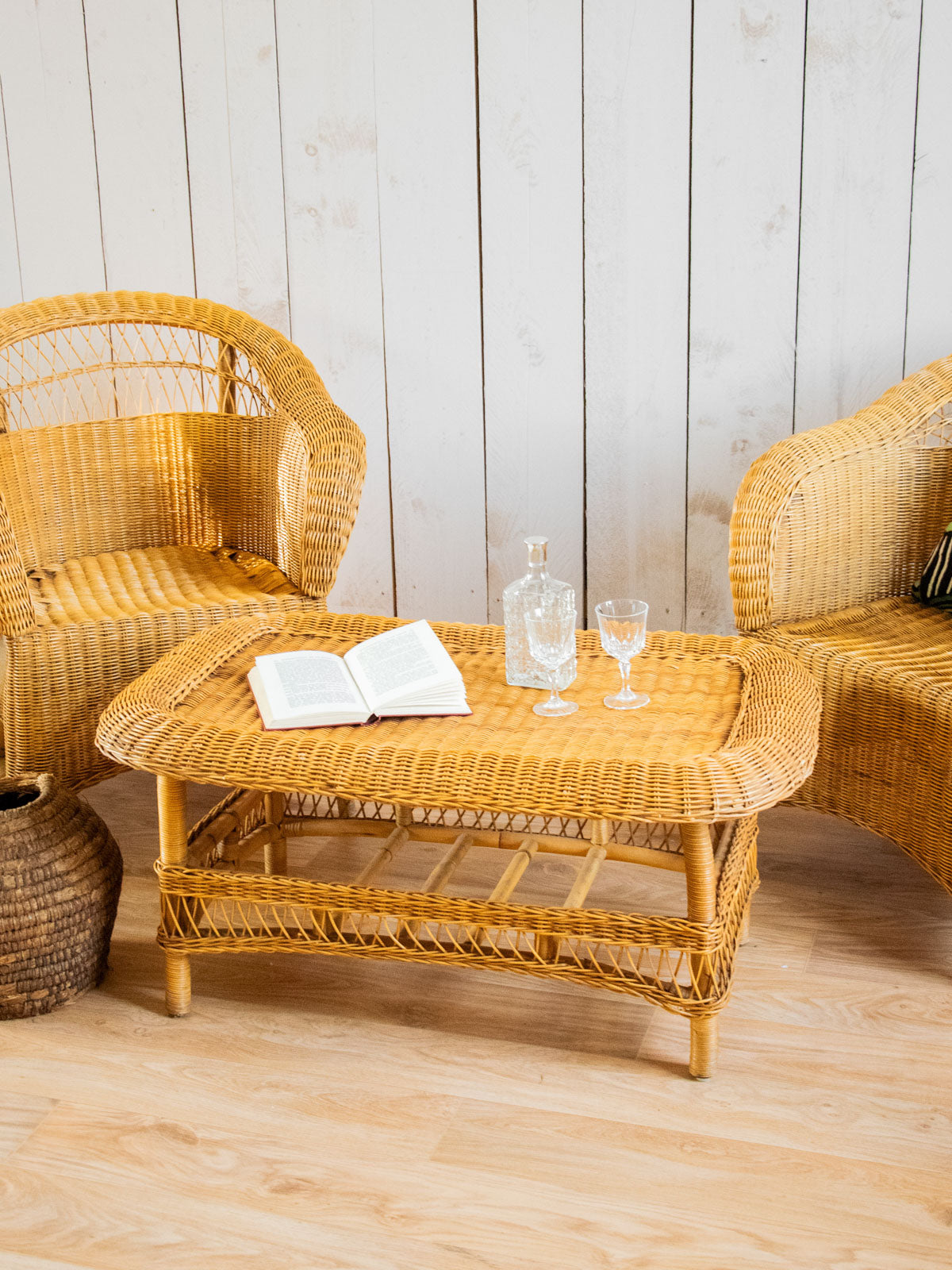 Add a touch of bohemian style and natural charm with this beautifully preserved rattan coffee table. Its airy lines and elongated silhouette create a welcoming atmosphere. The interior shelf offers ample surface space, while the absence of a top shelf provides a structured surface, perfect for displaying books and decorative objects. The open space underneath allows you to tuck away throws and baskets for discreet storage, creating a warm and relaxed ambiance.
