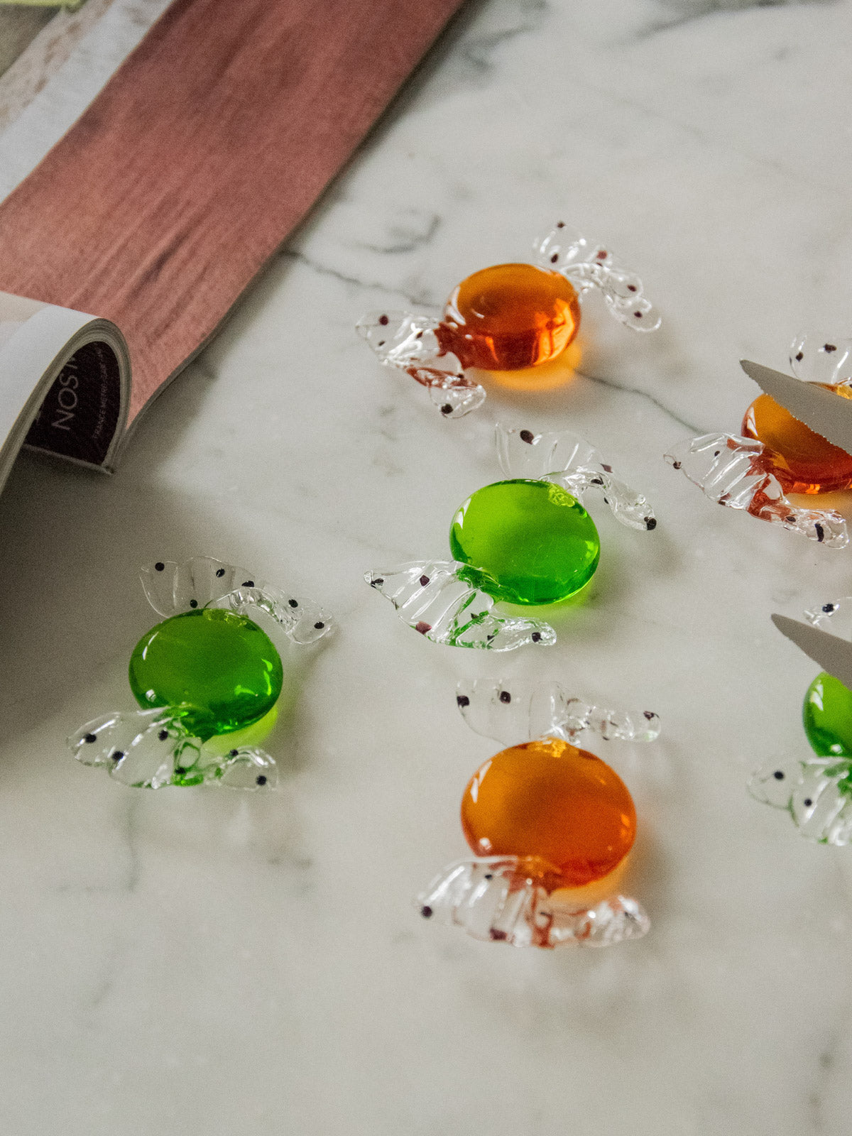 Ajoutez une note rétro-chic à votre table avec ce lot de six porte-couteaux en verre soufflé de Murano, modelés en forme de bonbon; trois teintes vertes et trois ambrées ponctuées de petits points qui captent la lumière. Leur petit format s’intègre élégamment aux dressages soignés et trouve aussi sa place comme pièces de collection ou éléments décoratifs sur un plateau. Datés des années 1970, ils dégagent une chaleur artisanale et apportent une ambiance conviviale et raffinée. En excellent état, sans accroc.
