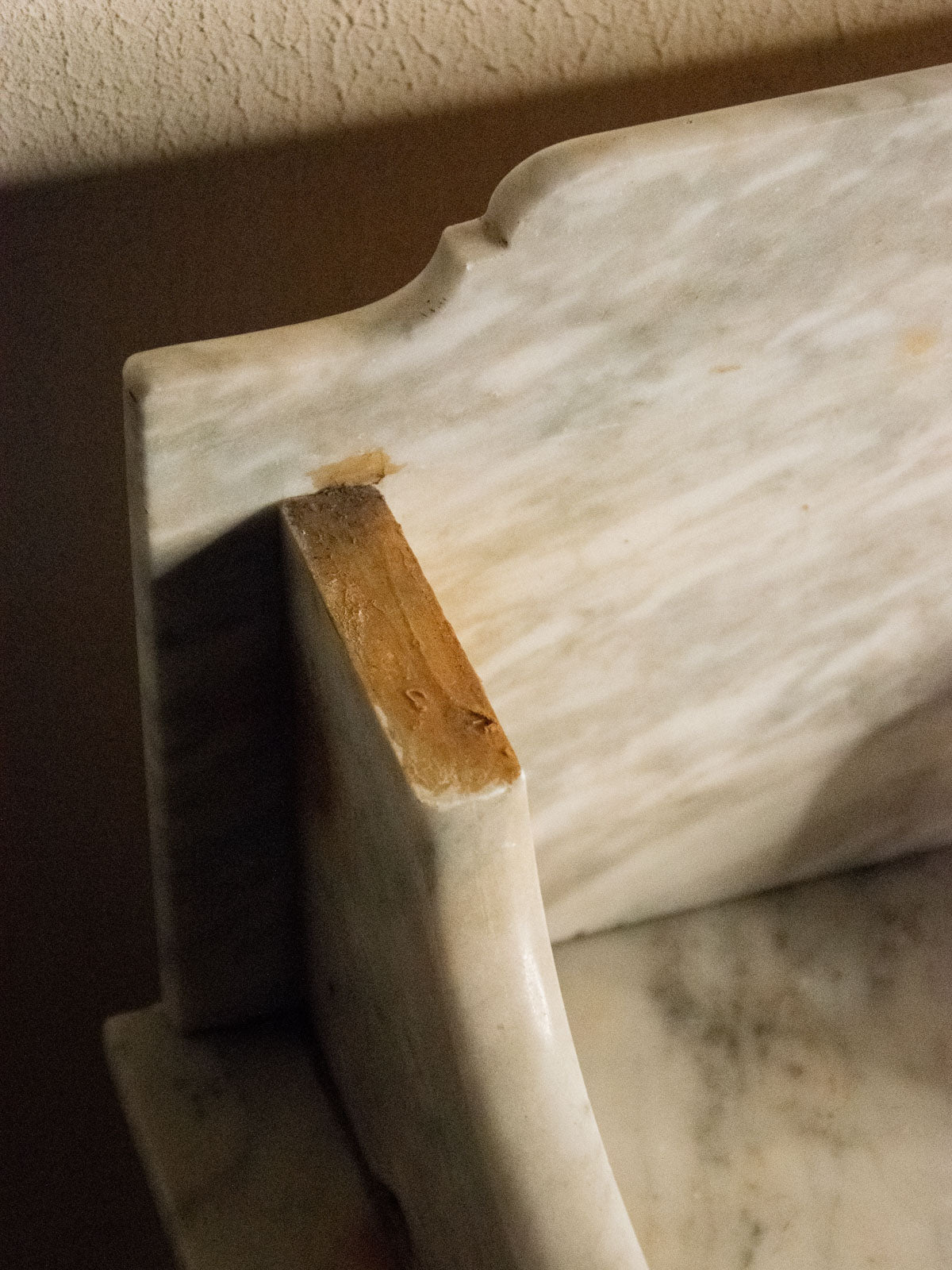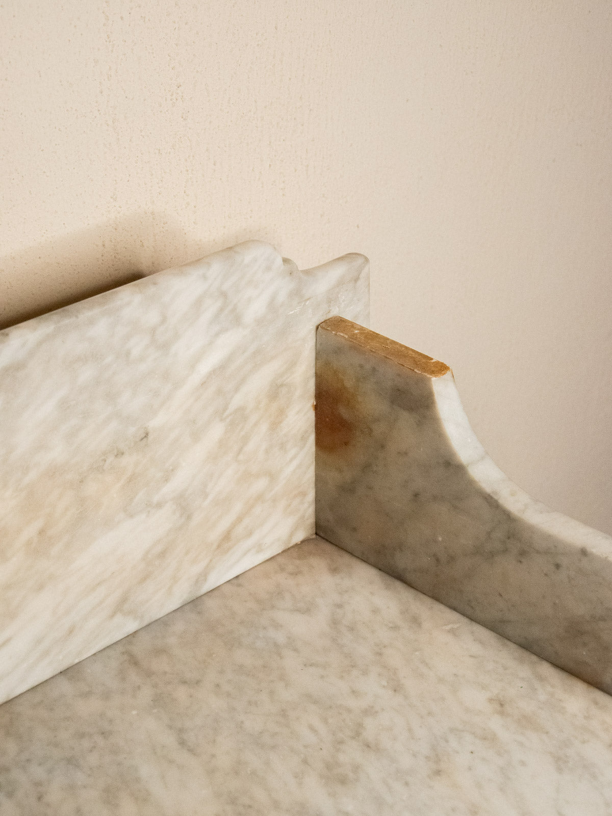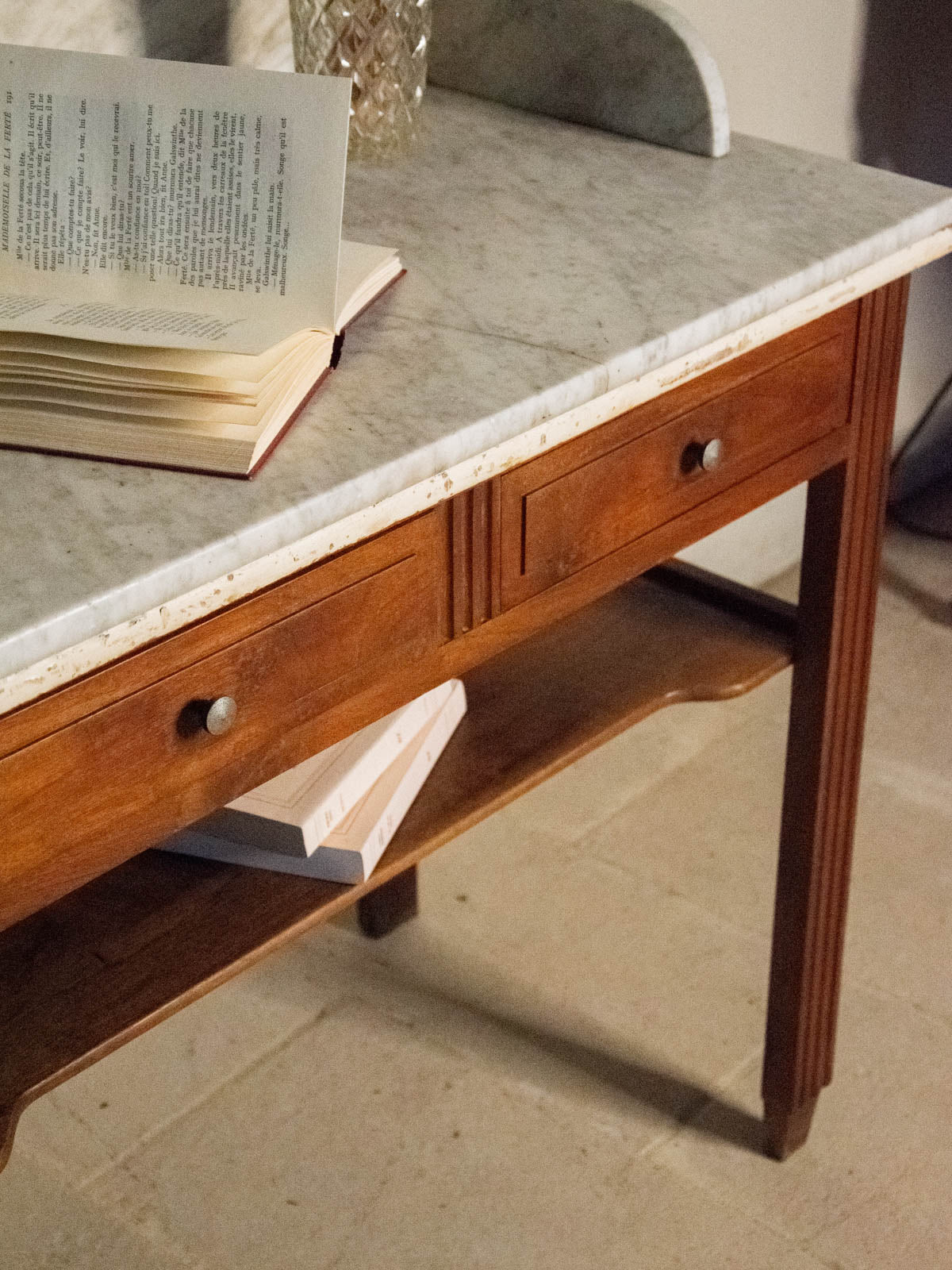 Elevate your bathroom with this vanity unit featuring a marble top resting on a warm wooden frame, accentuated by side edges that define its silhouette; its lines blend simplicity and character. Two drawers and a niche beneath the top offer convenient storage for toiletries and linens, while the combination of marble and wood creates an elegant and inviting atmosphere, perfect for a contemporary or more traditional space. Some signs of age are present.