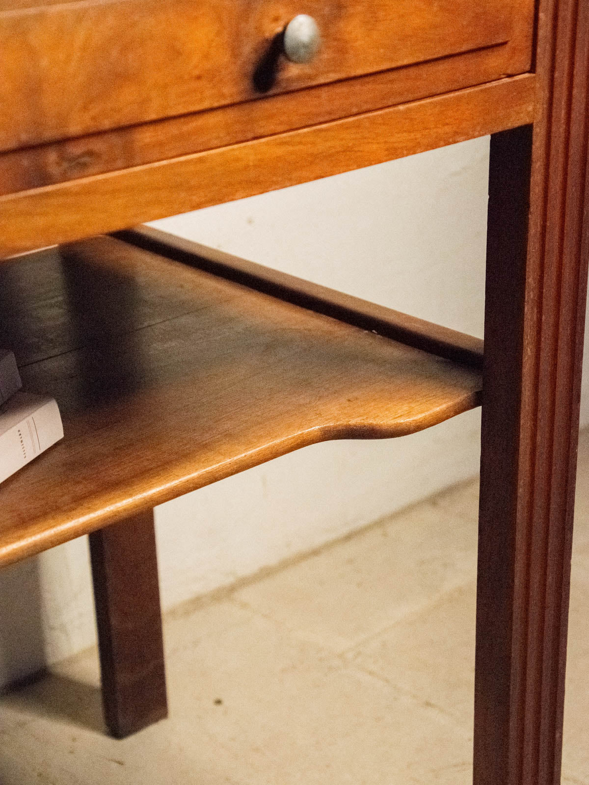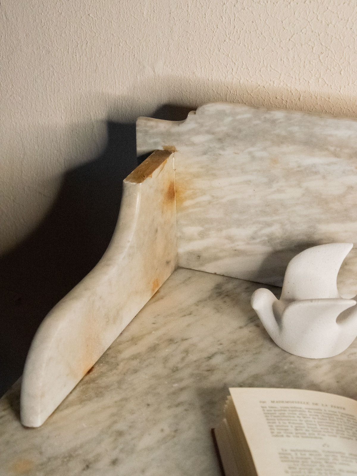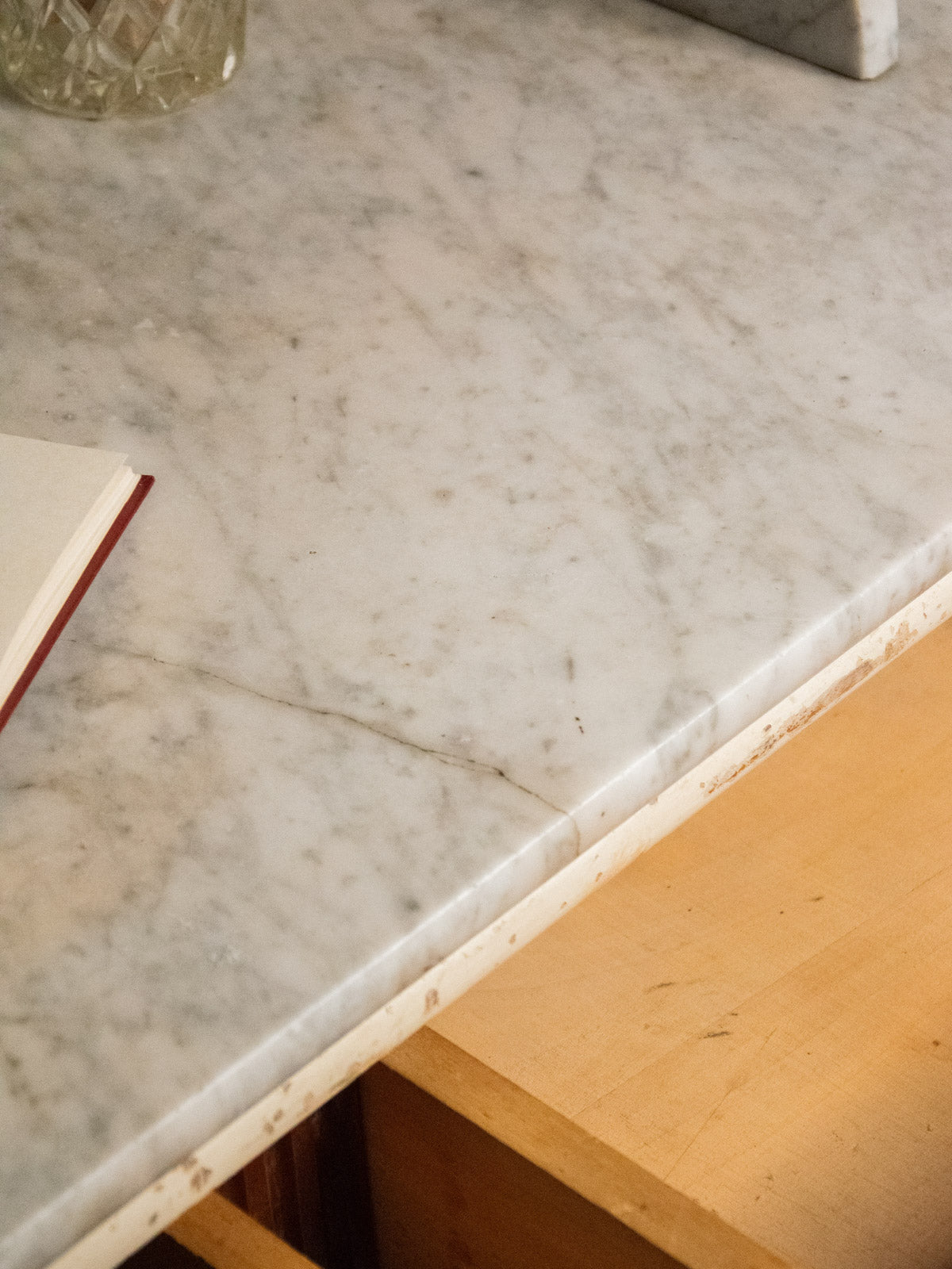 Elevate your bathroom with this vanity unit featuring a marble top resting on a warm wooden frame, accentuated by side edges that define its silhouette; its lines blend simplicity and character. Two drawers and a niche beneath the top offer convenient storage for toiletries and linens, while the combination of marble and wood creates an elegant and inviting atmosphere, perfect for a contemporary or more traditional space. Some signs of age are present.