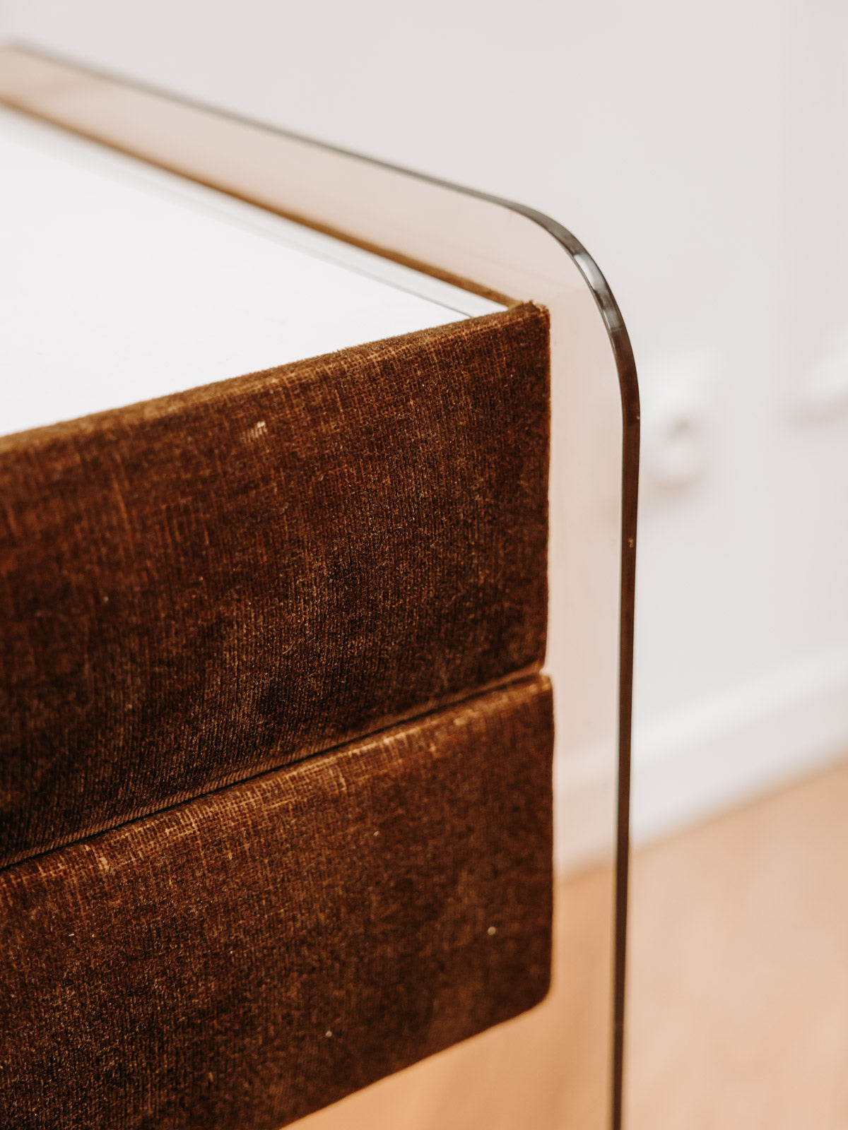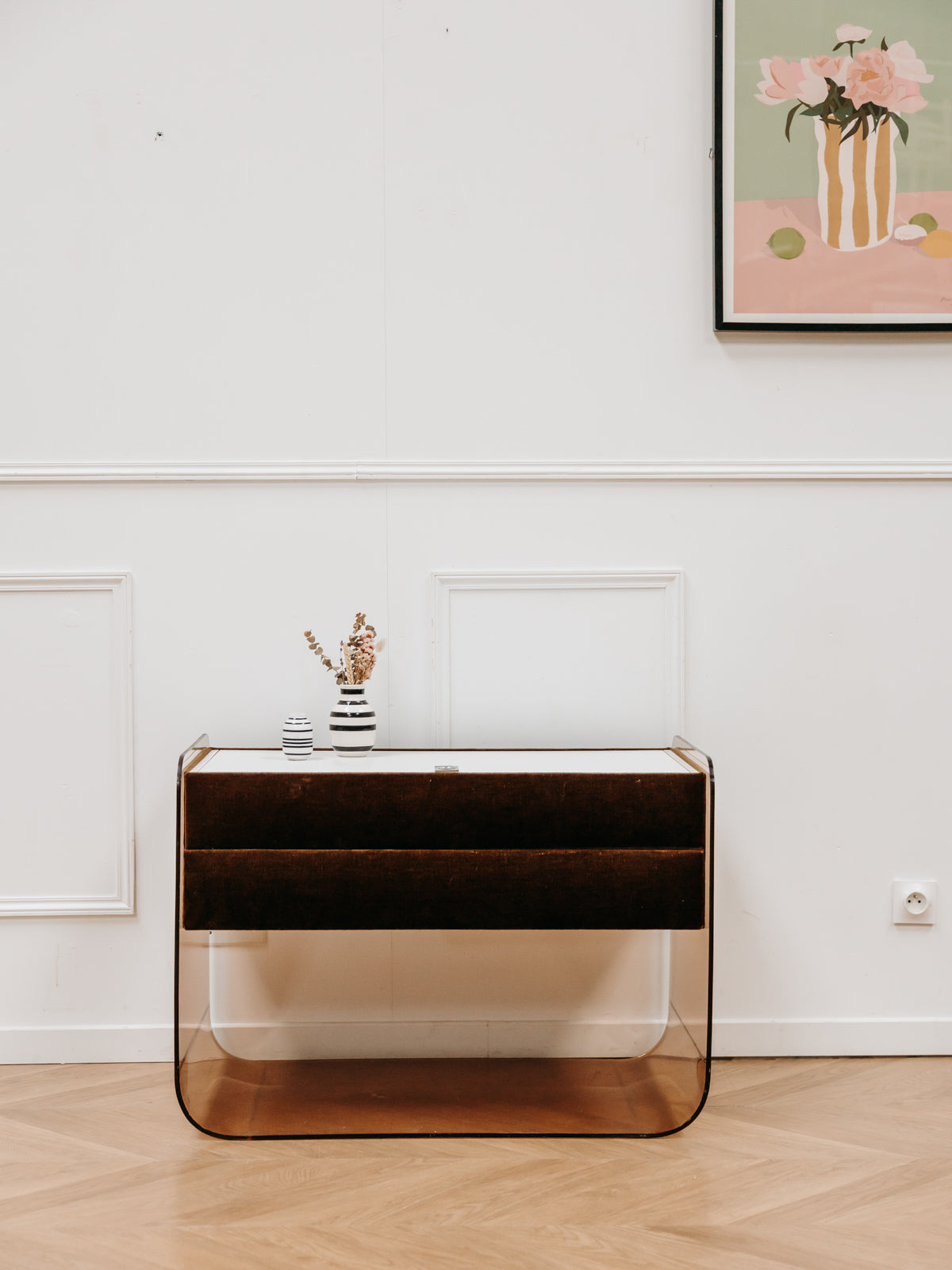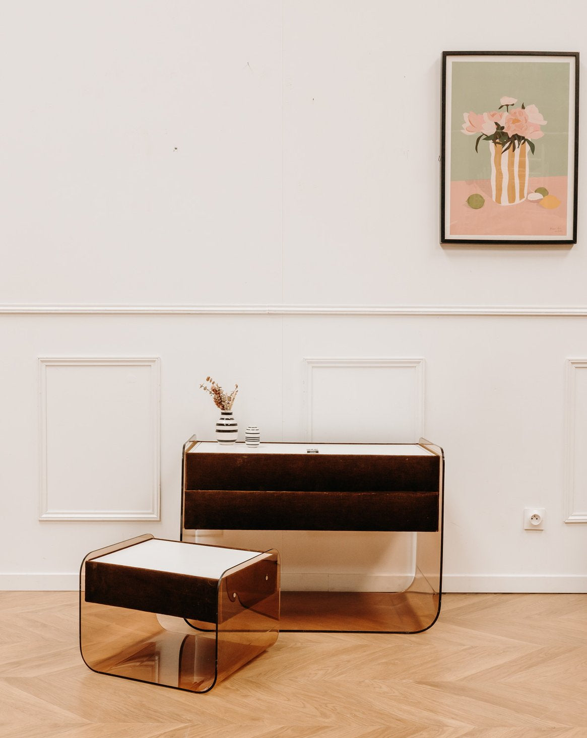 Embrace this dressing table in smoky pink plexiglass, with its delicate design that plays on transparency and the softness of the materials. Its rectangular interior mirror and top-opening top reveal two practical compartments for organizing makeup and small accessories, while the dark brown fabric upholstery adds a warm and tactile touch. Delivered with a matching small bedside table in smoky plexiglass featuring a drawer, it invites you to create a compact and elegant beauty corner.