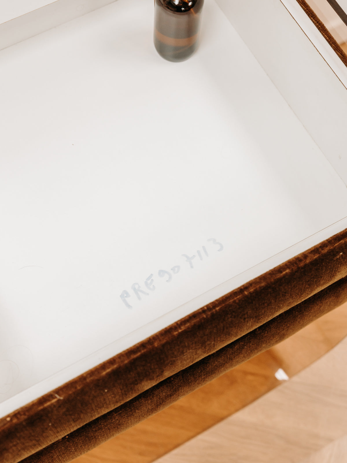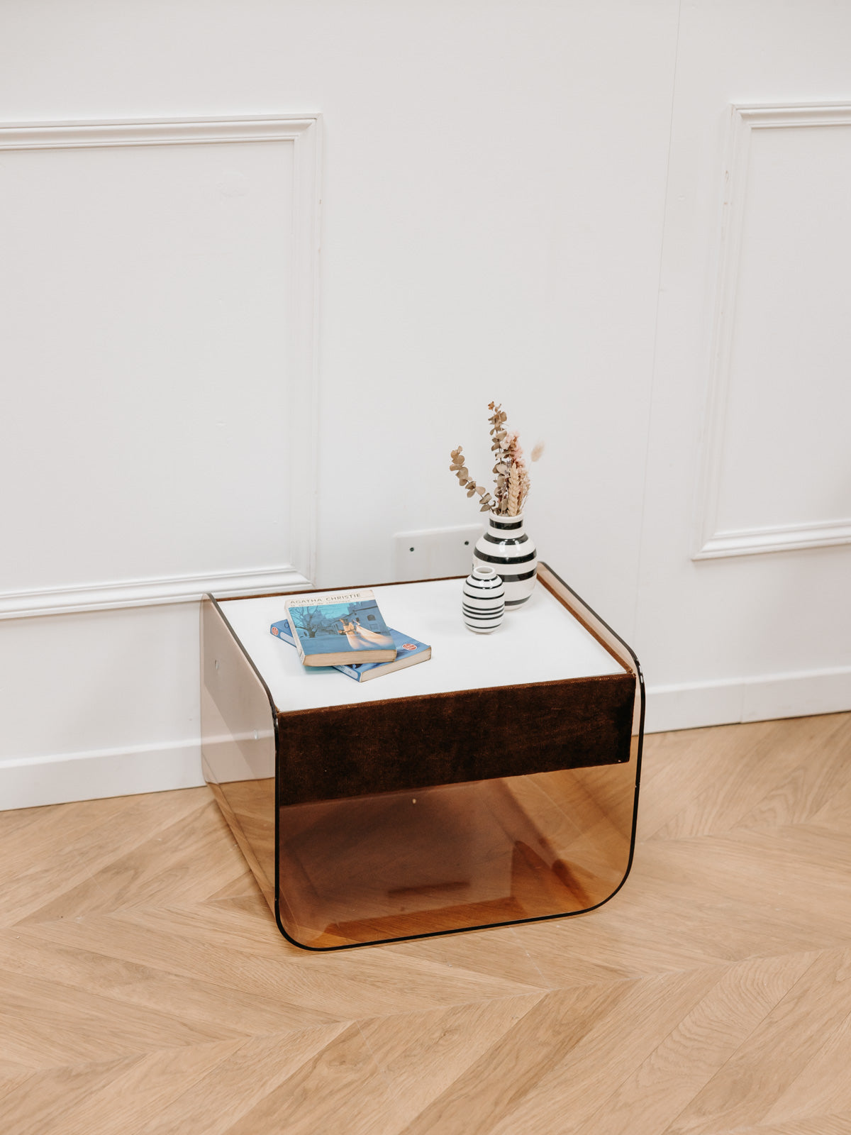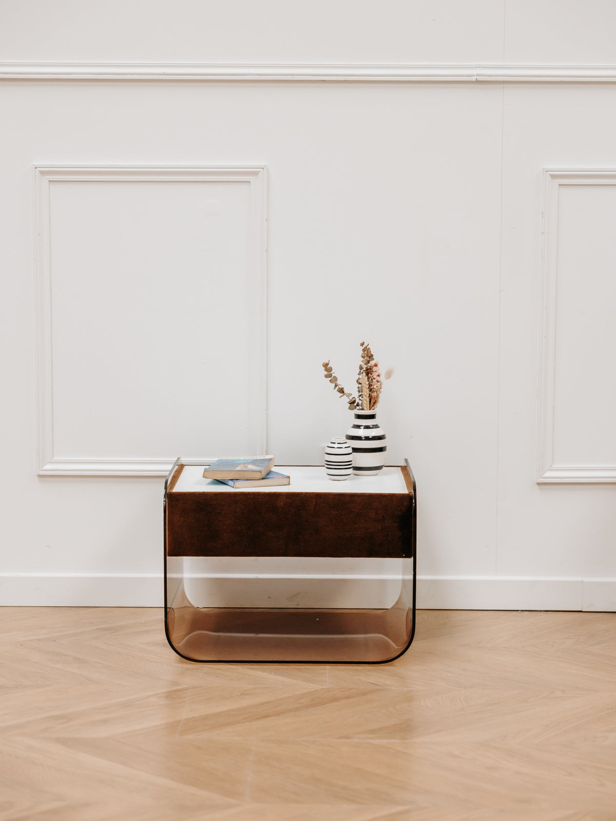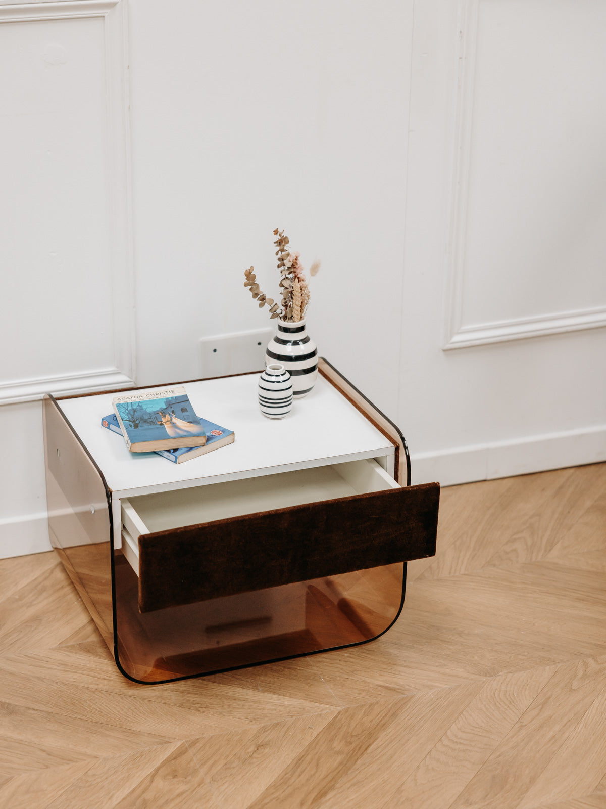 Embrace this dressing table in smoky pink plexiglass, with its delicate design that plays on transparency and the softness of the materials. Its rectangular interior mirror and top-opening top reveal two practical compartments for organizing makeup and small accessories, while the dark brown fabric upholstery adds a warm and tactile touch. Delivered with a matching small bedside table in smoky plexiglass featuring a drawer, it invites you to create a compact and elegant beauty corner.