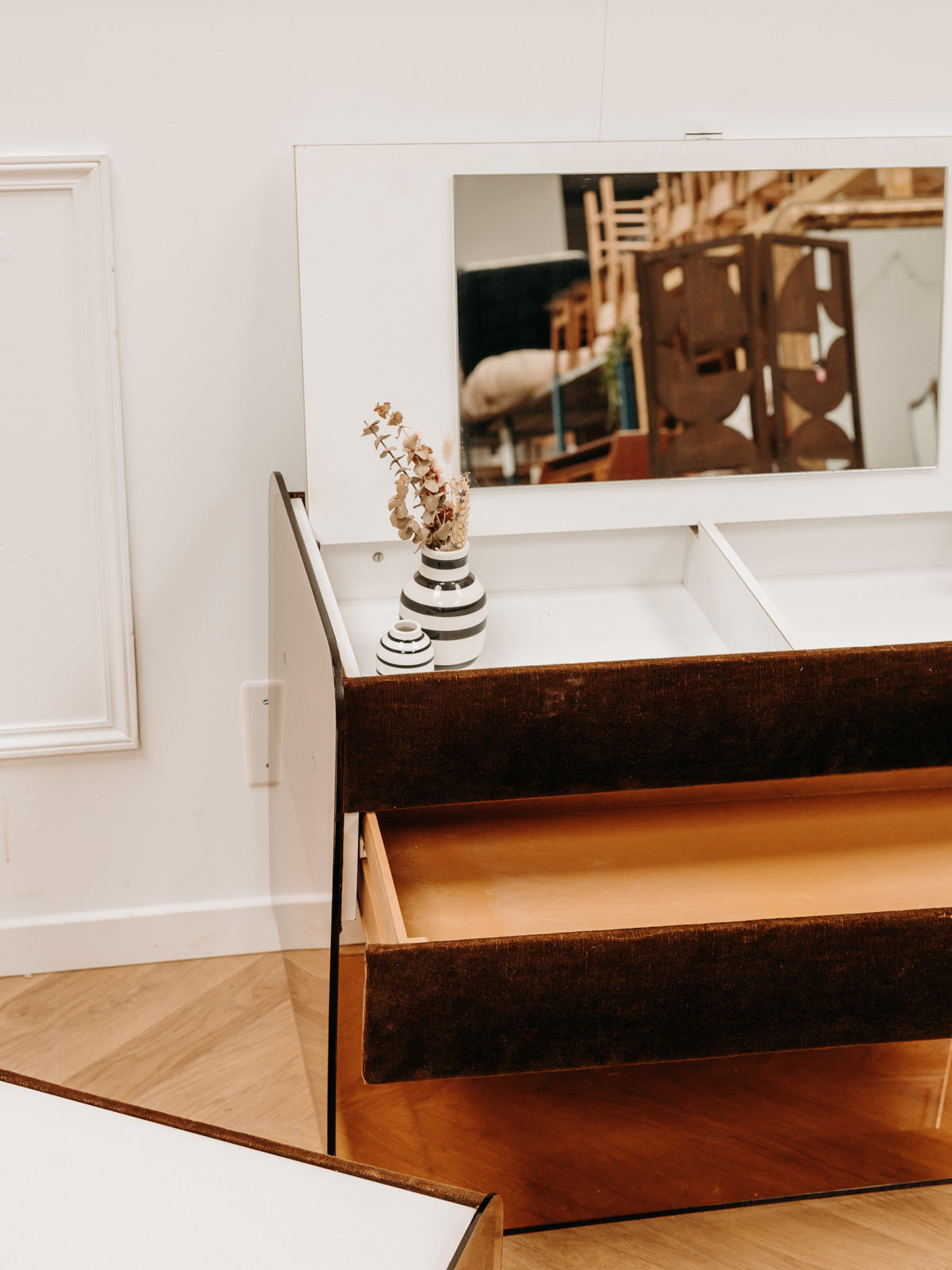 The term "dressing table" appeared at the beginning of the 20th century, although the piece of furniture itself has existed since antiquity. Composed of a tabletop, one or more mirrors, and numerous drawers, the dressing table is a storage unit, but above all, a place for getting ready, where one applies makeup, perfume, and styles one's hair. While originally this piece of furniture was suitable for both men and women, it quickly became the embodiment of feminine mystique. Indeed, dressing tables could be equipped with secret compartments for receiving intimate correspondence. Today, the dressing table is making a comeback and works beautifully in all interior styles!