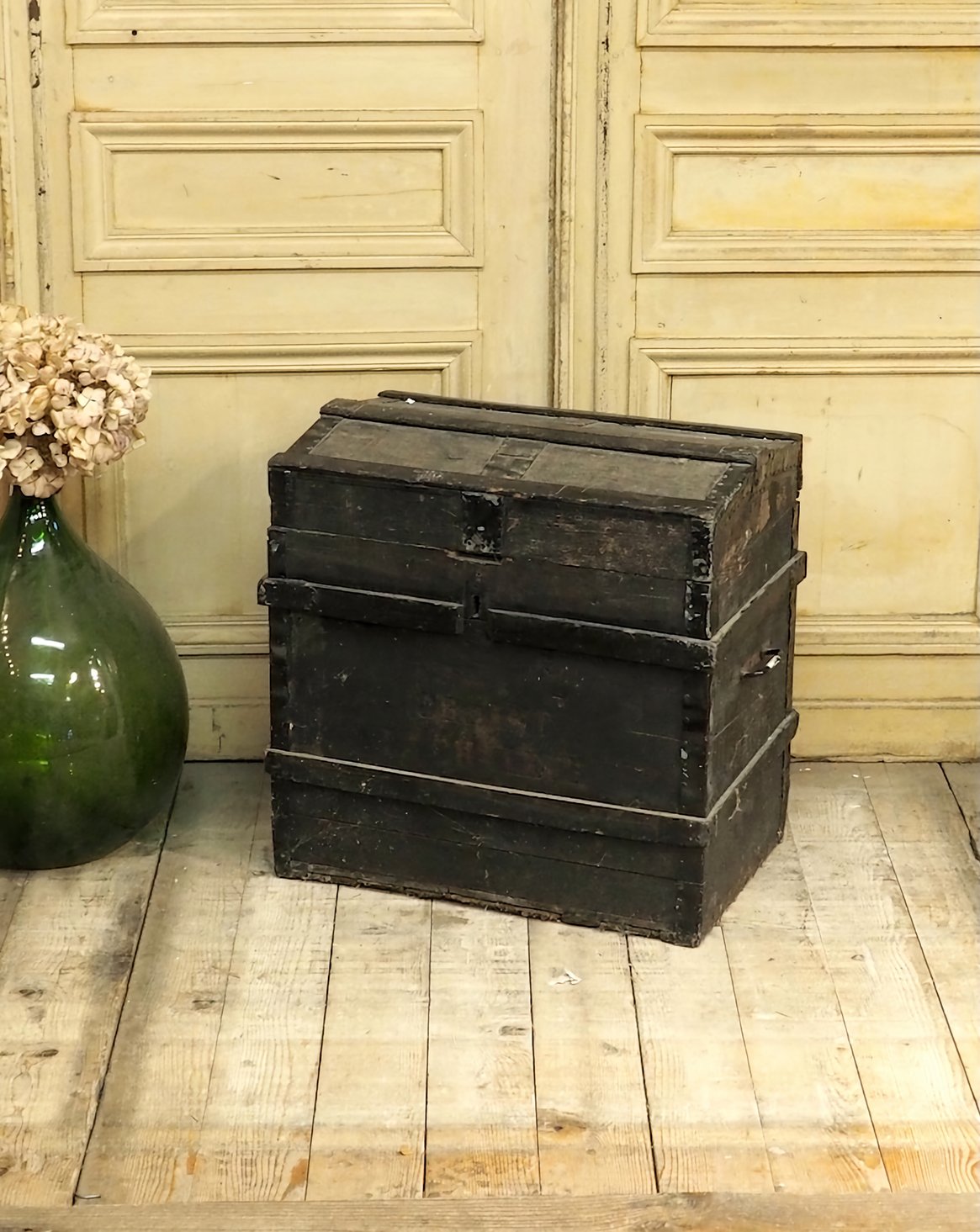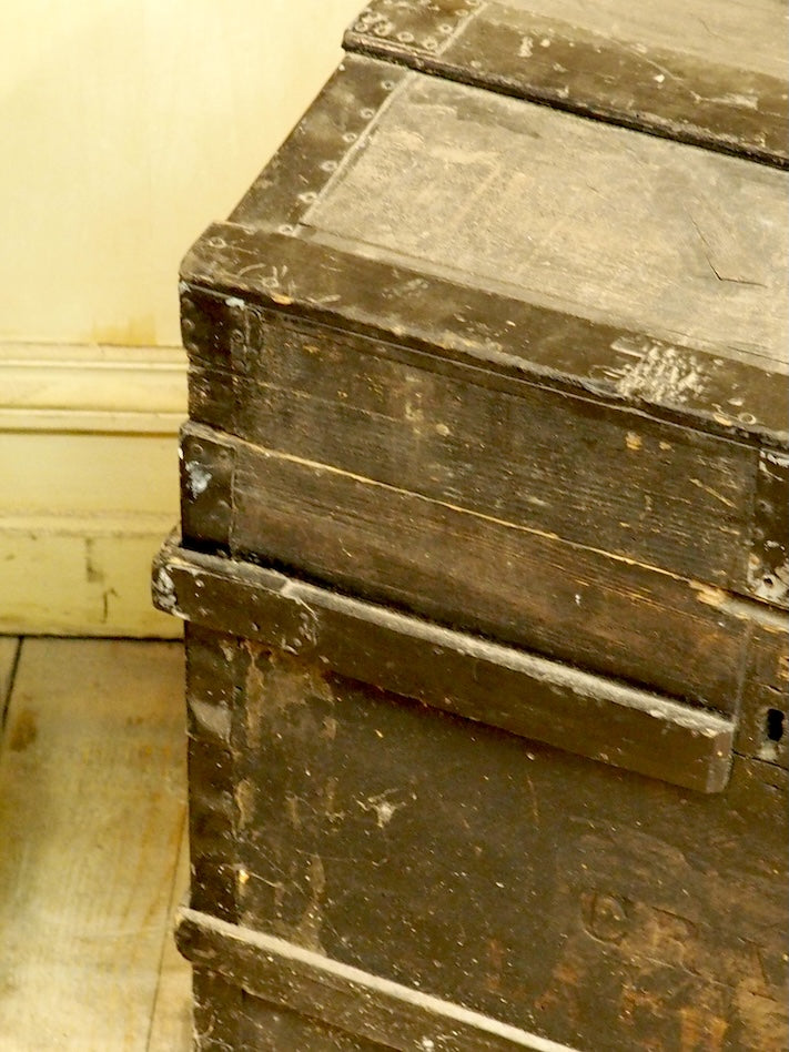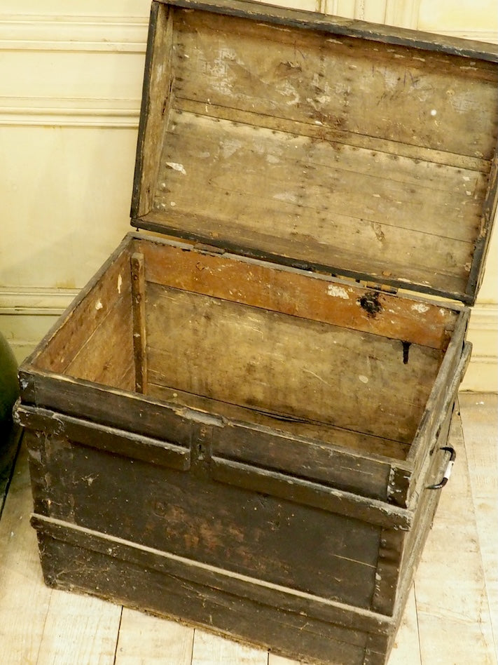 Give your home a touch of rustic charm with this handcrafted wooden trunk. Its generous lines offer practical storage for throws, linens, or bulky items. The robust construction and beautiful wood patina create a warm and natural aesthetic, perfect for a bohemian entryway or a cozy living room. Its depth allows for ample storage without visually cluttering the space. The metal clasp is missing.