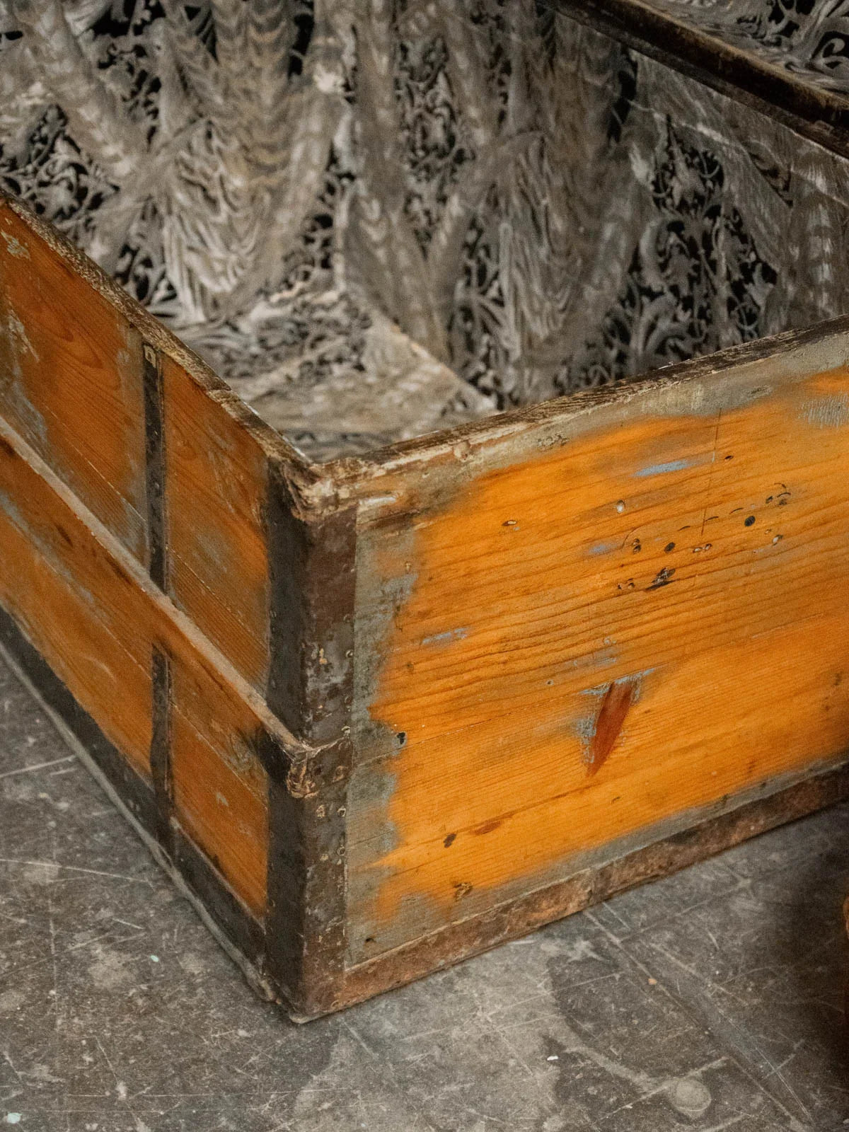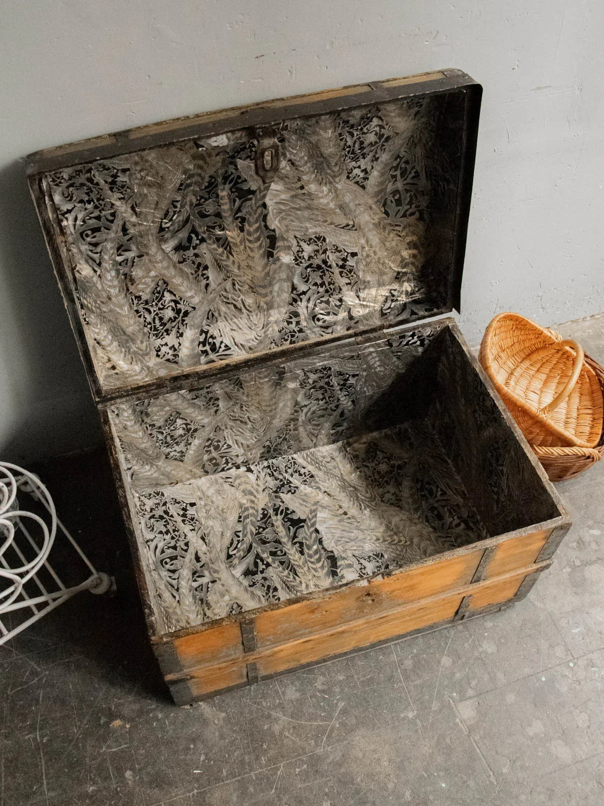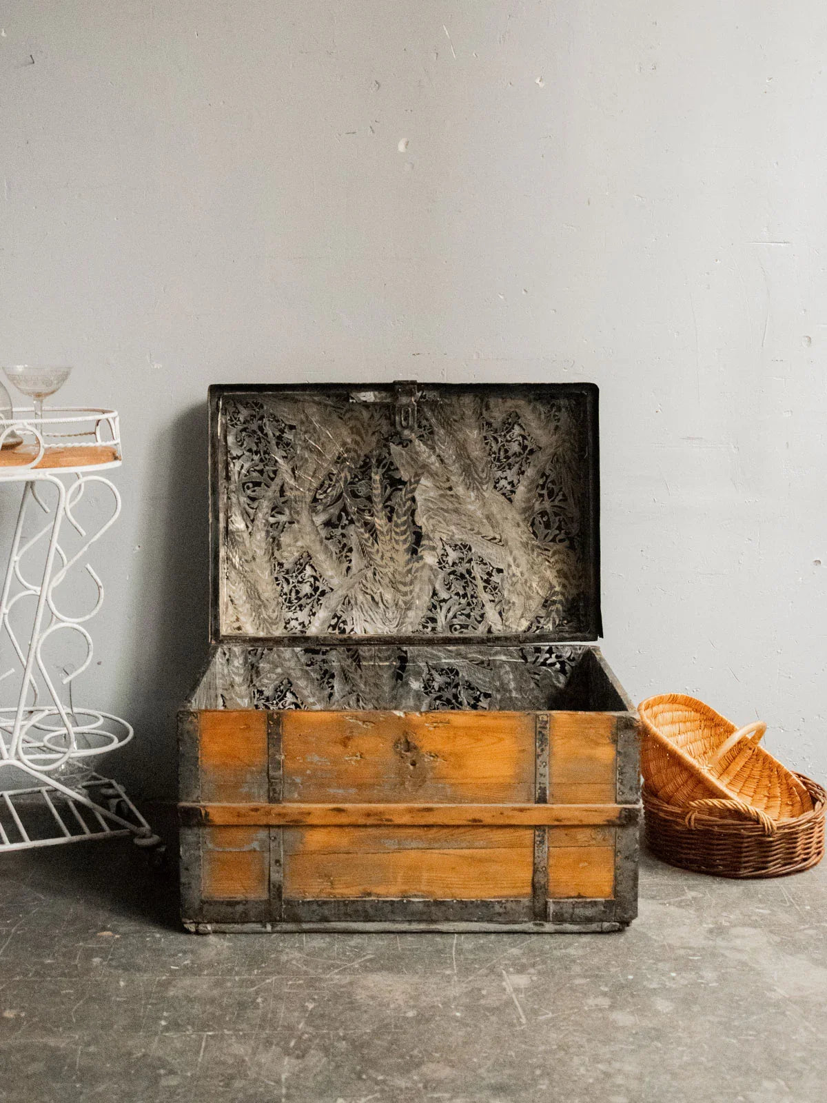 Discover this small wooden and metal chest, with its understated charm and compact silhouette, enhanced by a small antique lock that adds character. Its size makes it ideal for holding documents, fine textiles, or collectibles, while remaining easy to place on a console table or shelf. The interior, lined with a small gold and silver tapestry, brings a refined and luminous touch, creating a warm contrast with the patinated exterior and the crafted metalwork.