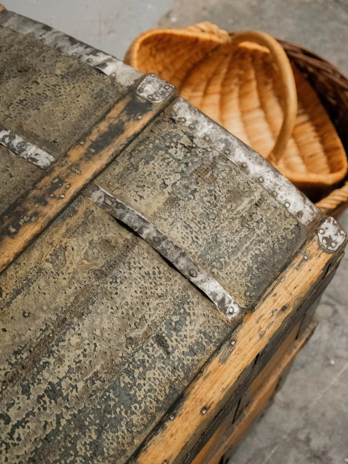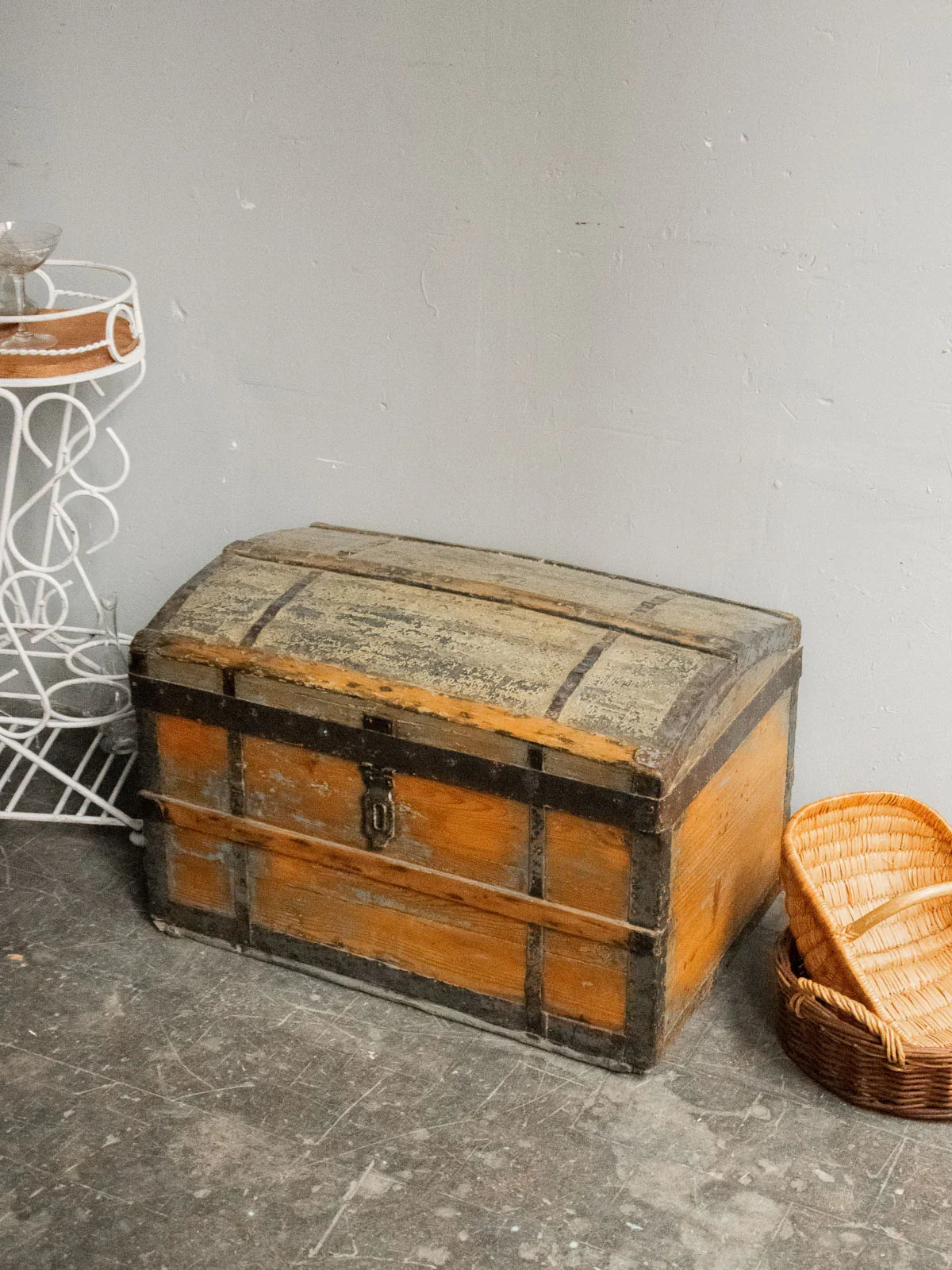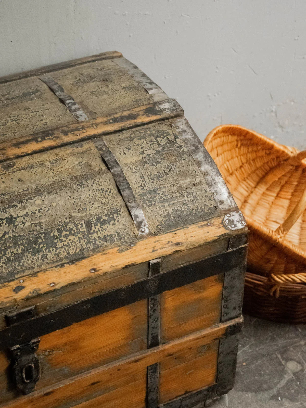 Discover this small wooden and metal chest, with its understated charm and compact silhouette, enhanced by a small antique lock that adds character. Its size makes it ideal for holding documents, fine textiles, or collectibles, while remaining easy to place on a console table or shelf. The interior, lined with a small gold and silver tapestry, brings a refined and luminous touch, creating a warm contrast with the patinated exterior and the crafted metalwork.