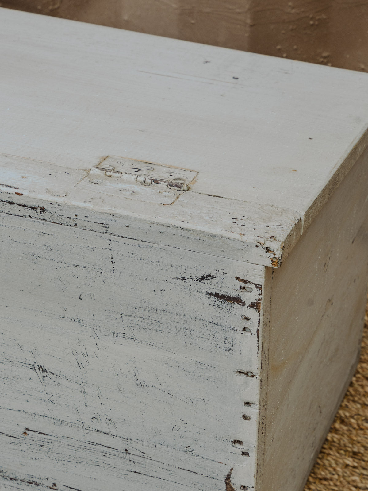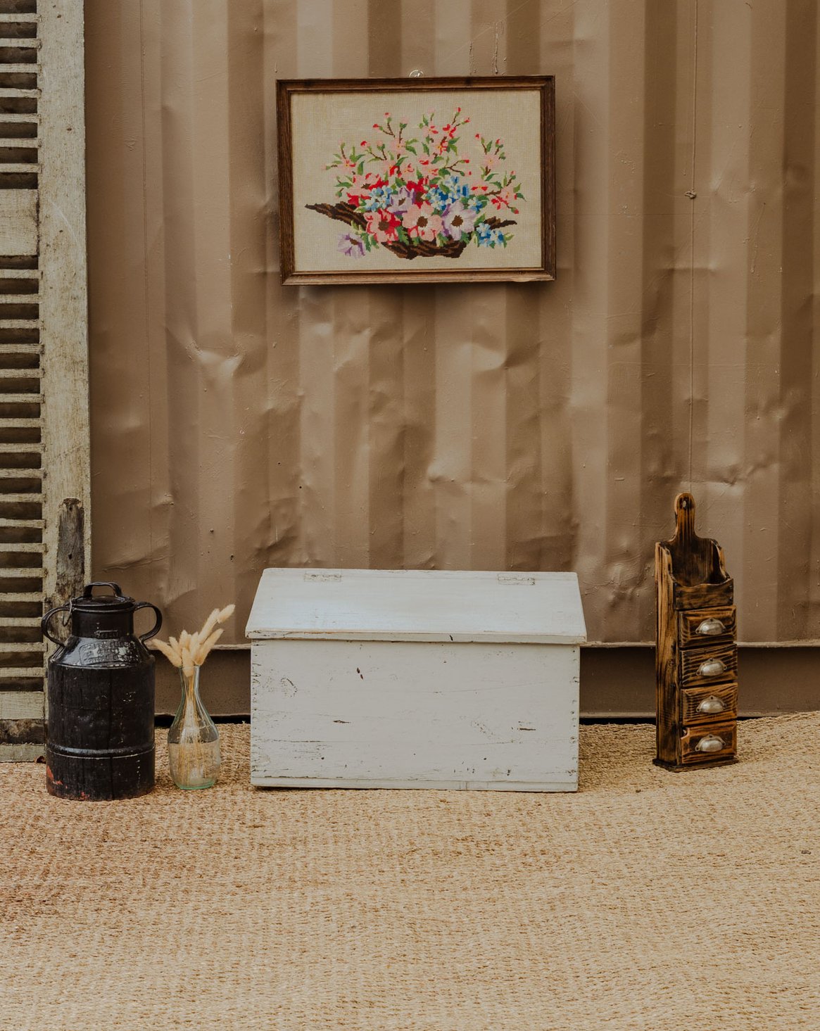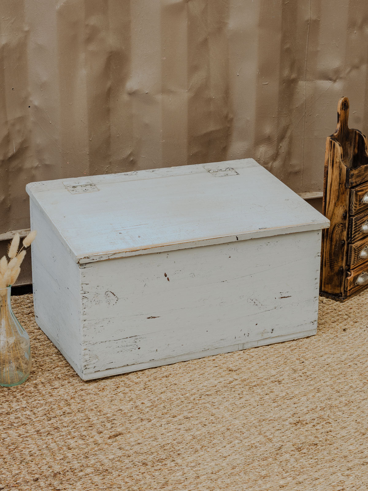 Embrace this vintage wooden trunk, painted in a delicate sky blue, which brings a soft and poetic touch to a contemporary or bohemian interior. Its generous size and wooden interior offer functional storage for blankets, games, or linens, while remaining an elegant decorative piece. Its patina and slightly worn paint tell a story that enriches the room's warm atmosphere. Some signs of age are present.