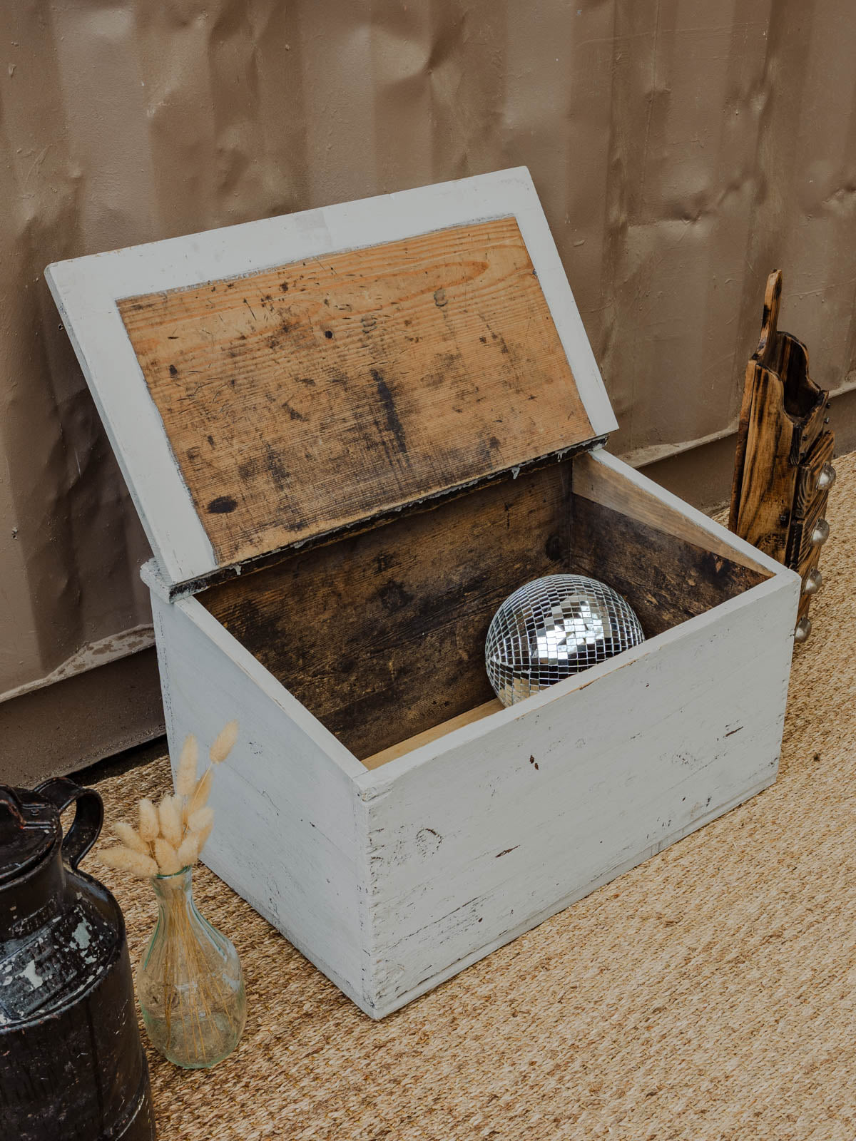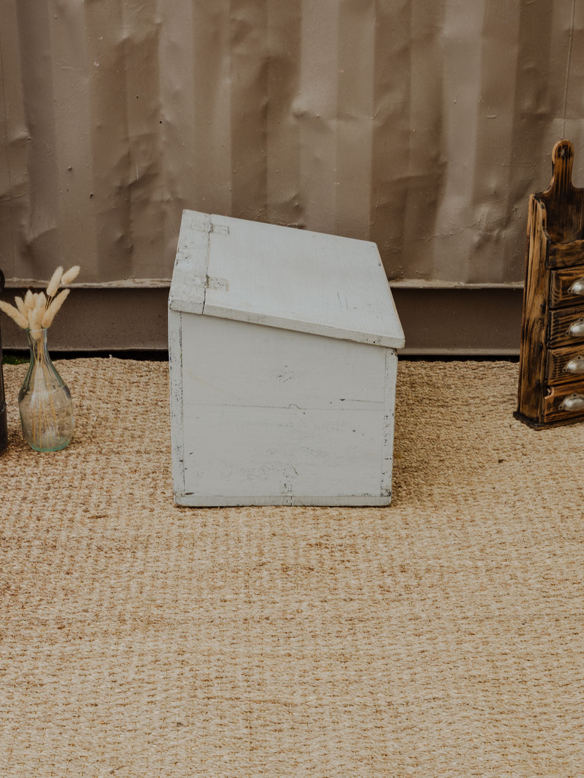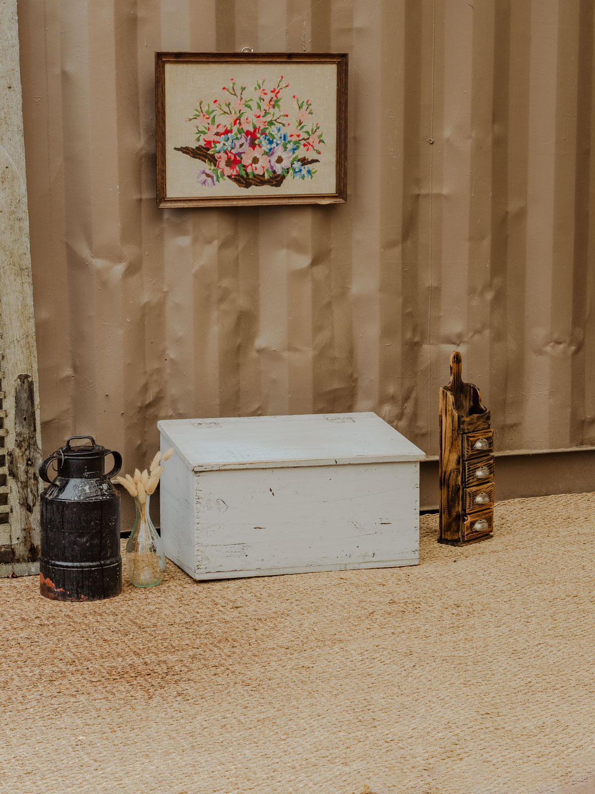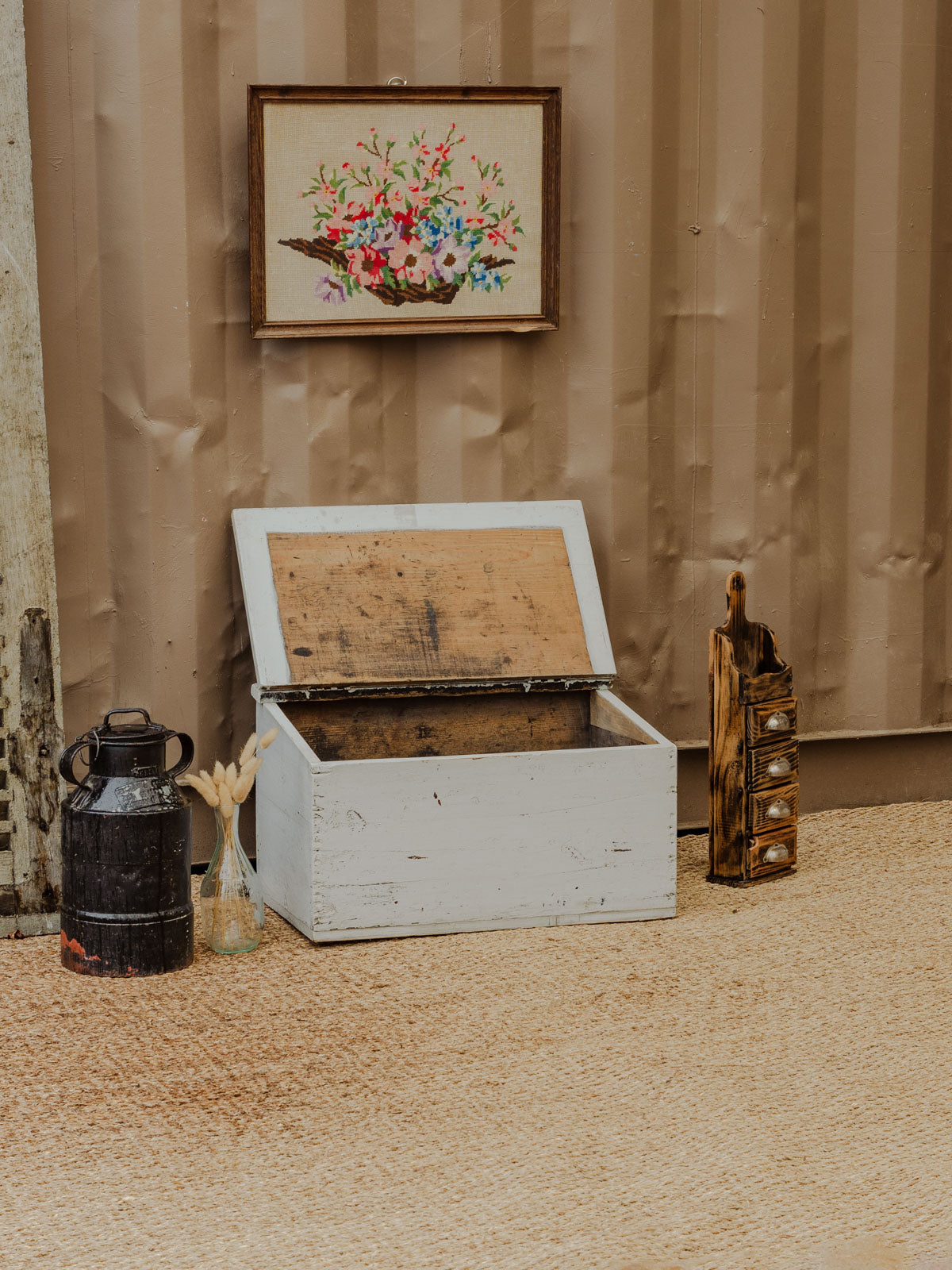 Embrace this vintage wooden trunk, painted in a delicate sky blue, which brings a soft and poetic touch to a contemporary or bohemian interior. Its generous size and wooden interior offer functional storage for blankets, games, or linens, while remaining an elegant decorative piece. Its patina and slightly worn paint tell a story that enriches the room's warm atmosphere. Some signs of age are present.