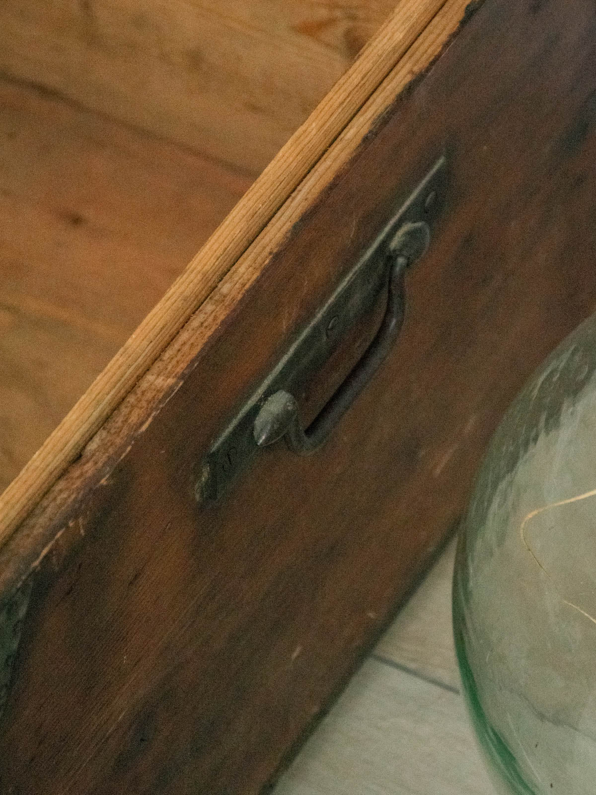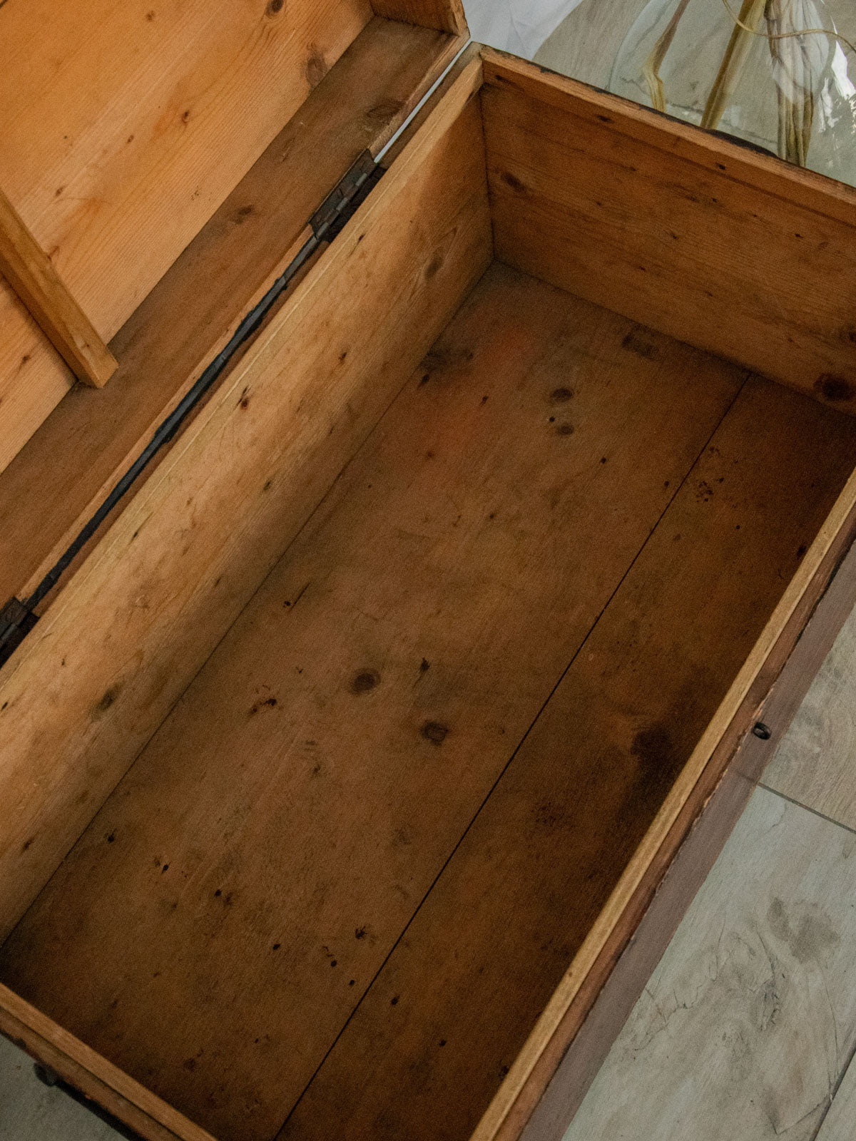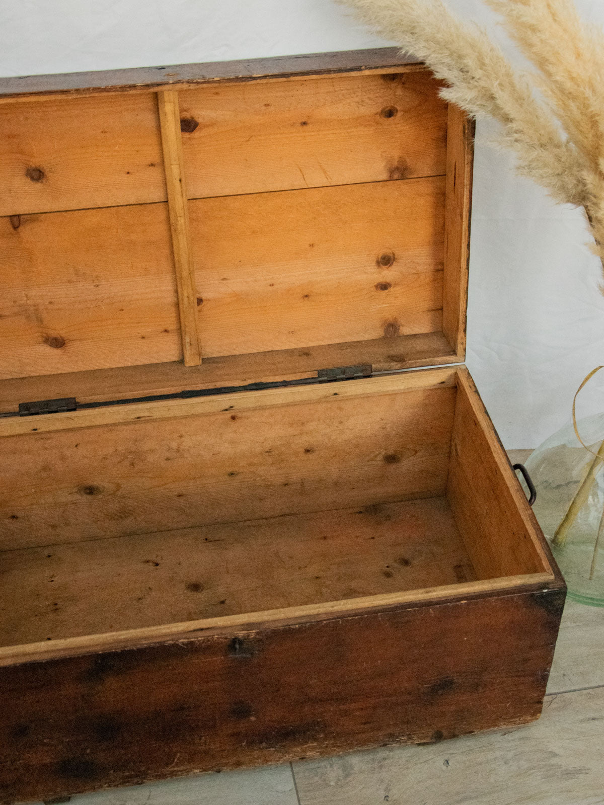 Embrace this wooden chest with metal reinforcements, a piece that combines sturdiness and character. Its two metal handles and protected corners give it a structured look, ideal as a coffee table or side bar to create a warm and inviting atmosphere. Its generous size allows you to store linens, dishes, or accessories while also providing a practical surface for serving or displaying items. Minor signs of age are present, and the hanging strap is missing.