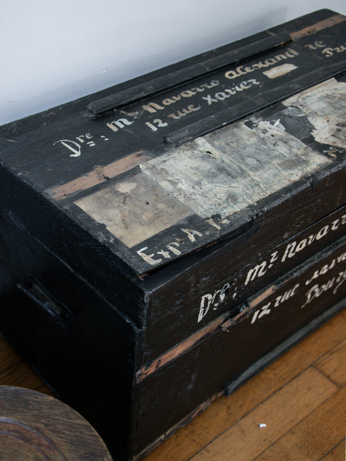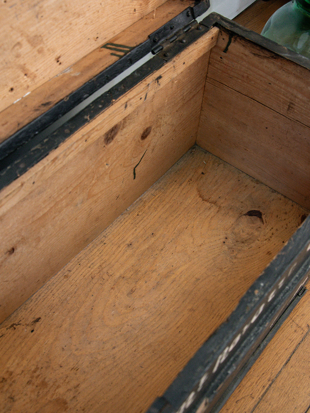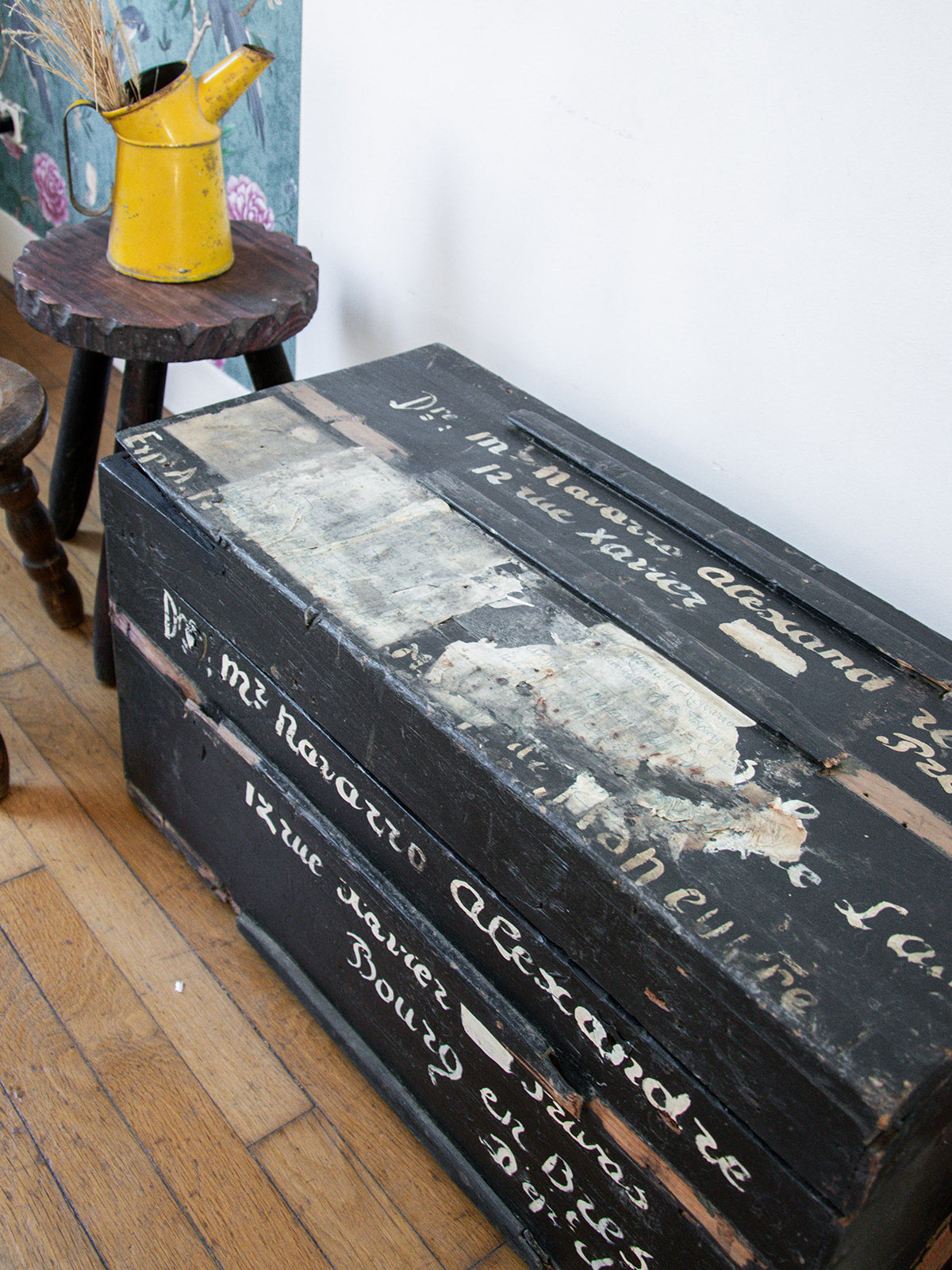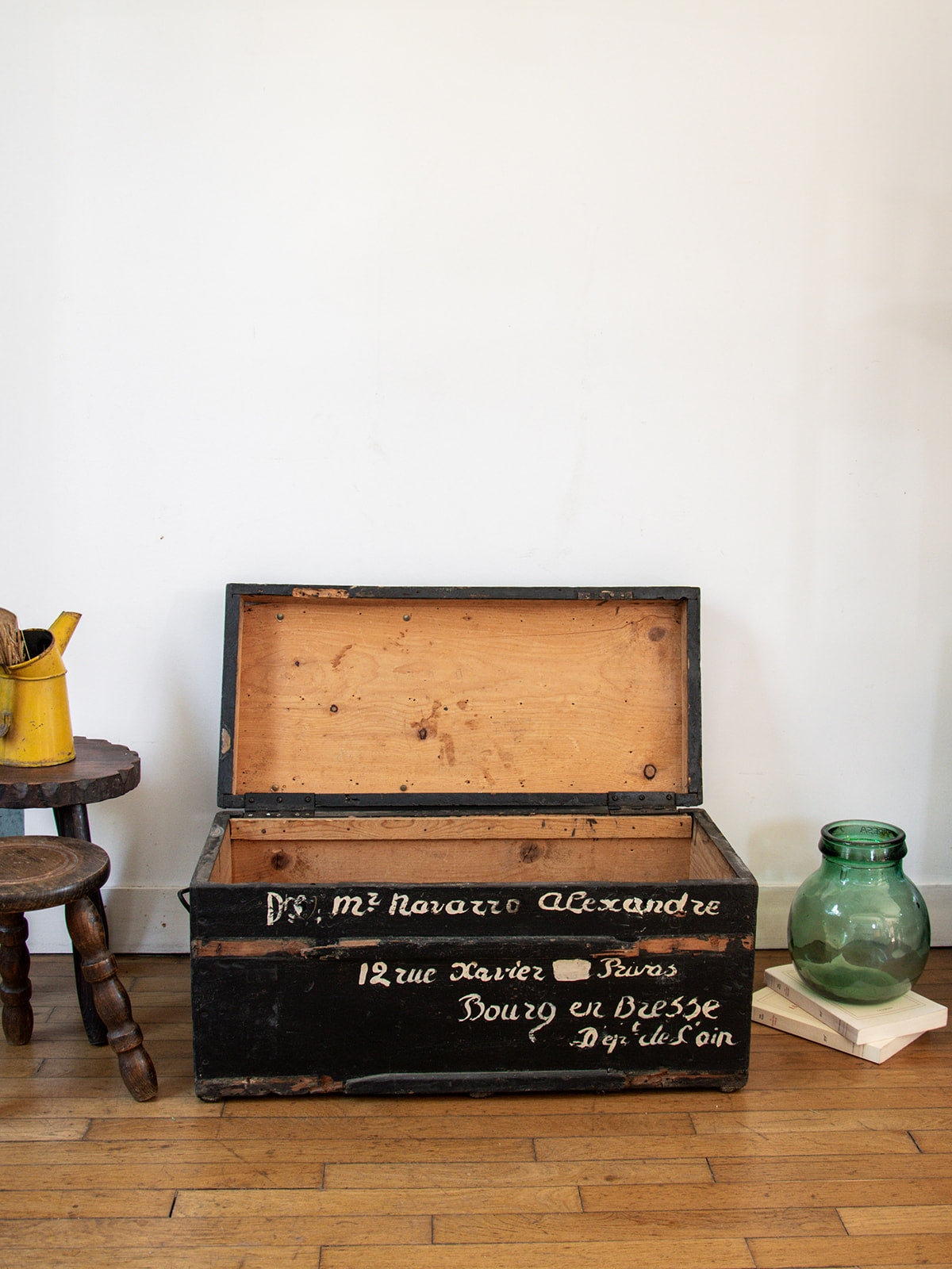 Discover this black wooden travel trunk, a true curio with its original writing that bears witness to an authentic past. Although some strips are missing on the front and top (see photos), it retains a unique and captivating charm. Its raw, very clean interior offers ample storage space while remaining faithful to its vintage style. The metal handles on the sides add an industrial and functional touch.