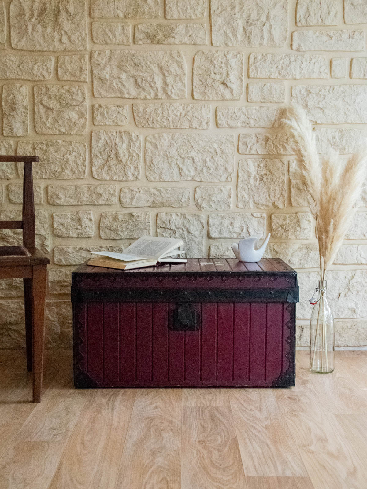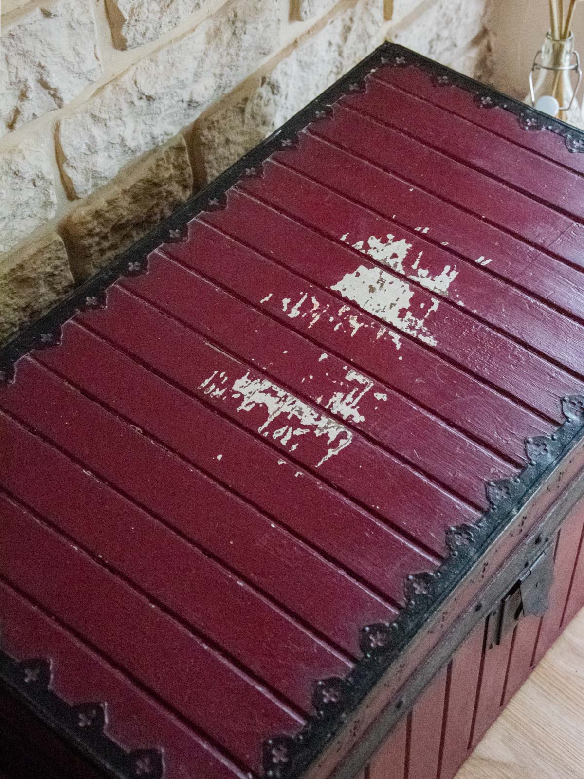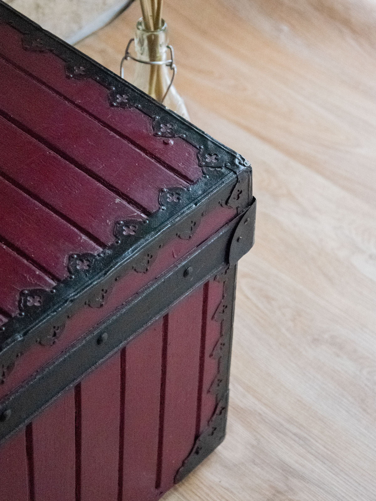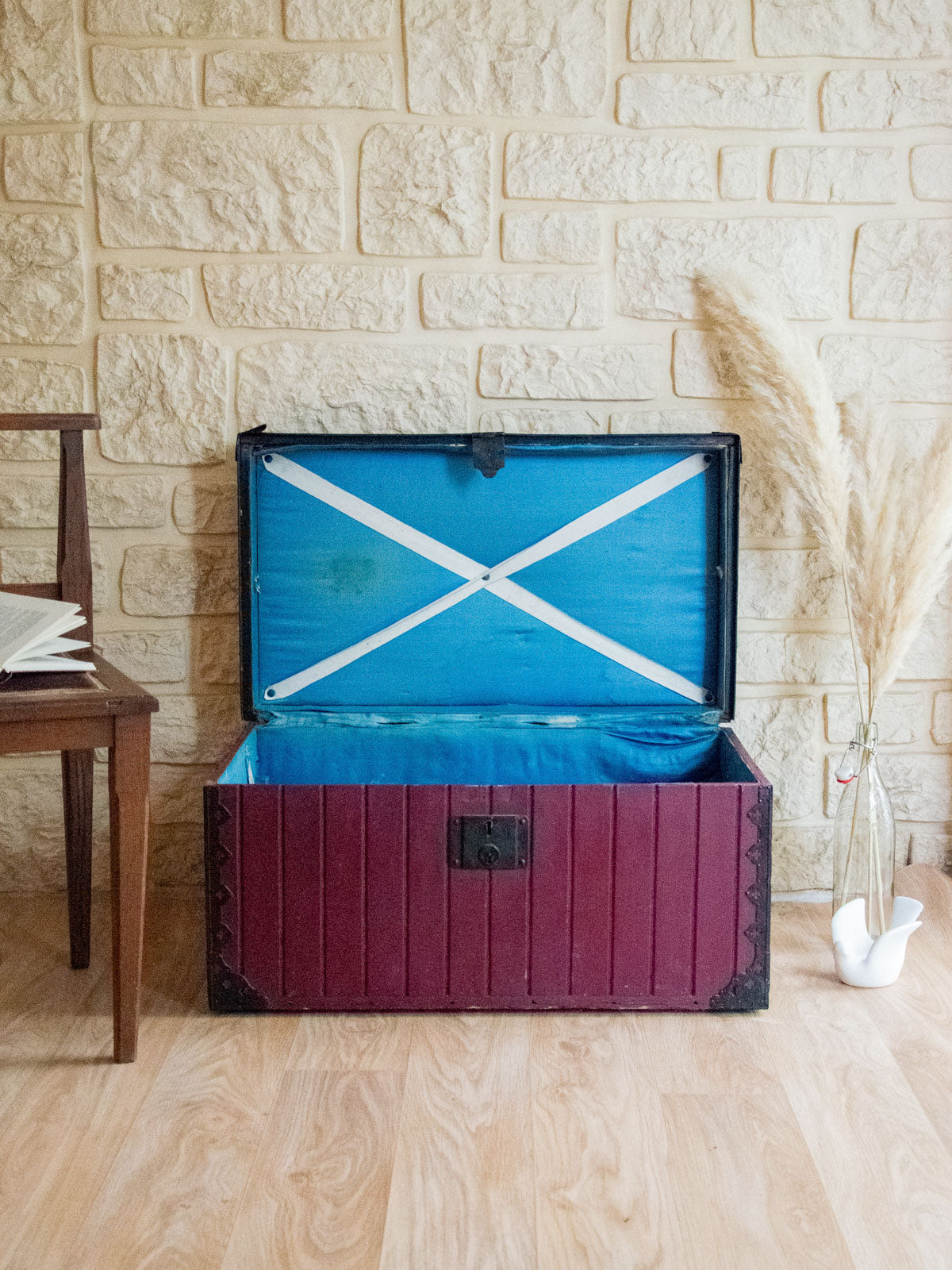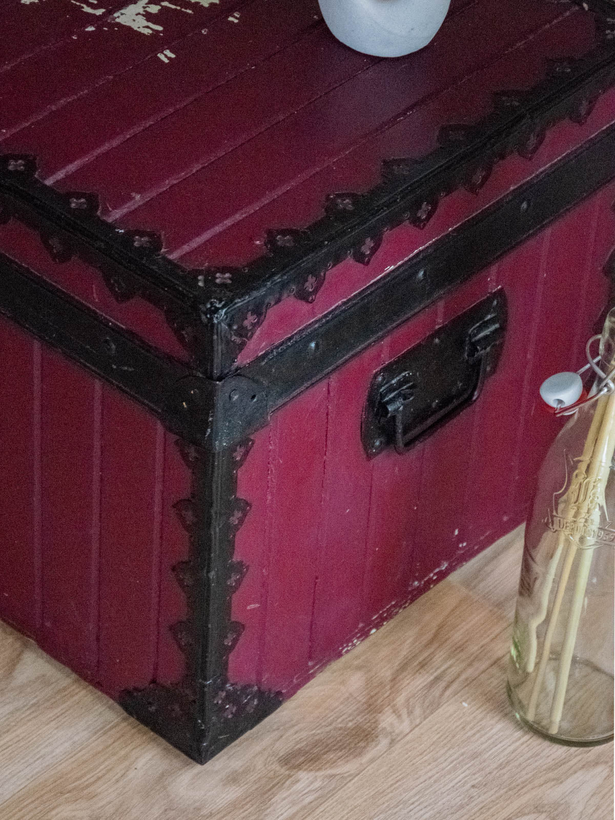 Discover this wooden chest on casters, finished in a deep burgundy accented by black metal trim for an elegant industrial look. Its two side handles make it easy to move, while the blue interior offers a striking and bright contrast, perfect for storing blankets, games, or files, and can also be used as a mobile side table. The paint on the top is scratched, revealing the undercoat and adding a touch of authentic character. Signs of age are present.