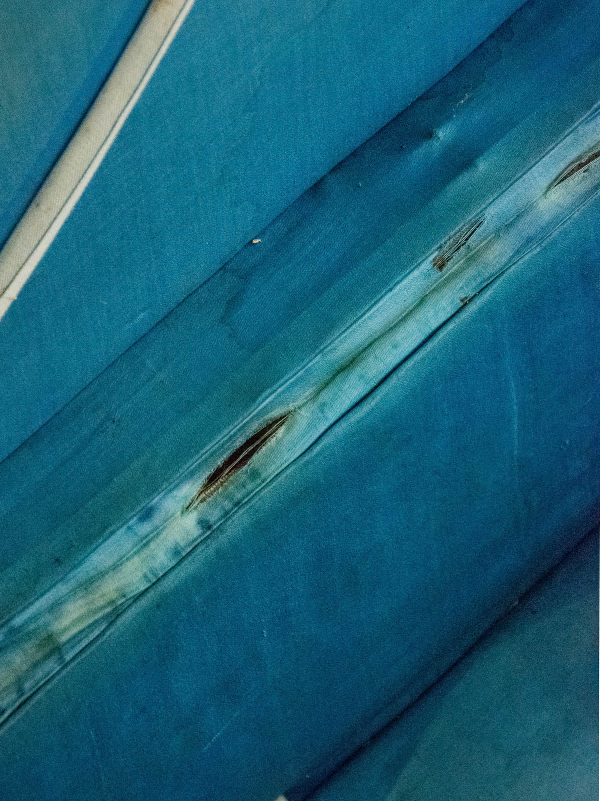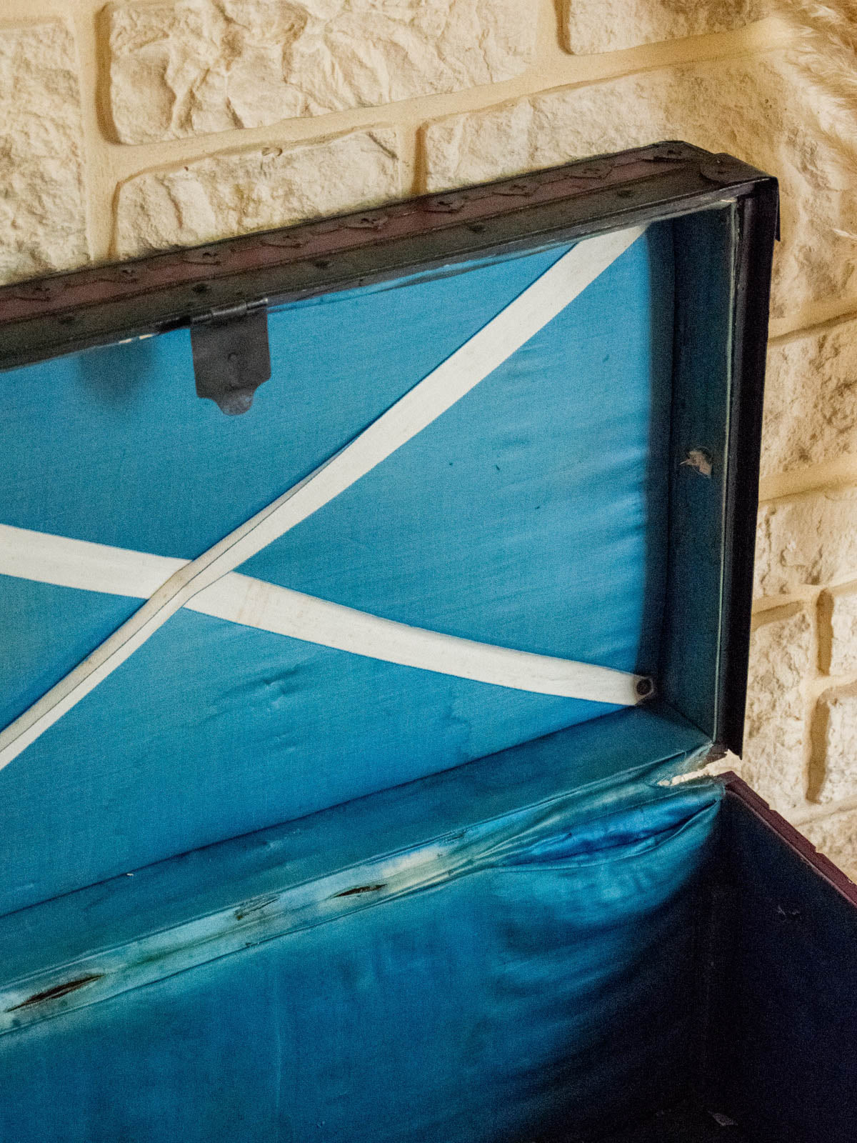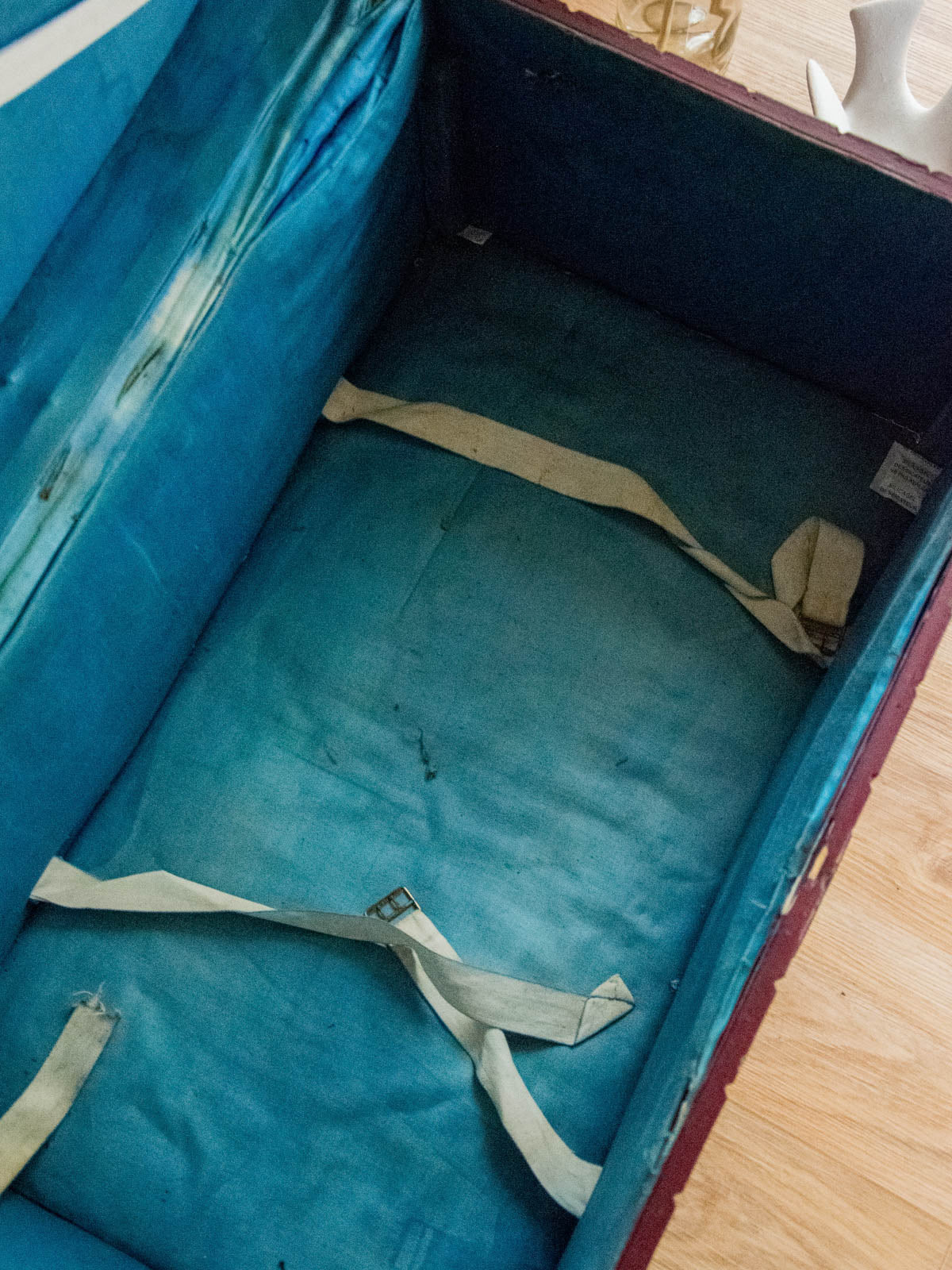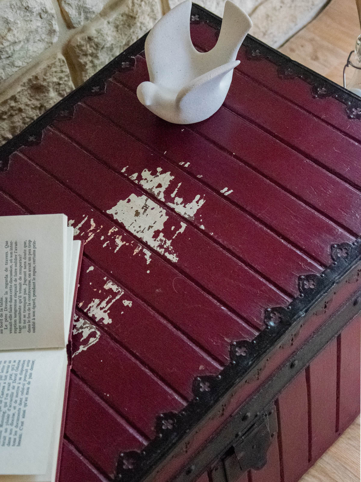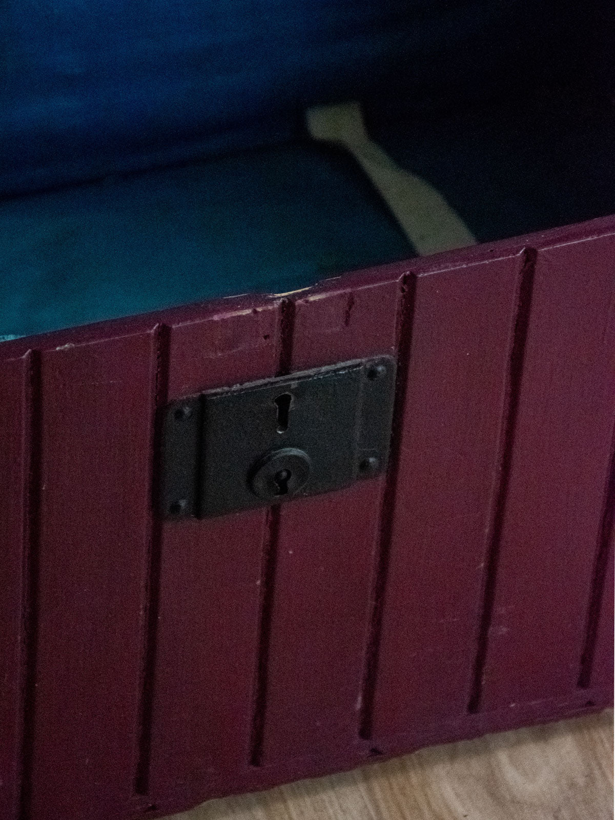 Discover this wooden chest on casters, finished in a deep burgundy accented by black metal trim for an elegant industrial look. Its two side handles make it easy to move, while the blue interior offers a striking and bright contrast, perfect for storing blankets, games, or files, and can also be used as a mobile side table. The paint on the top is scratched, revealing the undercoat and adding a touch of authentic character. Signs of age are present.