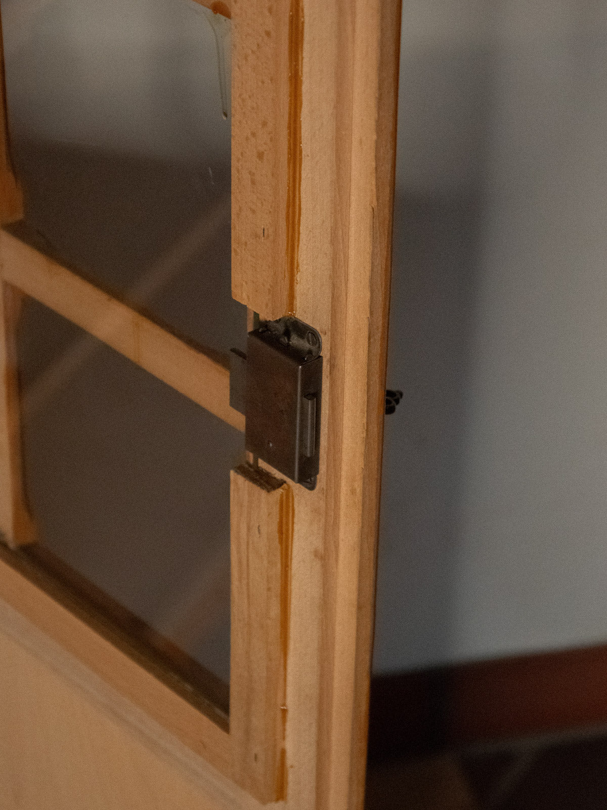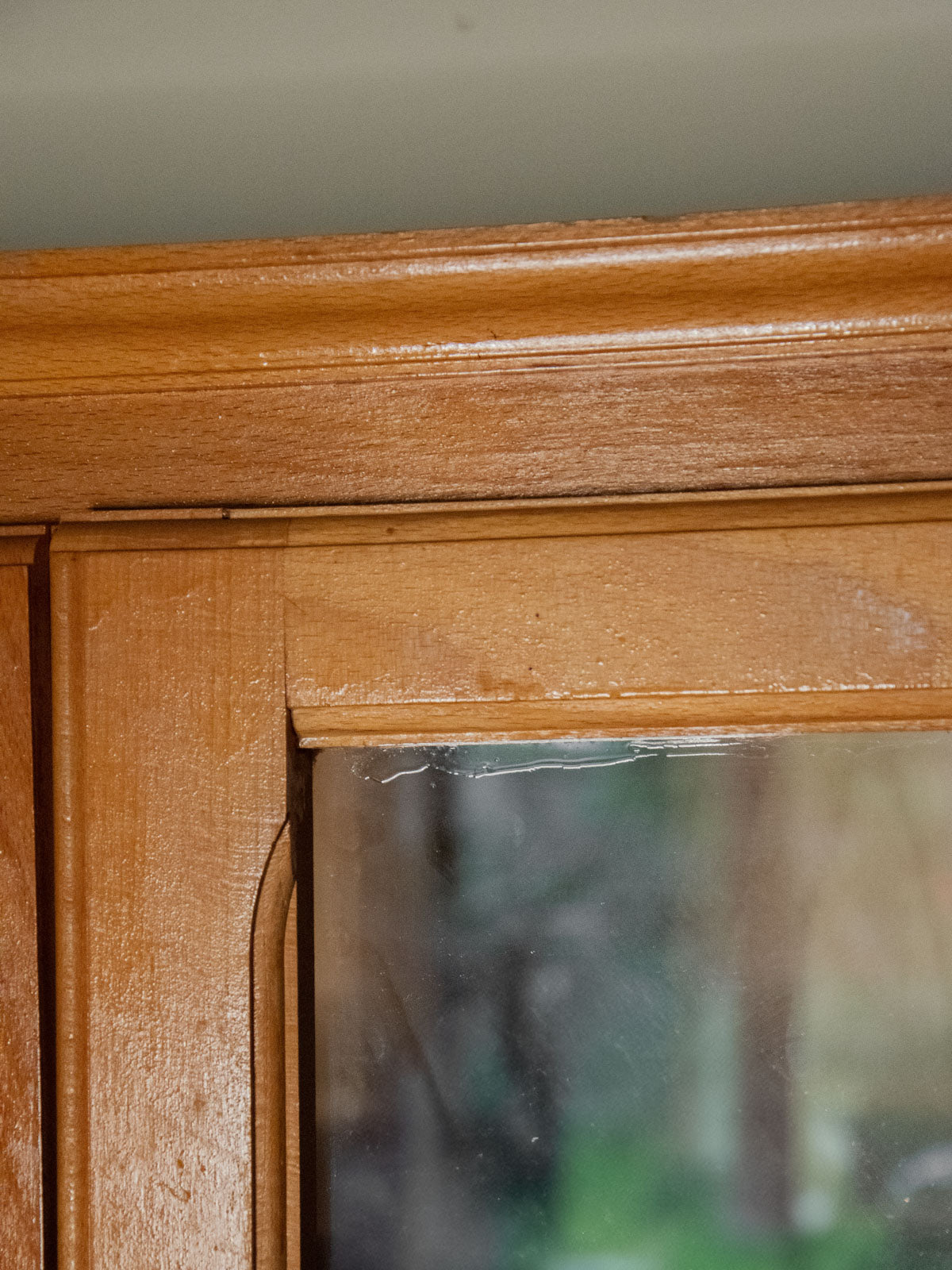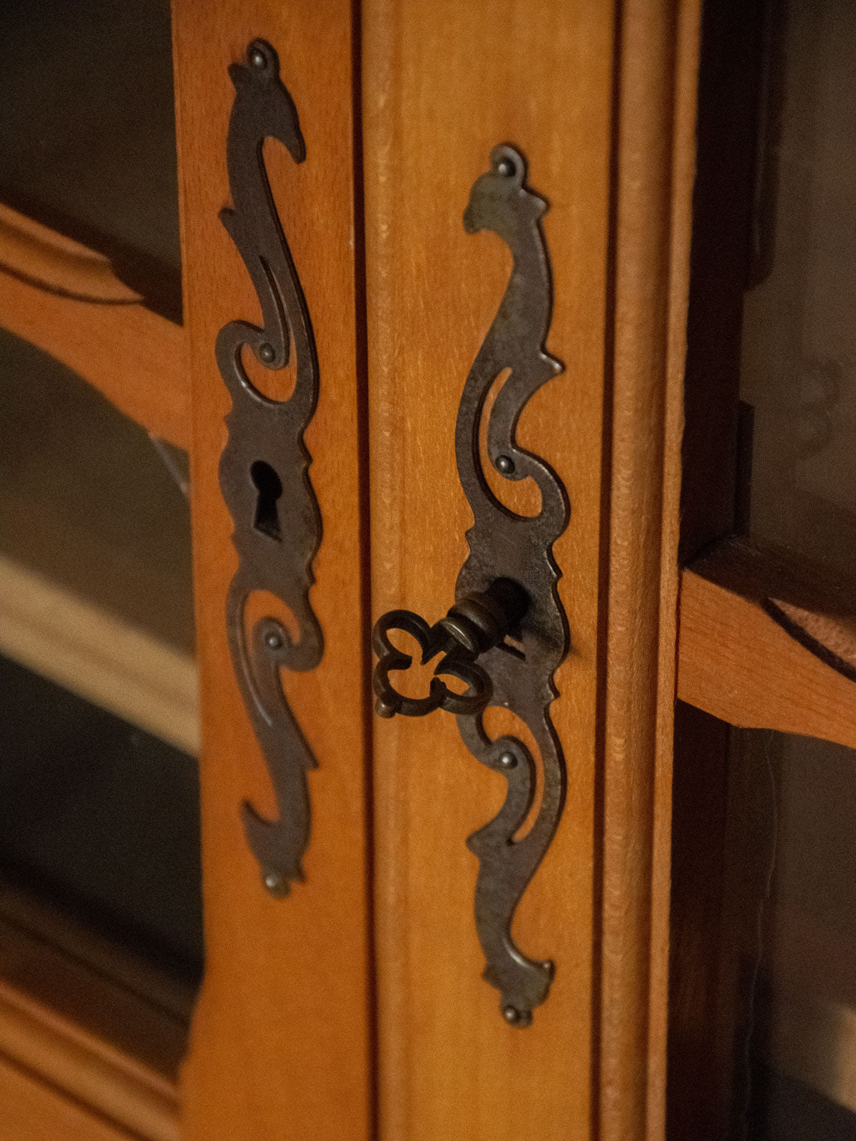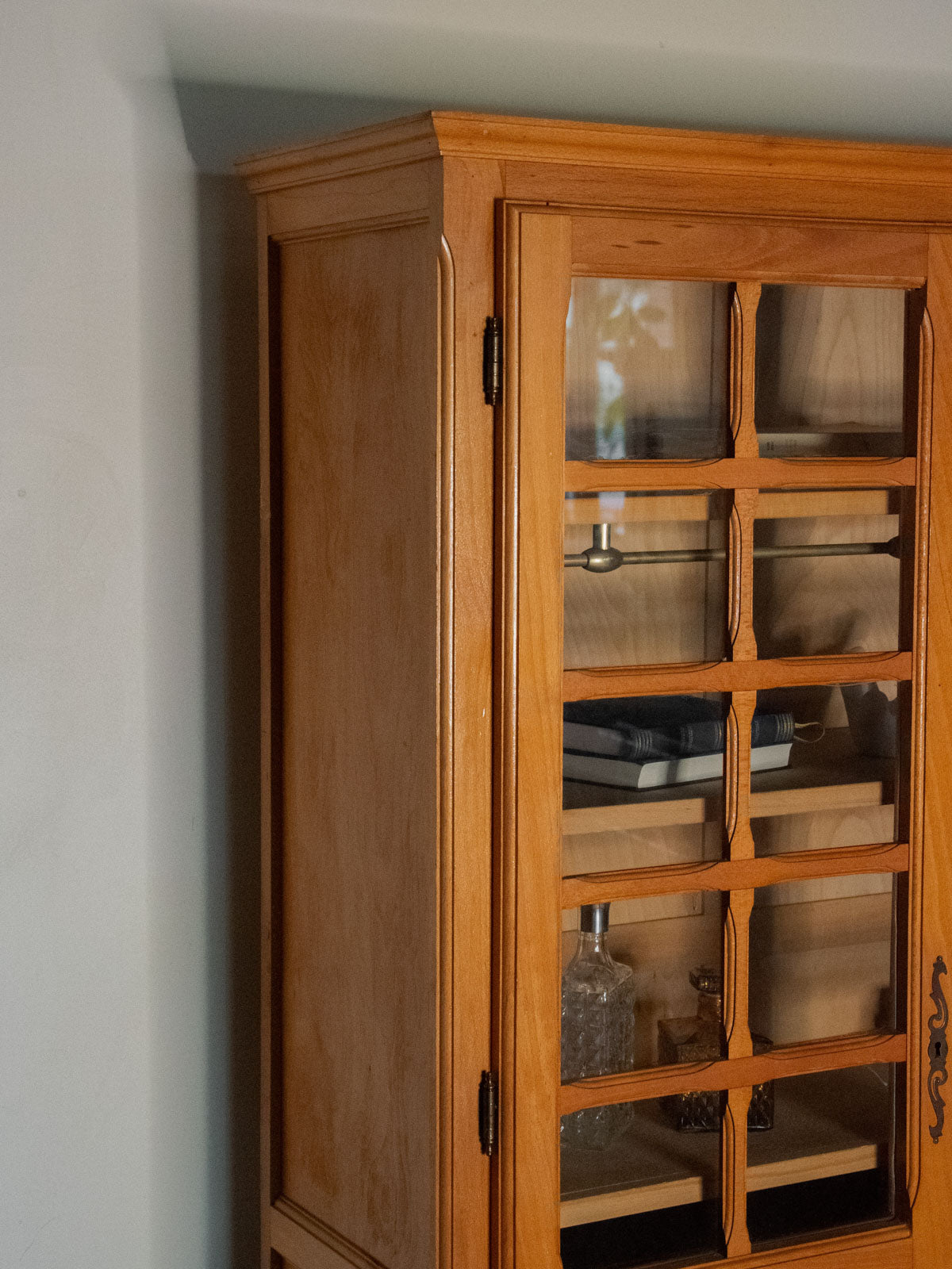 Discover this light wood glass-fronted bookcase, which blends clean lines with a warm presence. Its four adjustable shelves and two glass doors offer flexible storage for books, objects, and dishes, while the natural finish brightens a room and highlights a simple yet elegant style. With its balanced proportions, it fits perfectly in a living room or office to display and protect your collections. A few signs of wear add to its authenticity (the legs show slight wear, there's a small chip on the back right, and a paint mark).