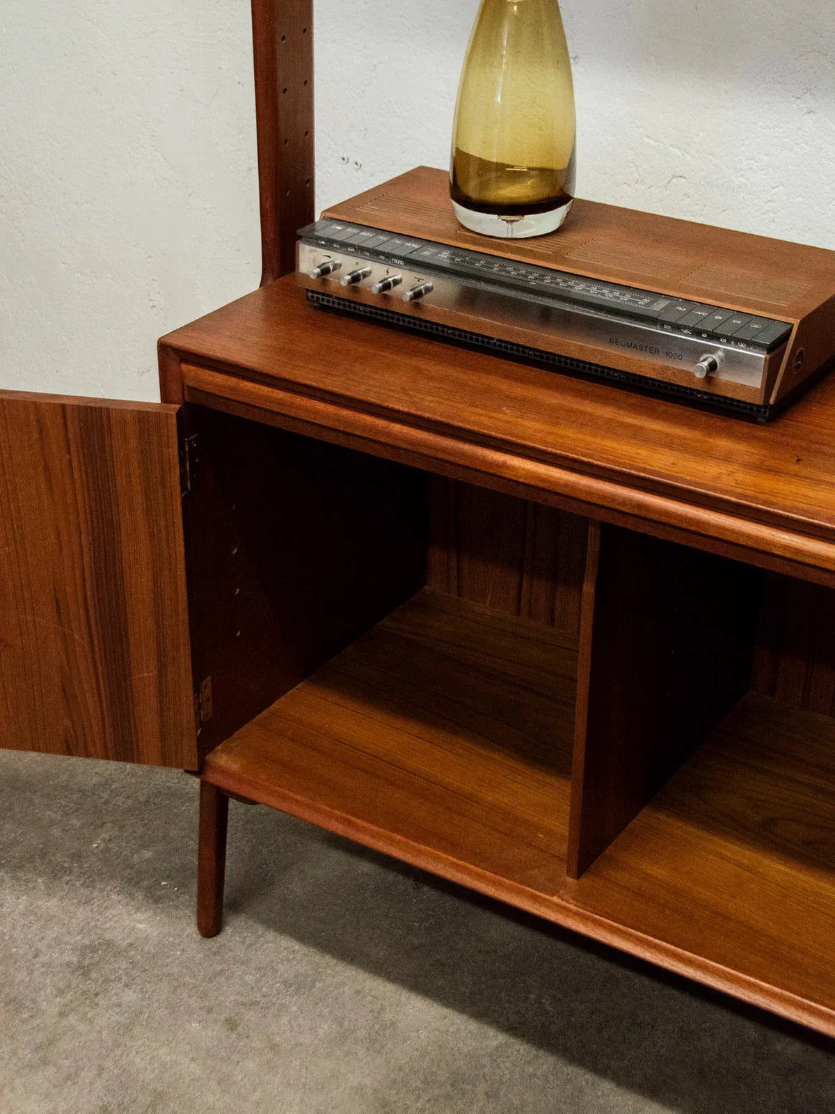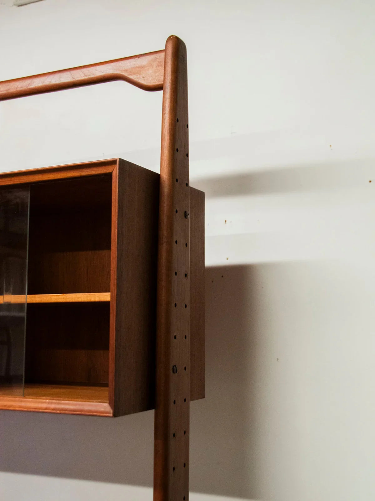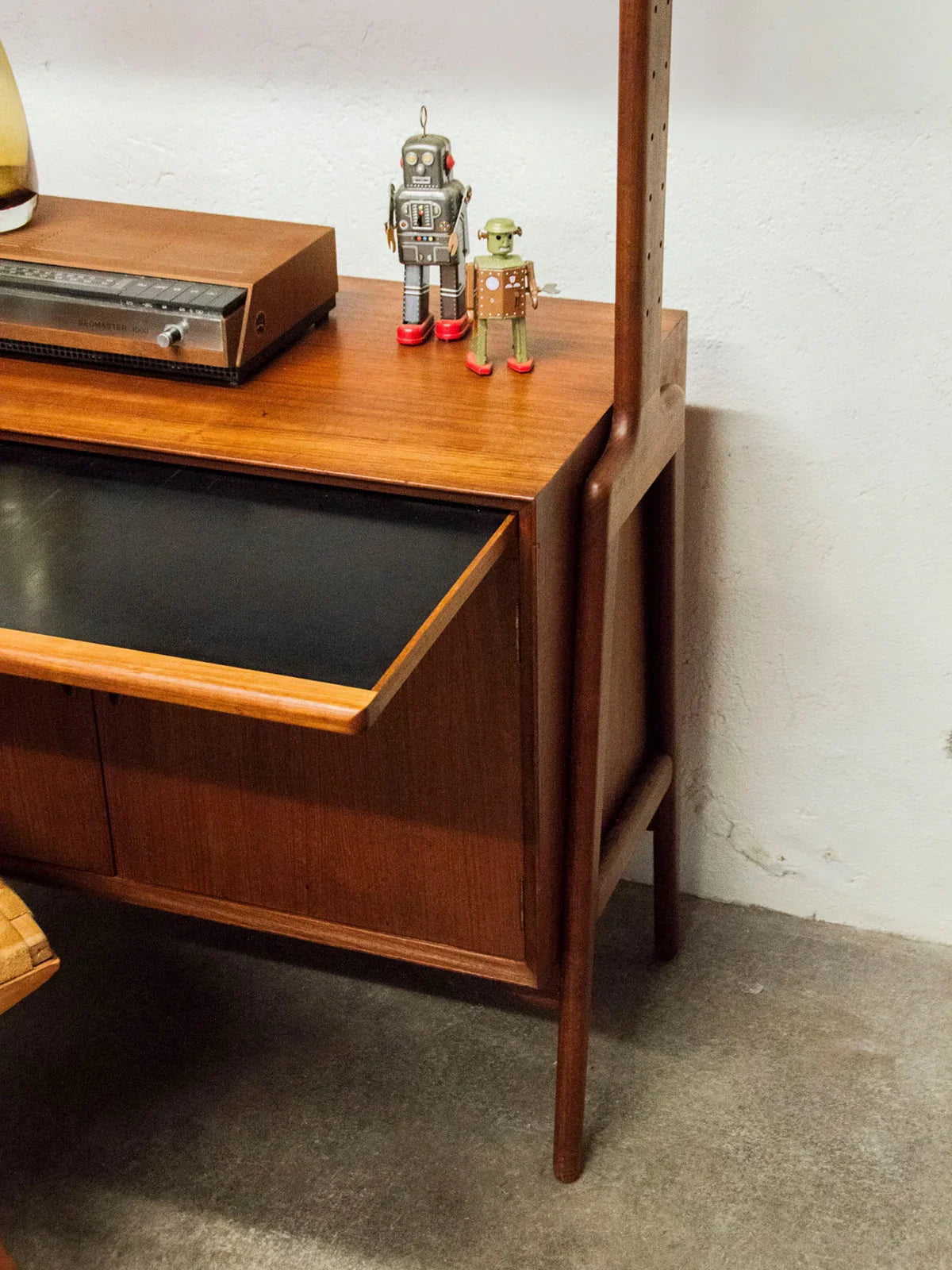 Discover this majestic modular teak bookcase, designed by Arne Hovmand Olsen for Jutex in the 1960s. With its large writing desk, it offers height-adjustable upper storage space that adapts to your needs. The lower cabinet, both elegant and functional, is ready to accommodate additional items. Additional shelves will be added to the cabinet, allowing you to personalize your space while adding a vintage touch to your interior. Bring a touch of authenticity and style to your decor with this iconic piece of furniture.