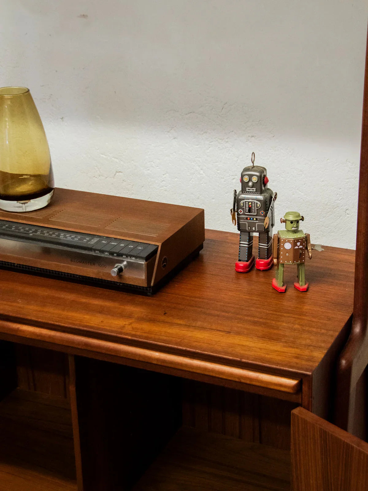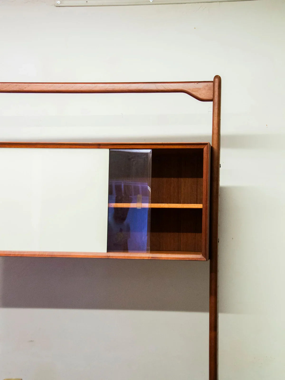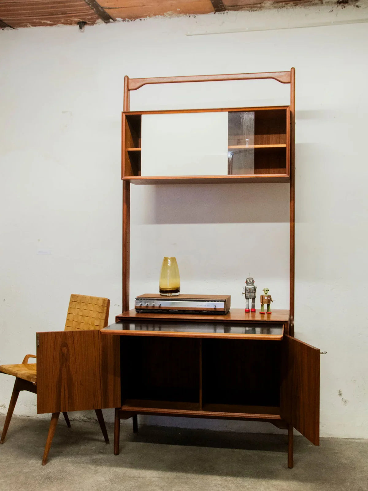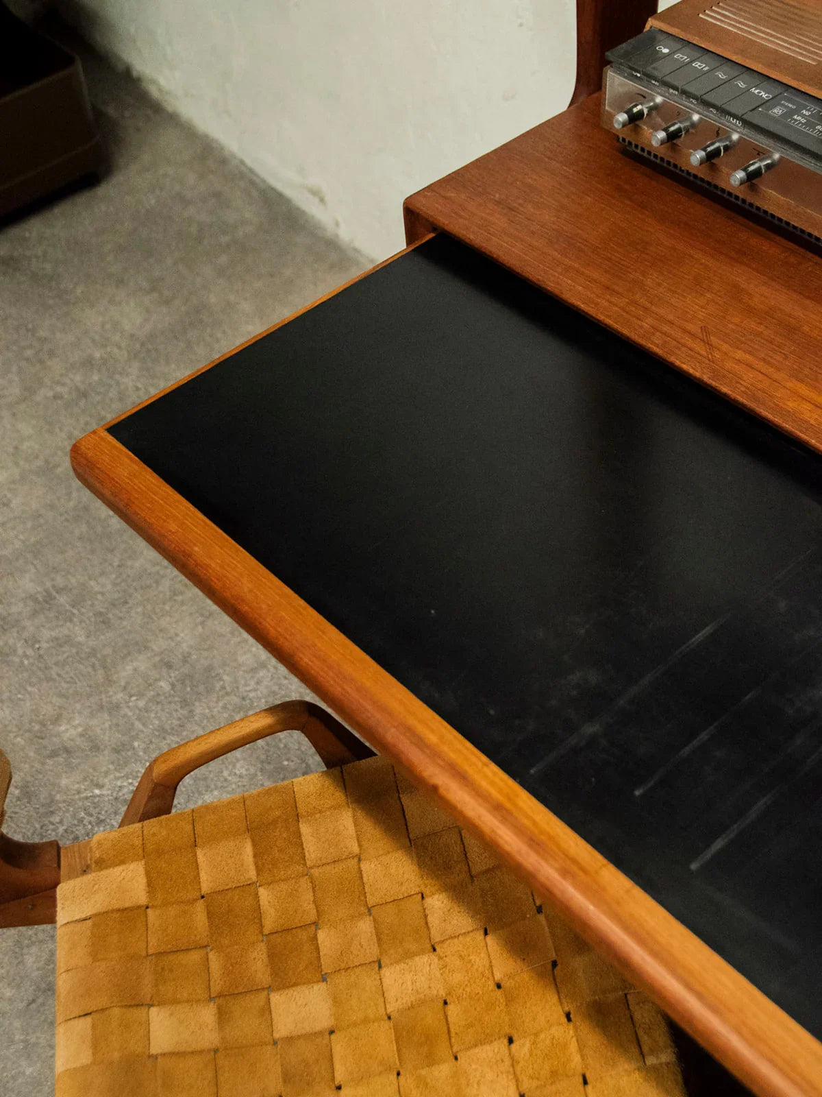 Discover this majestic modular teak bookcase, designed by Arne Hovmand Olsen for Jutex in the 1960s. With its large writing desk, it offers height-adjustable upper storage space that adapts to your needs. The lower cabinet, both elegant and functional, is ready to accommodate additional items. Additional shelves will be added to the cabinet, allowing you to personalize your space while adding a vintage touch to your interior. Bring a touch of authenticity and style to your decor with this iconic piece of furniture.