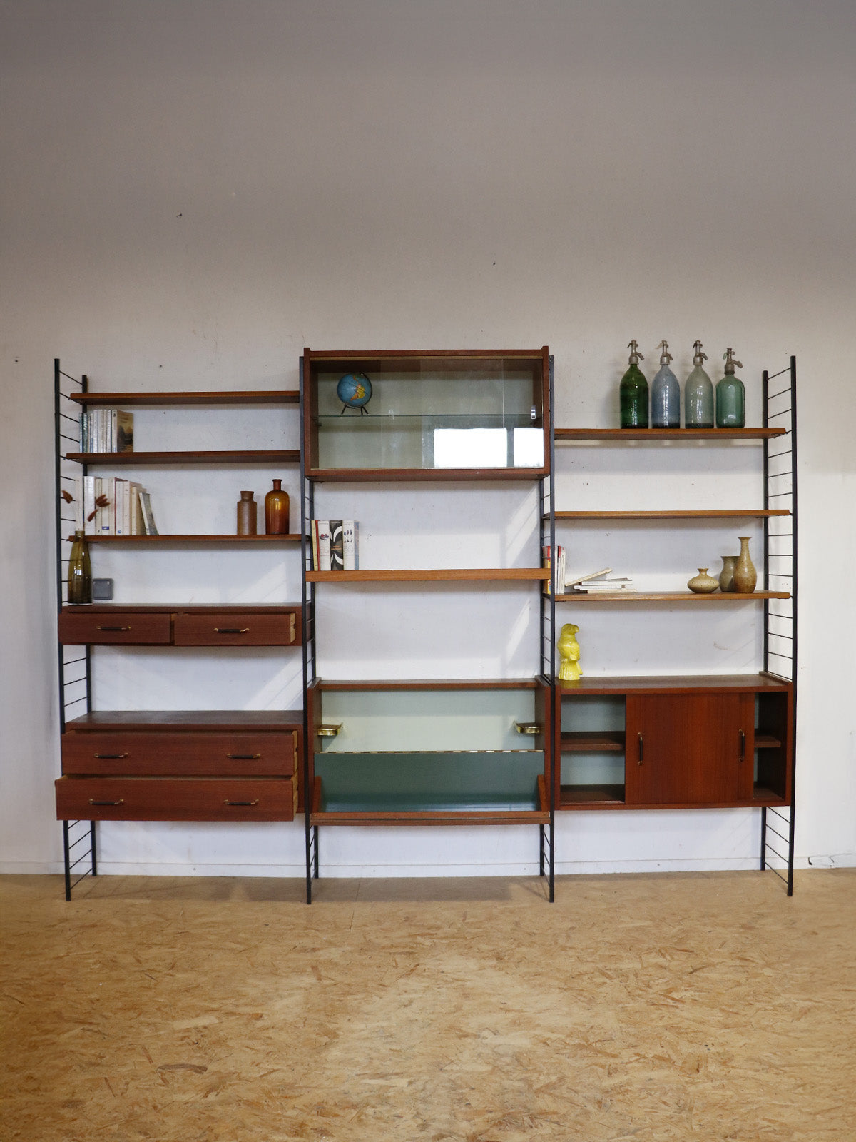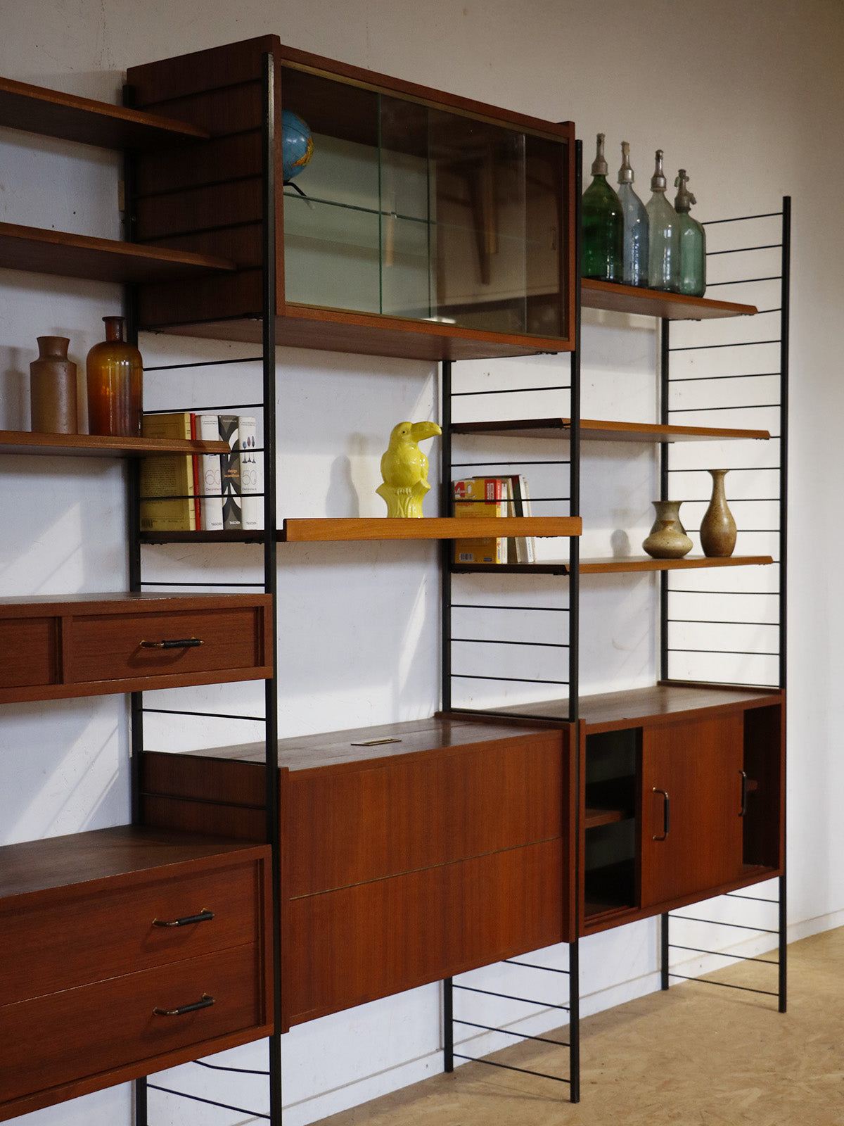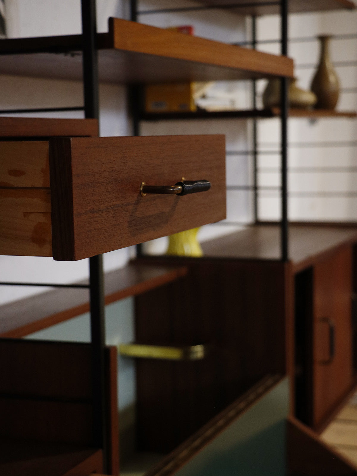 Discover this 1960s teak wall unit, punctuated by four black metal ladders and featuring retro modular lines. Comprising seven shelves, a chest of drawers, a bar, sliding doors, and a glass-fronted cabinet, it offers ample storage and display space for dishes, books, or decorative objects. Its shallow depth and elongated proportions integrate elegantly into a living room or dining room, creating a warm and organized atmosphere.